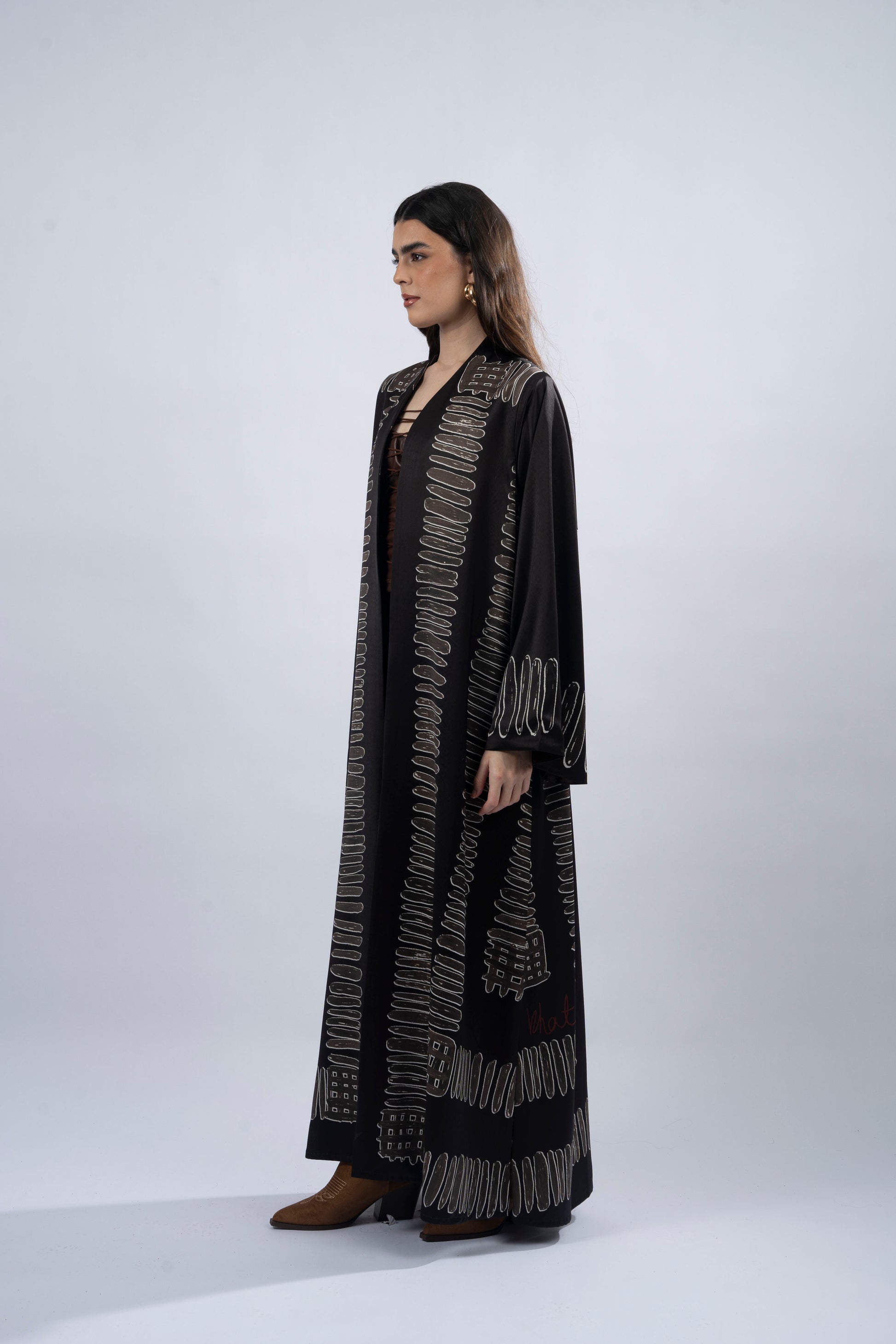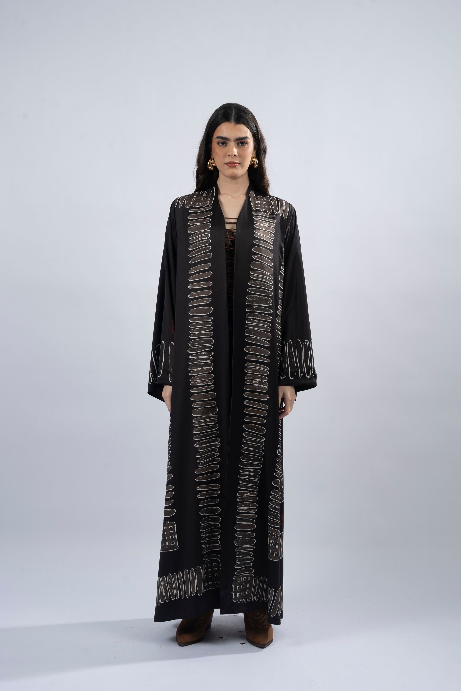Aponi, meaning 'butterfly' in Native American, celebrates the beauty of transformation and renewal. This printed abaya reflects the delicate elegance of nature’s wonders, with its intricate patterns that symbolize grace and rebirth. Crafted from luxurious silk fabric, it features a straight cut, side slits, and is complemented by a matching printed chiffon headscarf. Aponi embodies the soft beauty of life’s changes, perfect for women who embrace their natural strength and the evolving beauty around them.