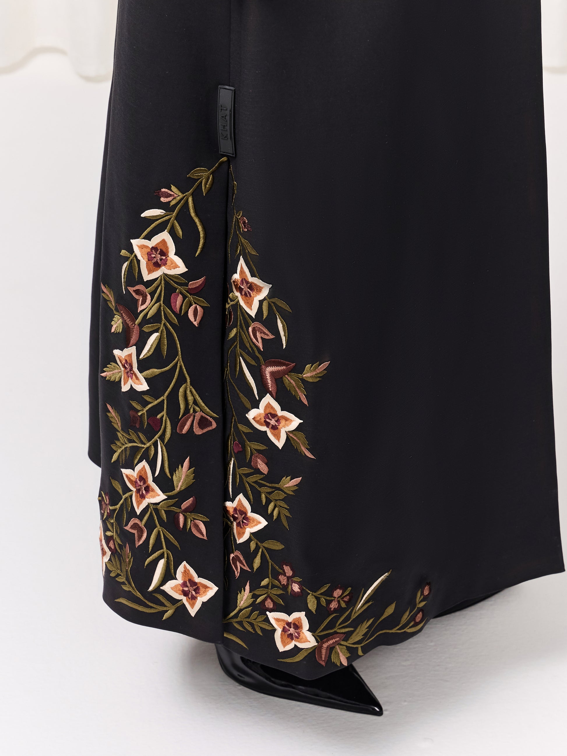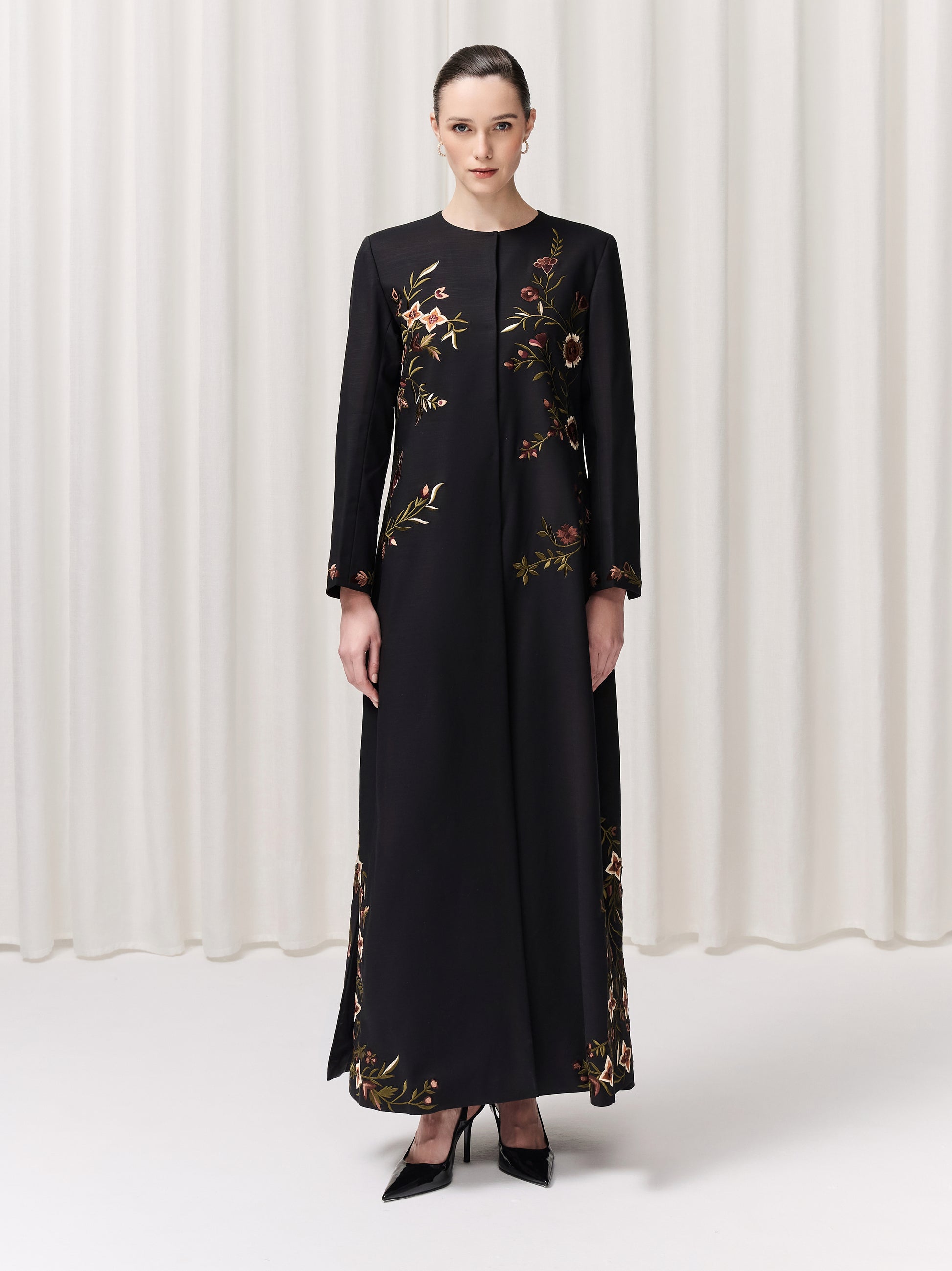 A refined round-neck abaya featuring intricate, original floral embroidery that graces the sleeves and lower slits. This elegant detailing brings a fresh, elevated touch to a classic silhouette. Effortlessly graceful and timeless, the Aurora Abaya is beautifully paired with its matching sheila for a complete, polished look.
