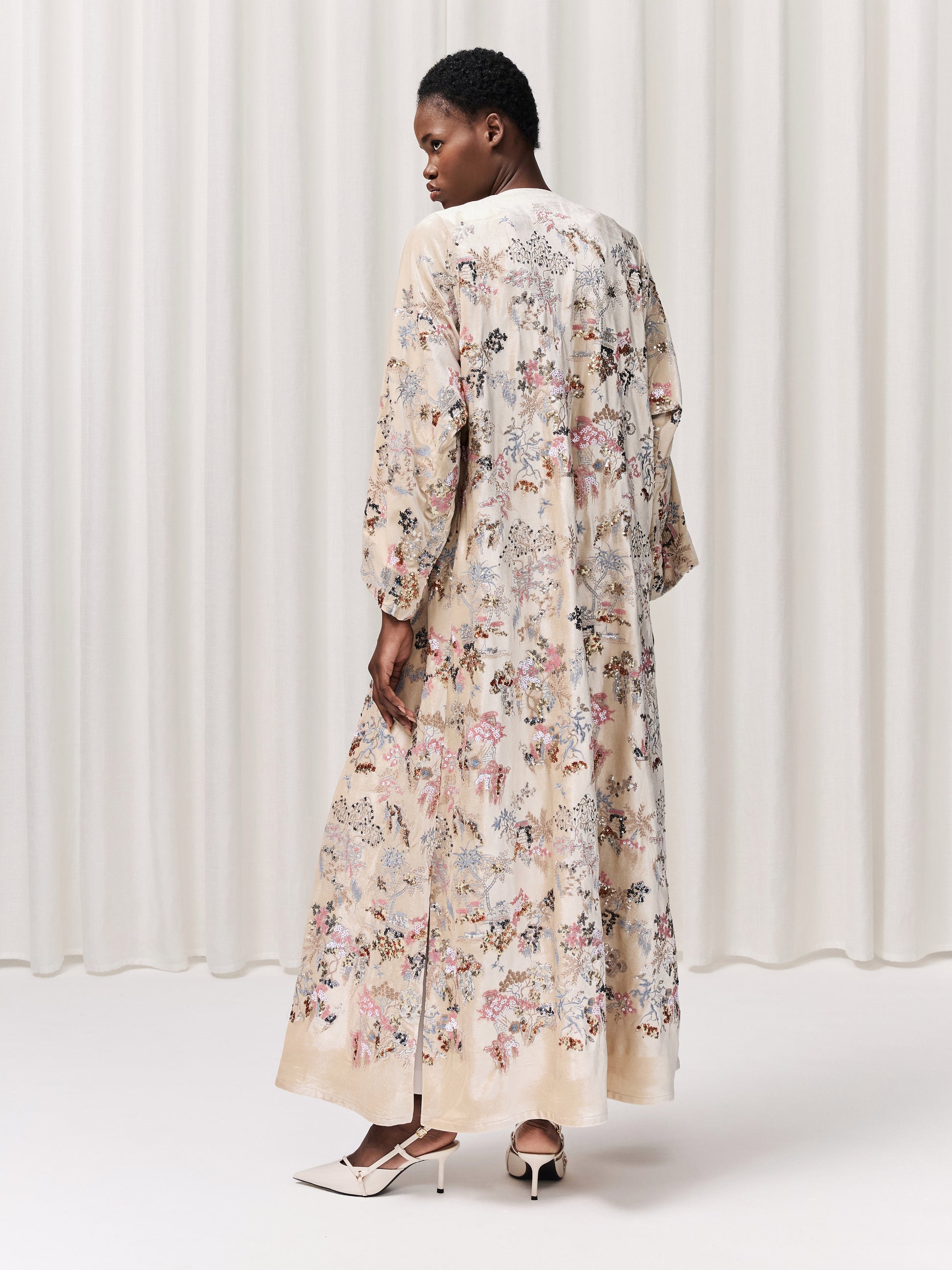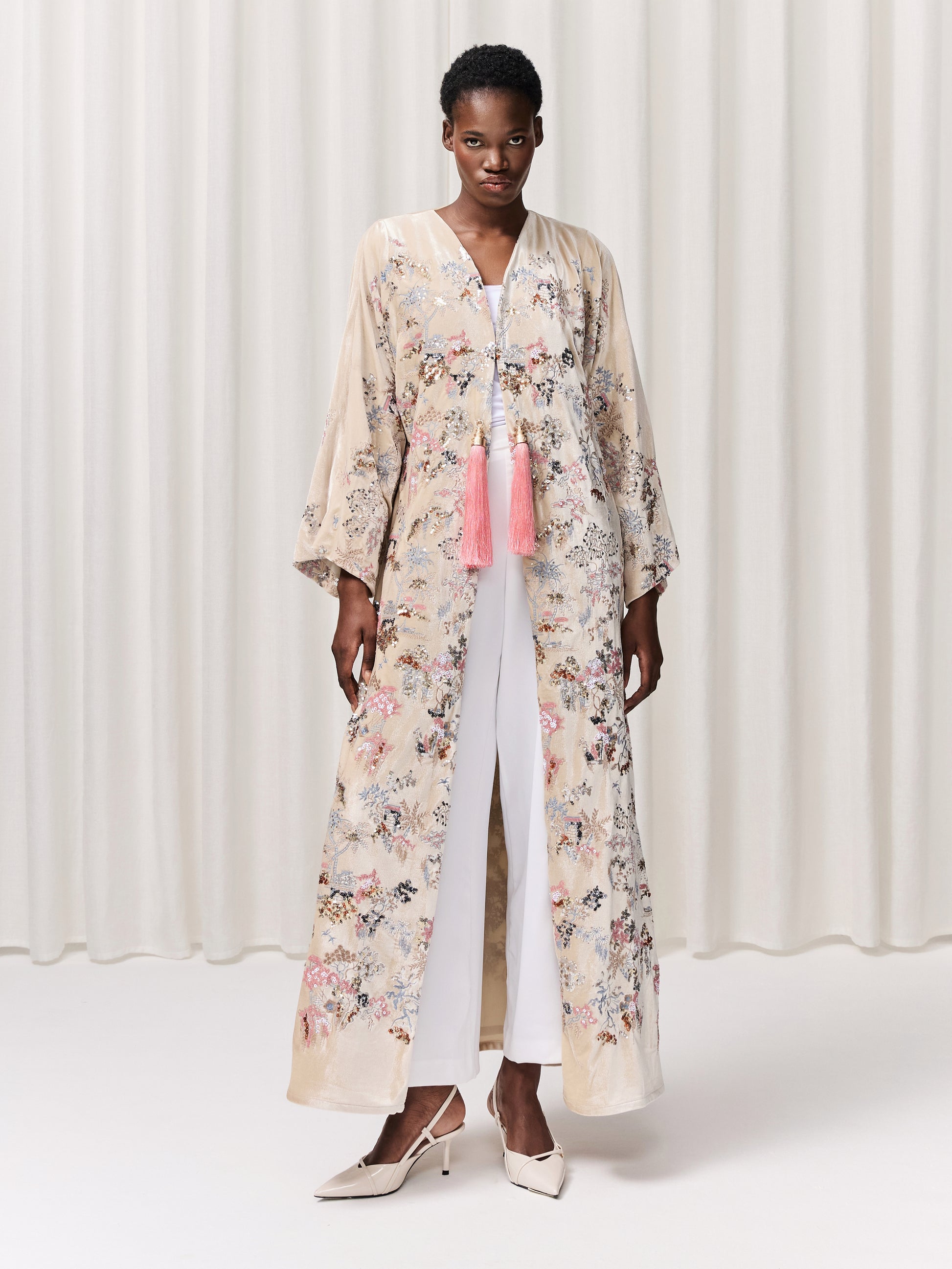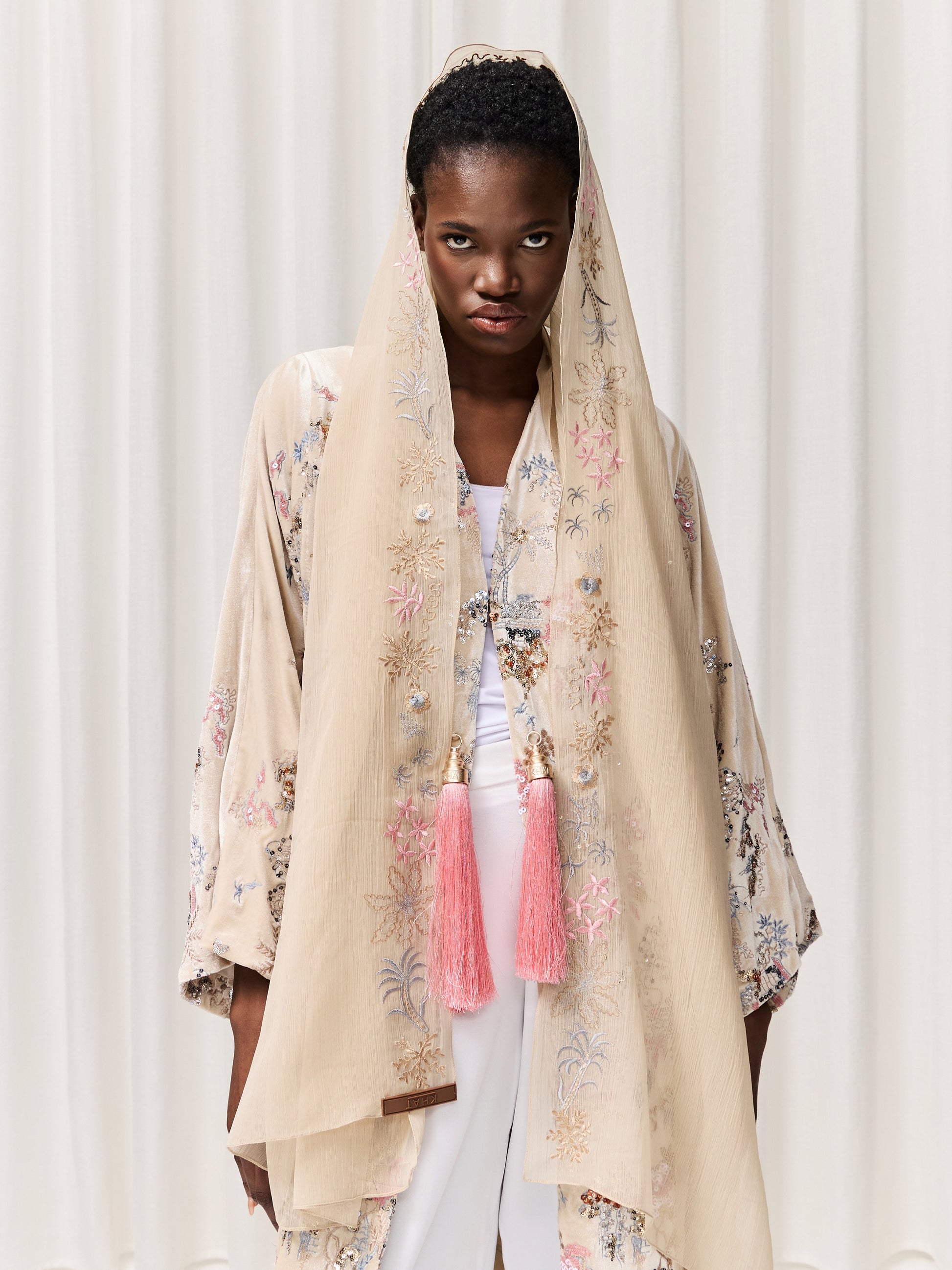 Soft, graceful, and undeniably feminine, the Blush abaya is crafted from luxurious velvet and adorned with delicate blush pink floral embroidery, reminiscent of blooming cherry blossoms. Designed in a relaxed silhouette with two leg slits, it features two front tassels finished with the KHAT logo, adding a subtle touch of signature detail. Paired with