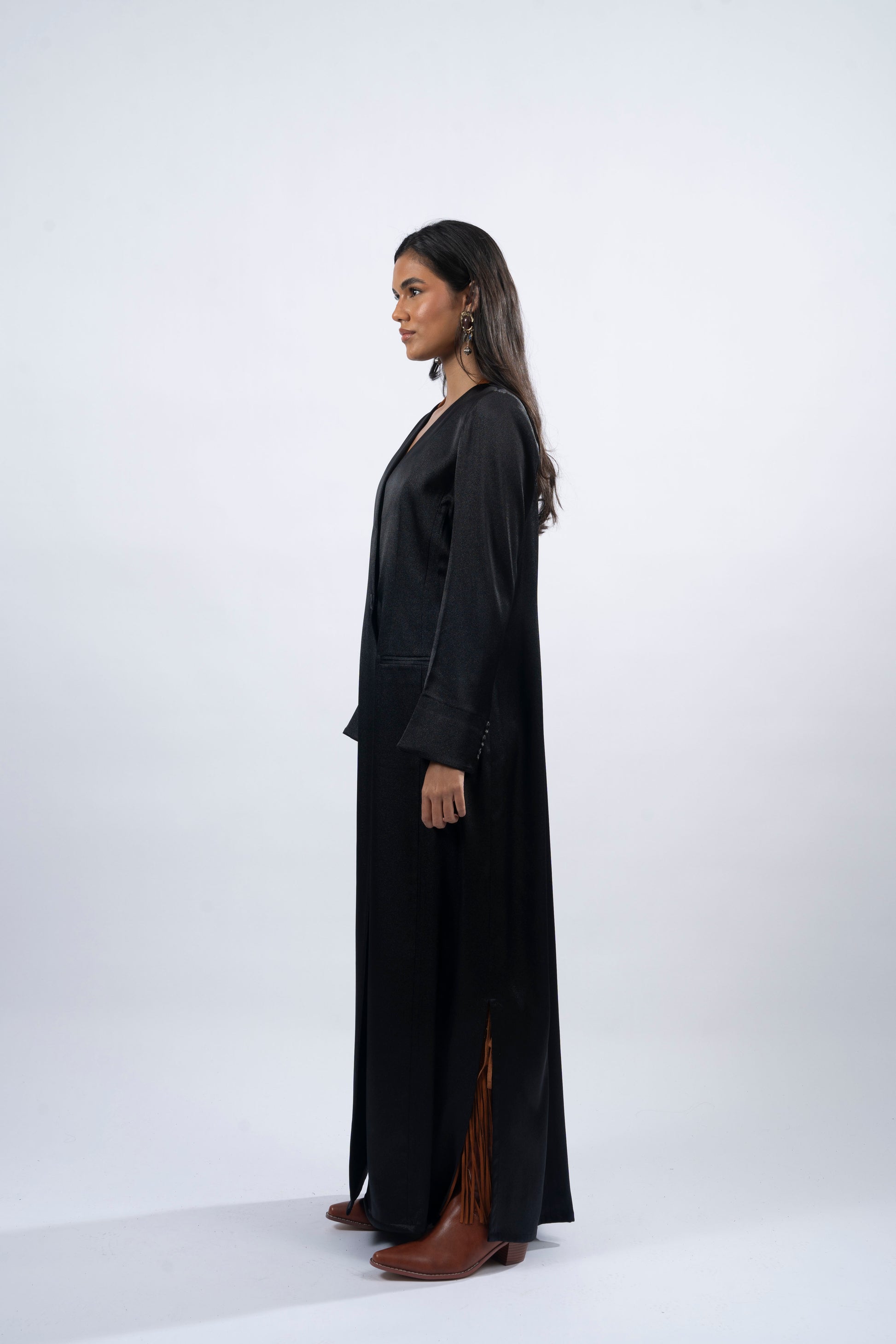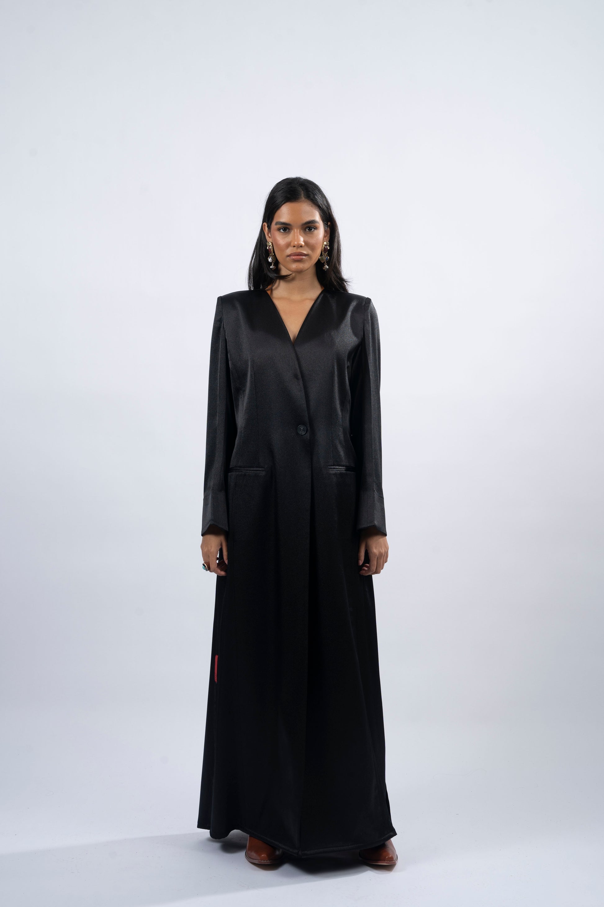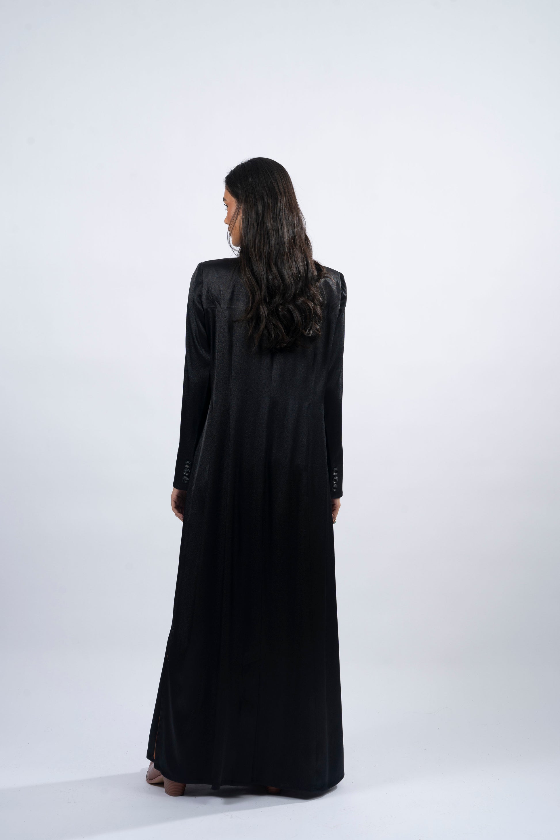 Camilly, meaning 'perfect,' captures the essence of modern femininity with a timeless twist. Crafted from black shimmer silk, this A-cut abaya exudes understated elegance and effortless charm. The shoulder pads, side slits, and pockets add functional sophistication, while the logo buttons complete the look. Perfect for any occasion, Camilly embraces both strength and grace in its flowing silhouette.