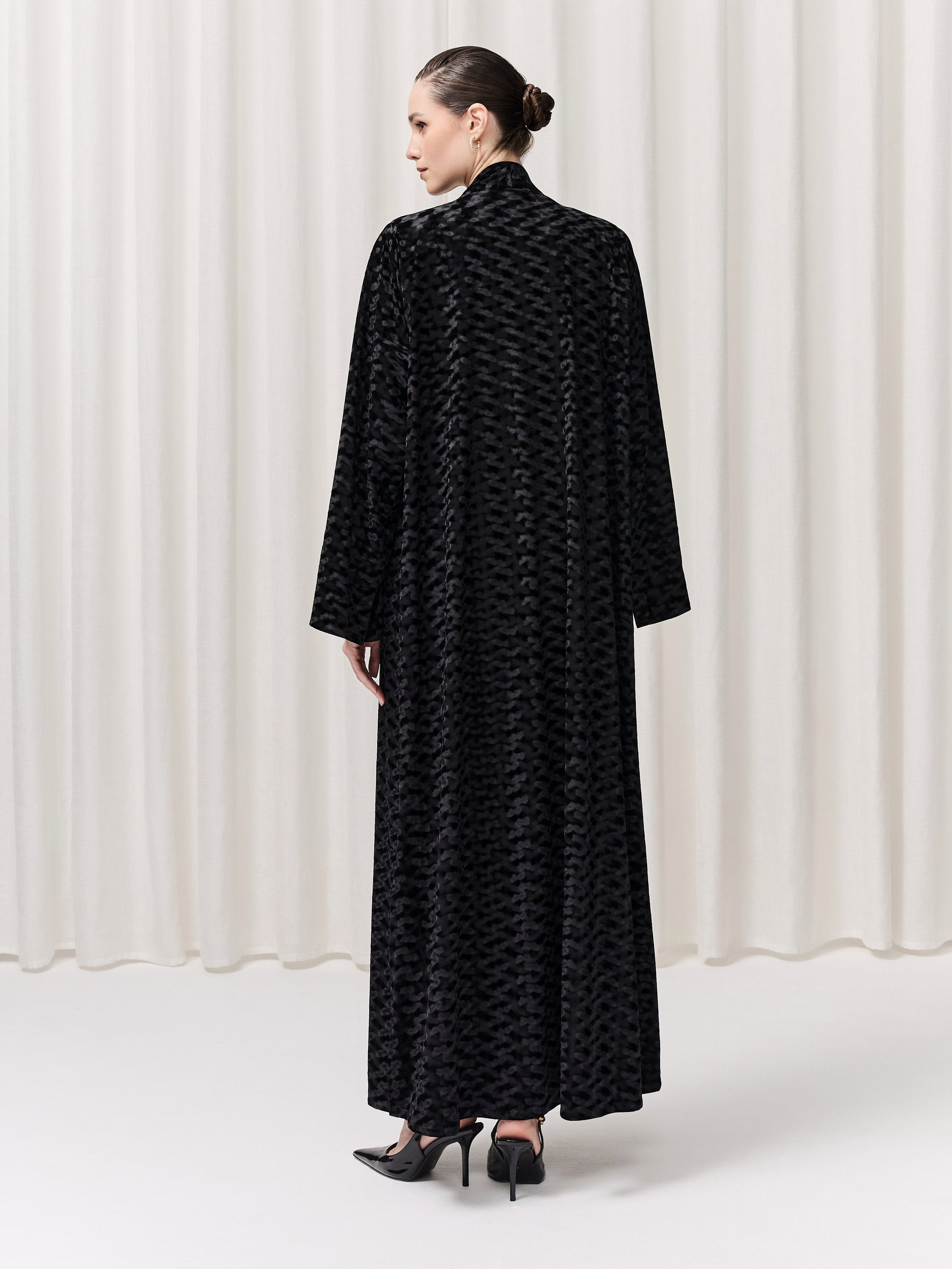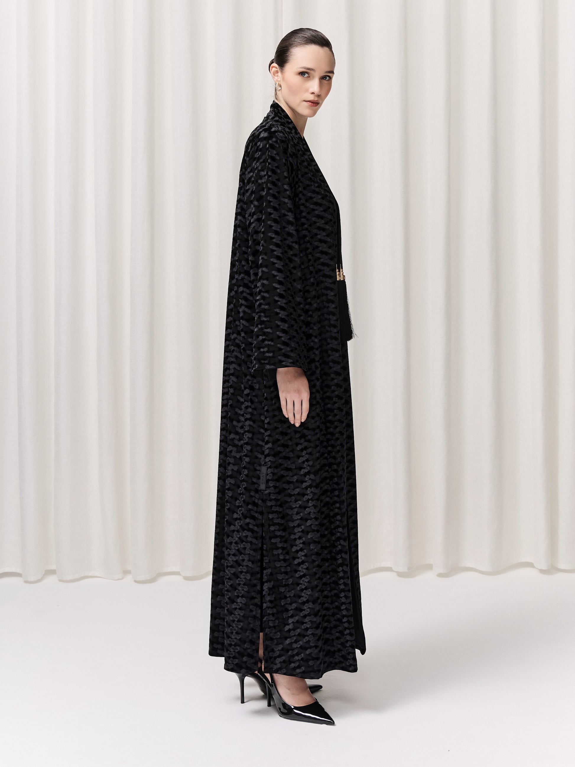 Cecilia is crafted from uniquely textured black velvet that shimmers beautifully with every movement, this relaxed abaya is designed to make a statement. Two front tassels, engraved with the KHAT logo, tie gracefully at the front - a subtle yet distinctive detail. This abaya has two leg slits for movement. Effortless and confident, this abaya is paired with a matching sheila for a complete look. Available in three captivating colourways: Ophelia, a striking white and Roselia, a warm brown.
