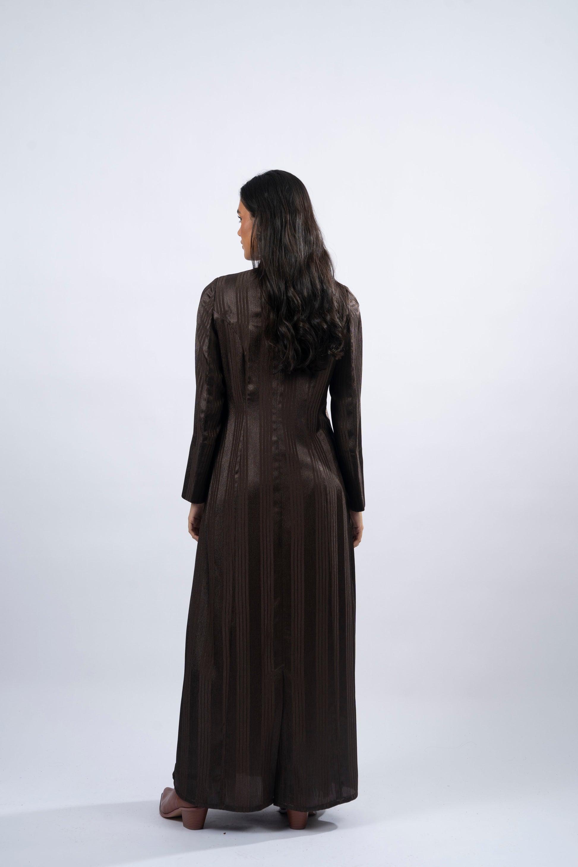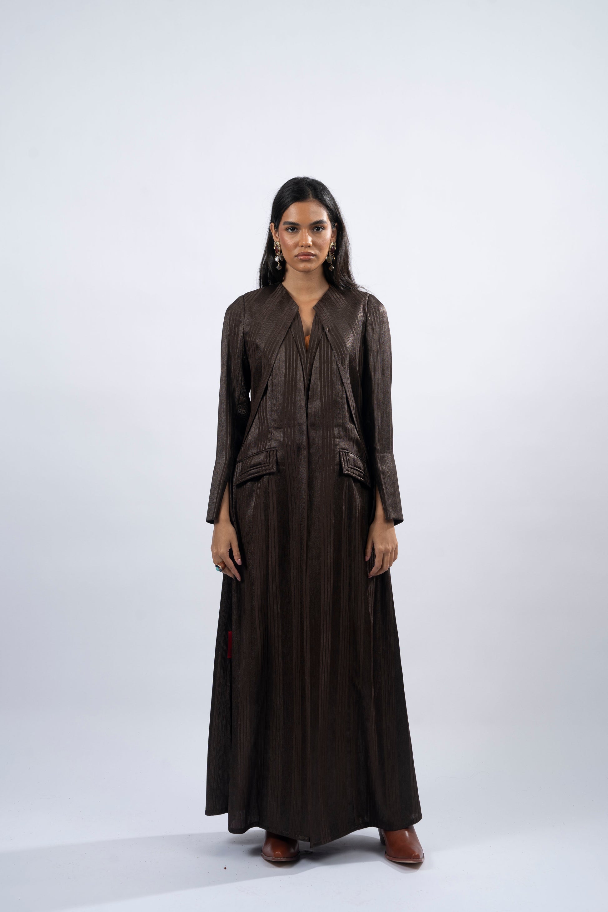 Dalia, like a flower blooming at dawn, offers softness and feminine charm to its wearer. Crafted from brown silk fabric, the A-cut design is adorned with a subtle pattern of lines that add a sense of movement and texture to the piece. The side slits, shoulder pads, and padded pockets provide both comfort and practicality. Dalia's flowing silhouette and delicate design reflect quiet strength and timeless beauty, making it the perfect addition to any wardrobe for those who embrace elegance with grace.