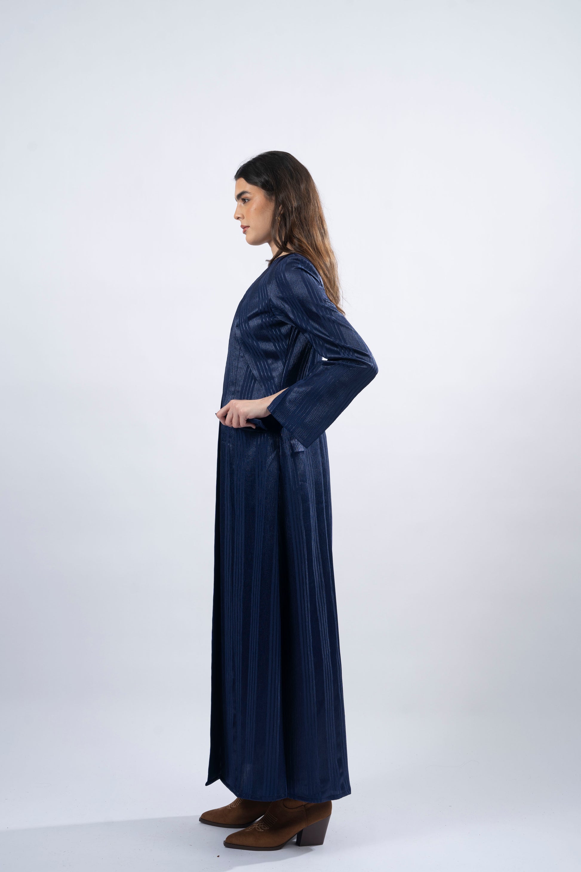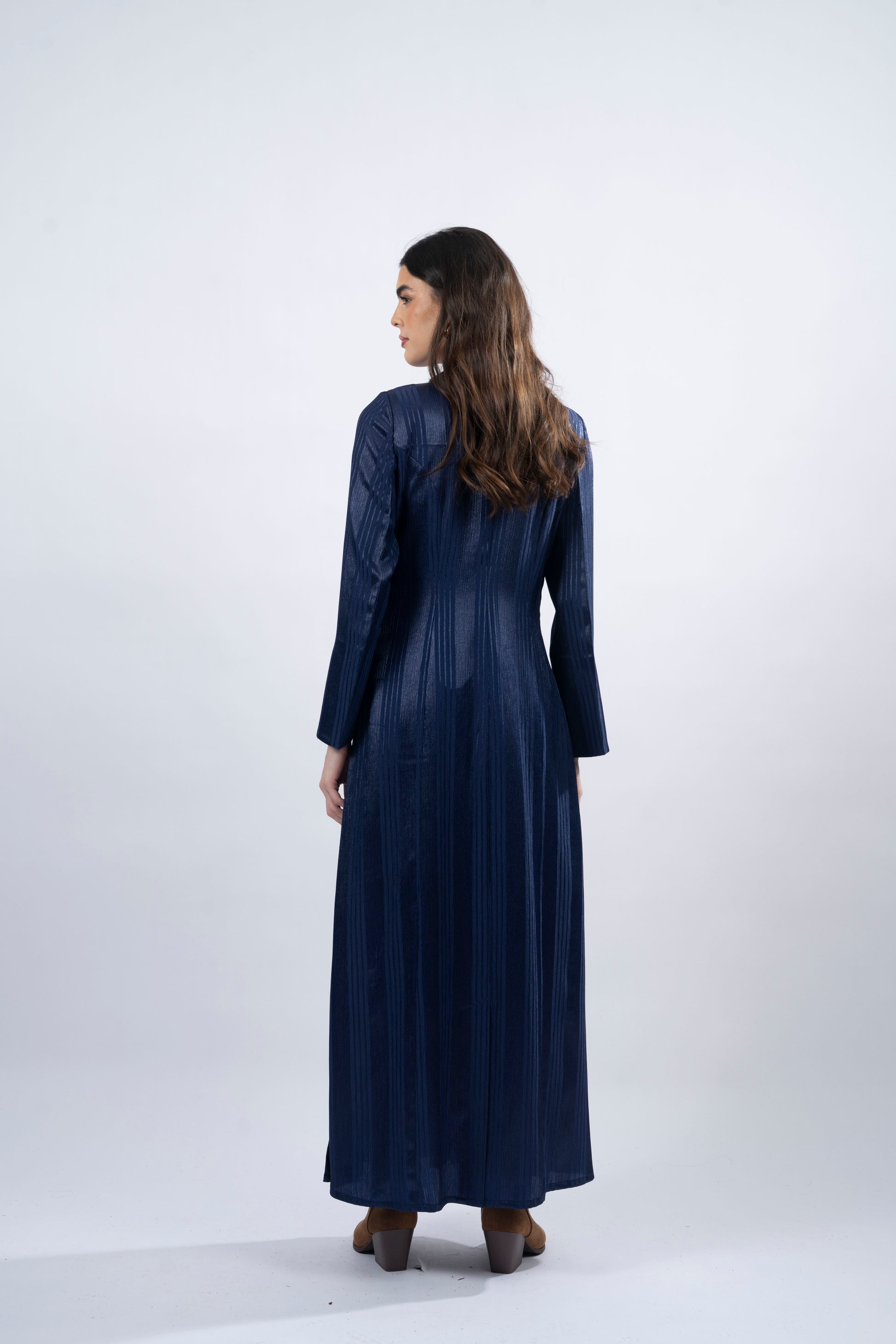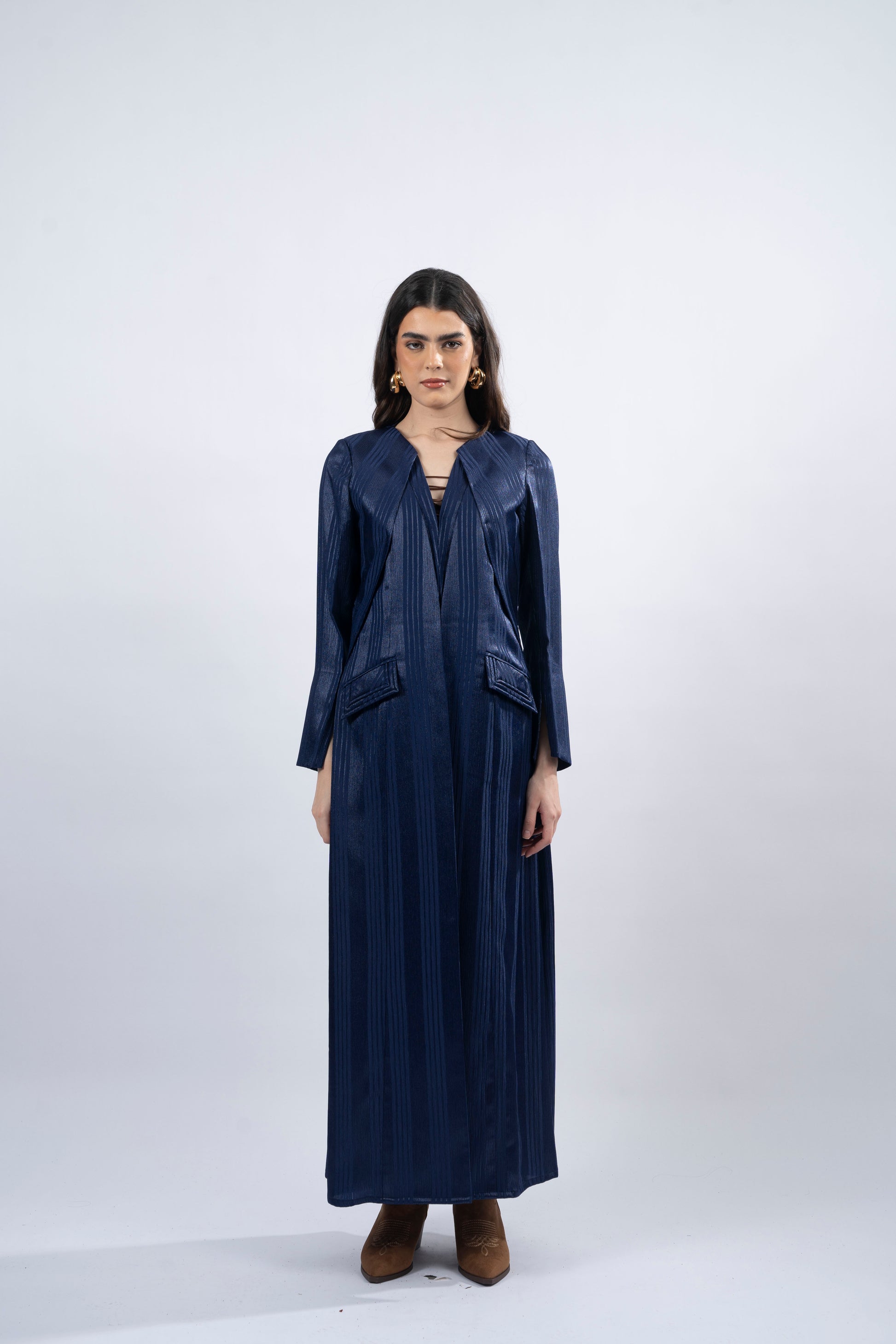 Doli, meaning 'bluebird,' represents joy and renewal, capturing the spirit of freedom and optimism. Crafted from blue silk fabric, its A-cut design features a subtle pattern of lines that gracefully flow across the fabric, evoking a sense of lightness and movement. The side slits, shoulder pads, and padded pockets ensure both comfort and style. Doli is a tribute to the small joys that shape life’s biggest moments, making it the perfect choice for those who embrace the beauty of simplicity and joy in every step.