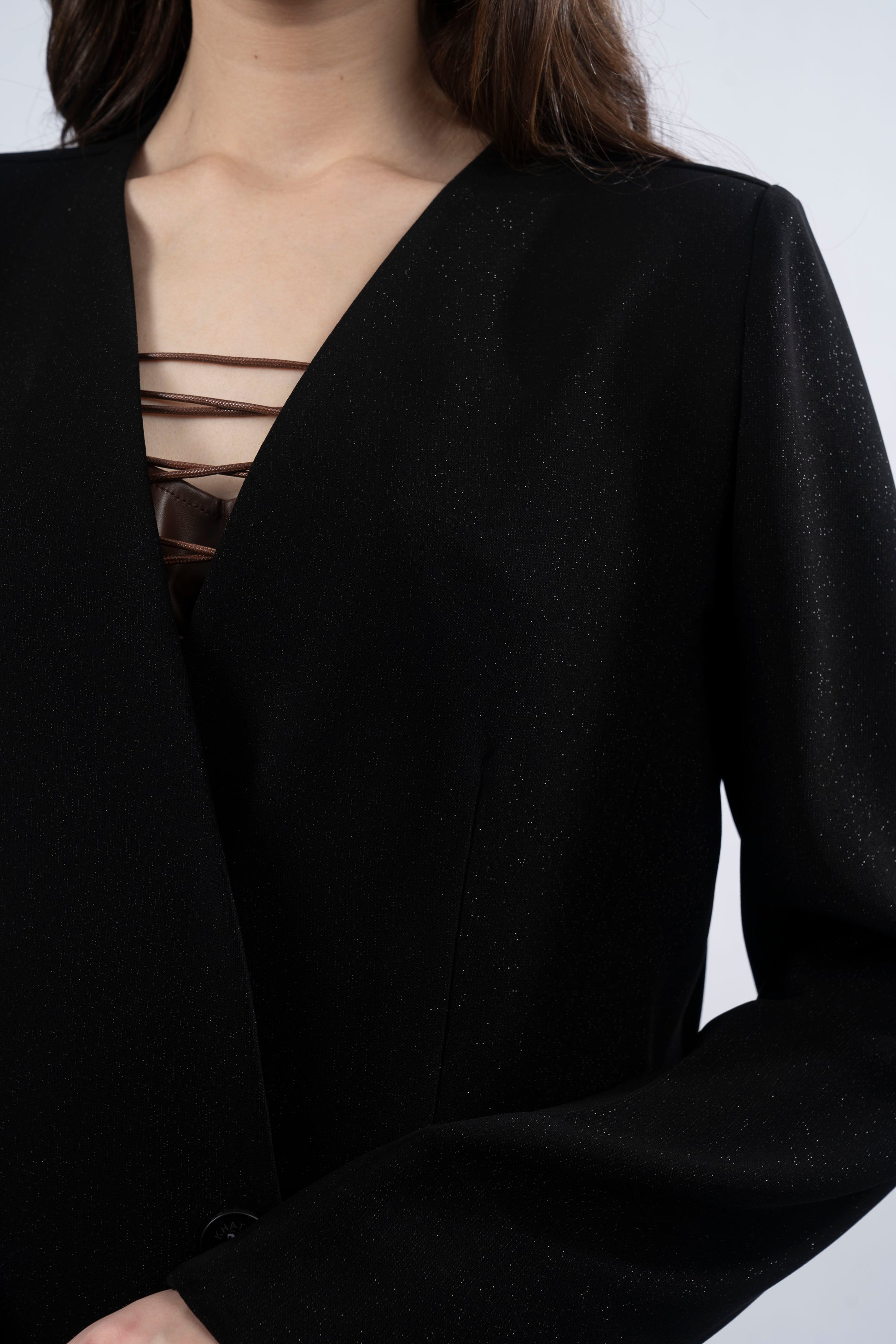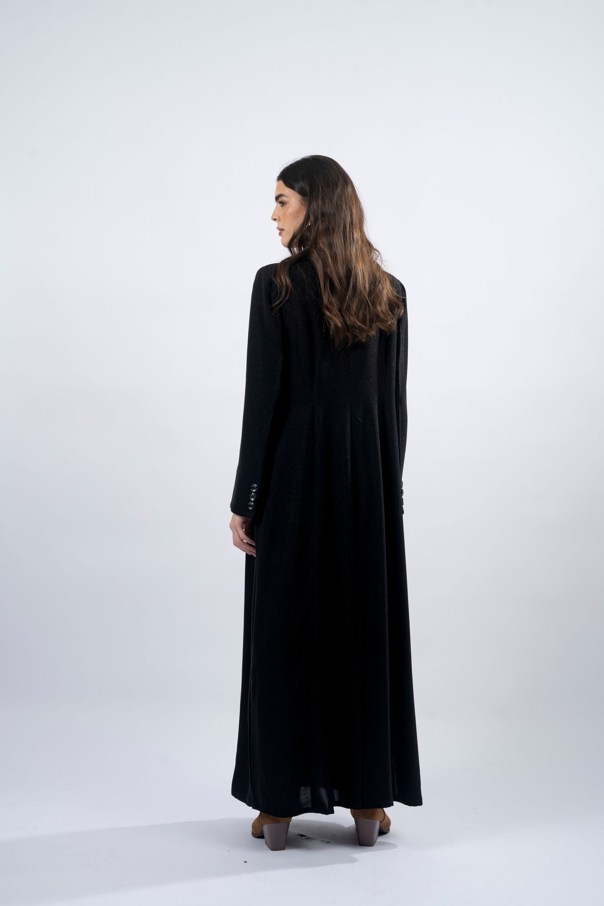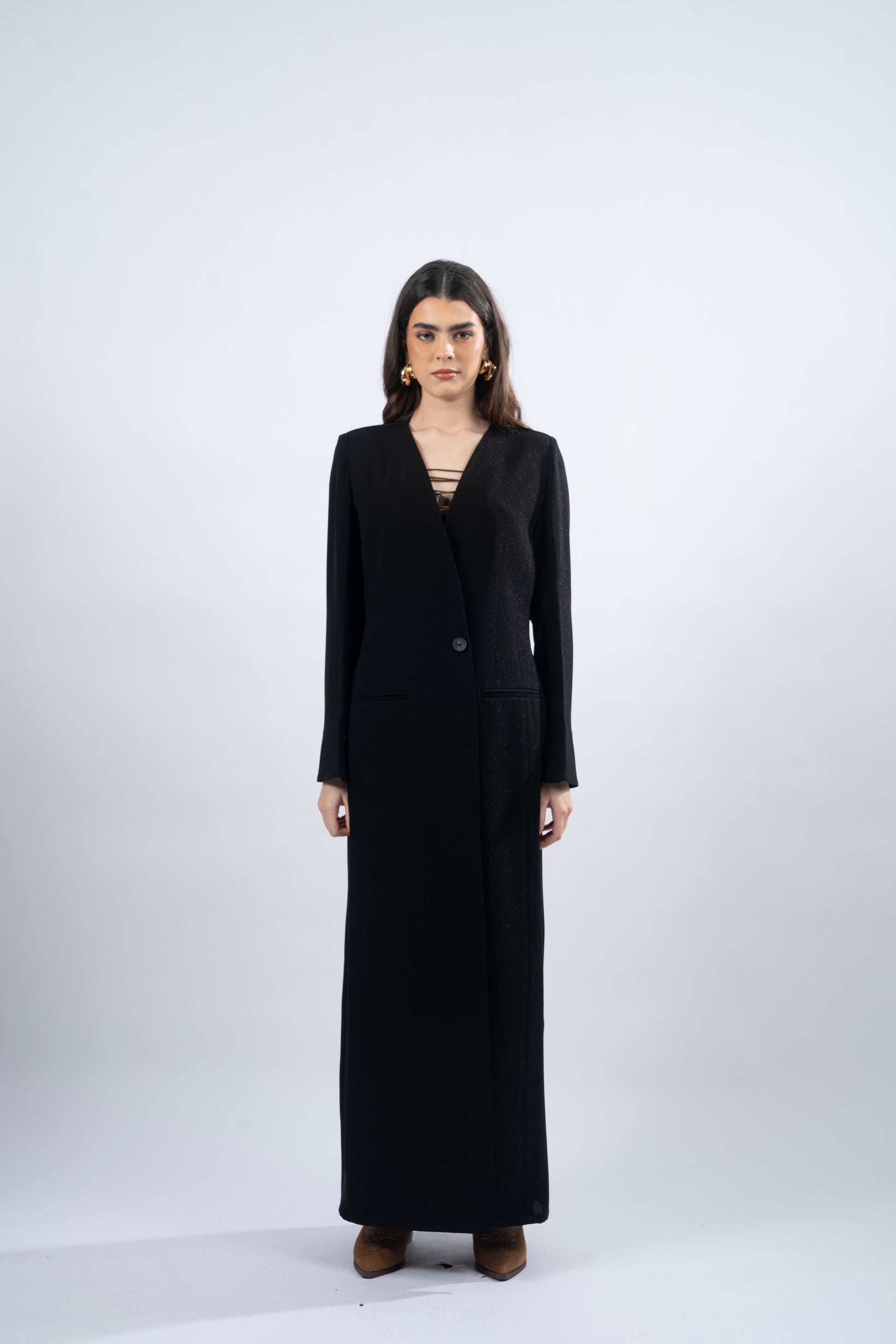Dune, crafted from black shimmer crepe fabric, embodies the desert's starry night with its subtle glitter and refined elegance. The A-cut silhouette, side slits, and shoulder pads provide a perfect fit, while the logo buttons and pockets offer both style and practicality. This design brings the serenity and mystique of the night sky to life, making anyone who wears it feel divine and timeless.