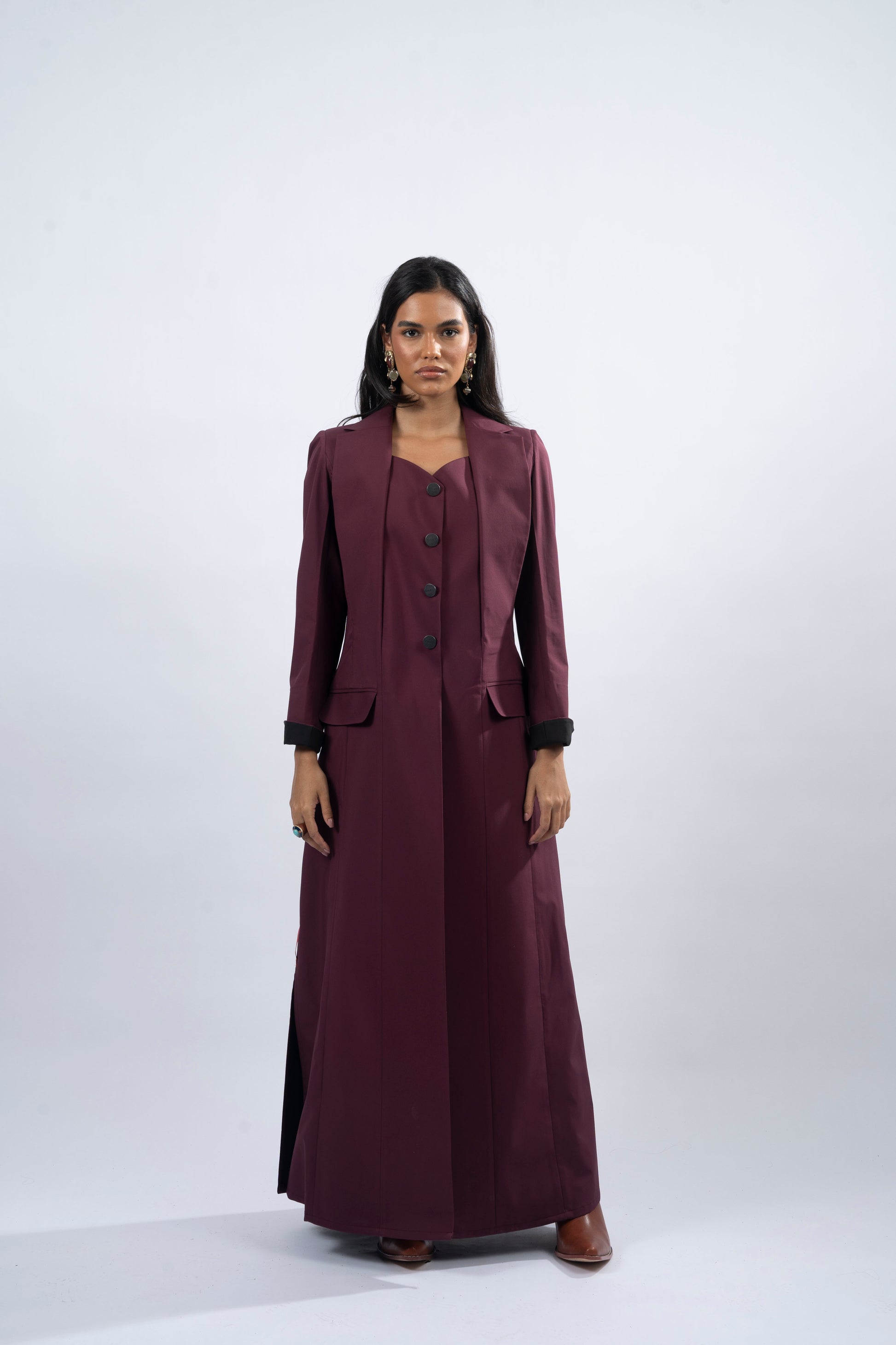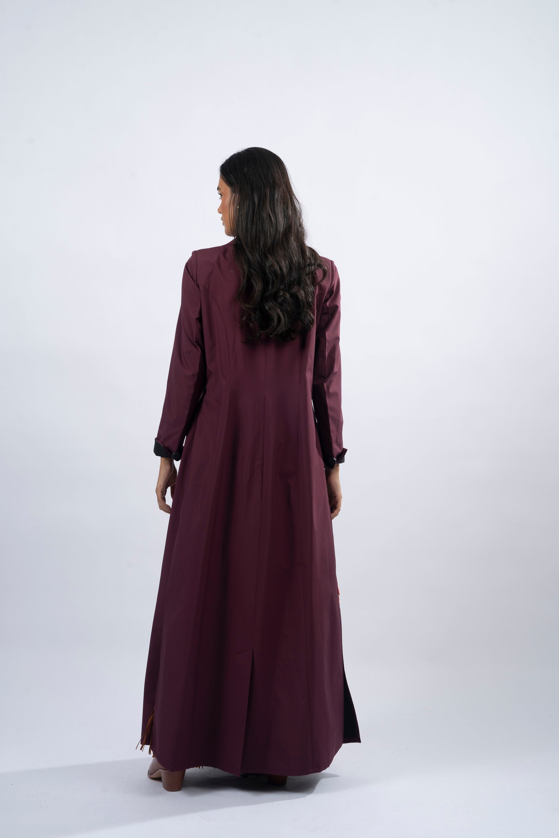 Elu, meaning "full of grace," is a design that effortlessly blends strength with gentleness. Crafted from luxurious trench coat fabric, this maroon abaya features a dark interior, creating a stunning contrast. The blazer cut, complete with shoulder pads, side slits, and Khat logo buttons, offers a polished and refined silhouette. Pockets add practicality, while the cuff detail showcases the opposite colour for an unexpected pop. Elu embodies both comfort and elegance, making it the perfect statement piece for any occasion.
