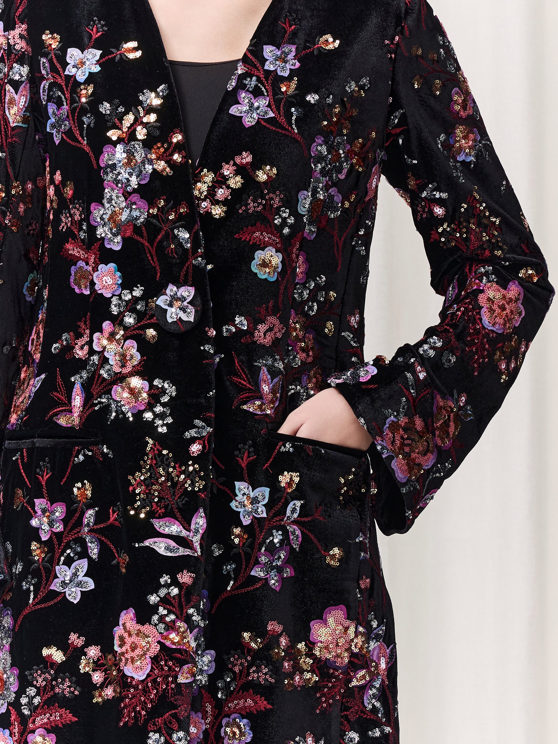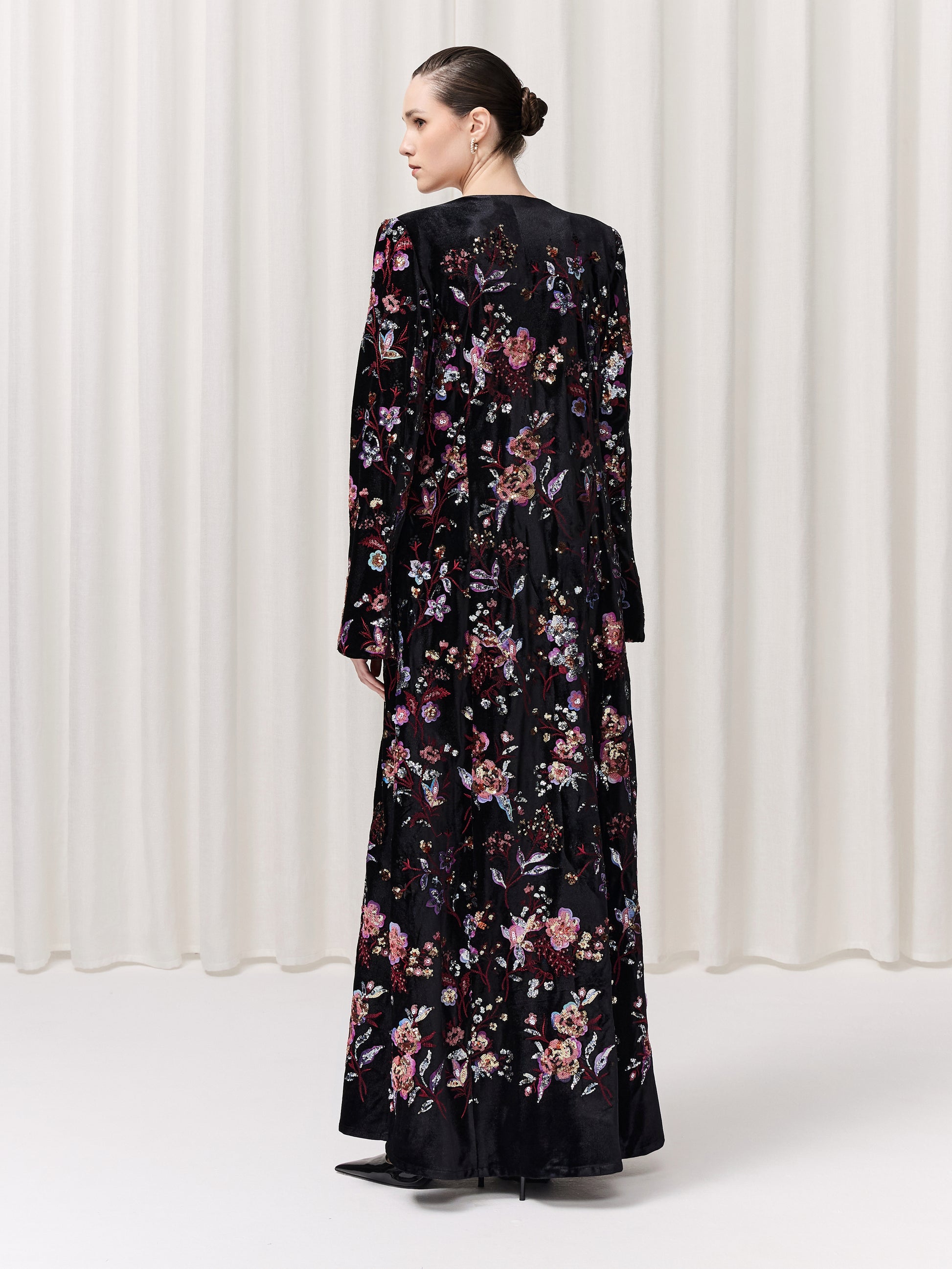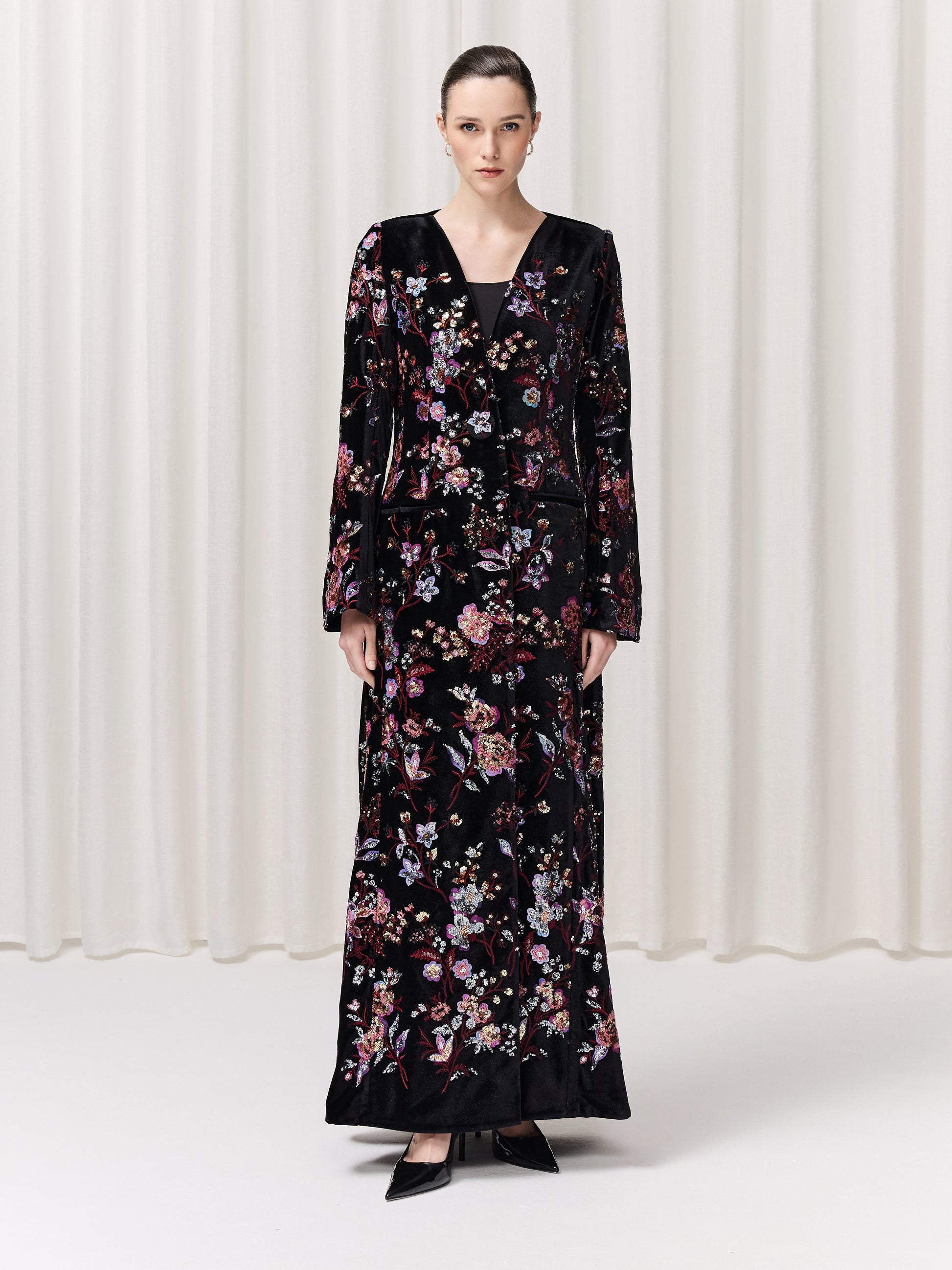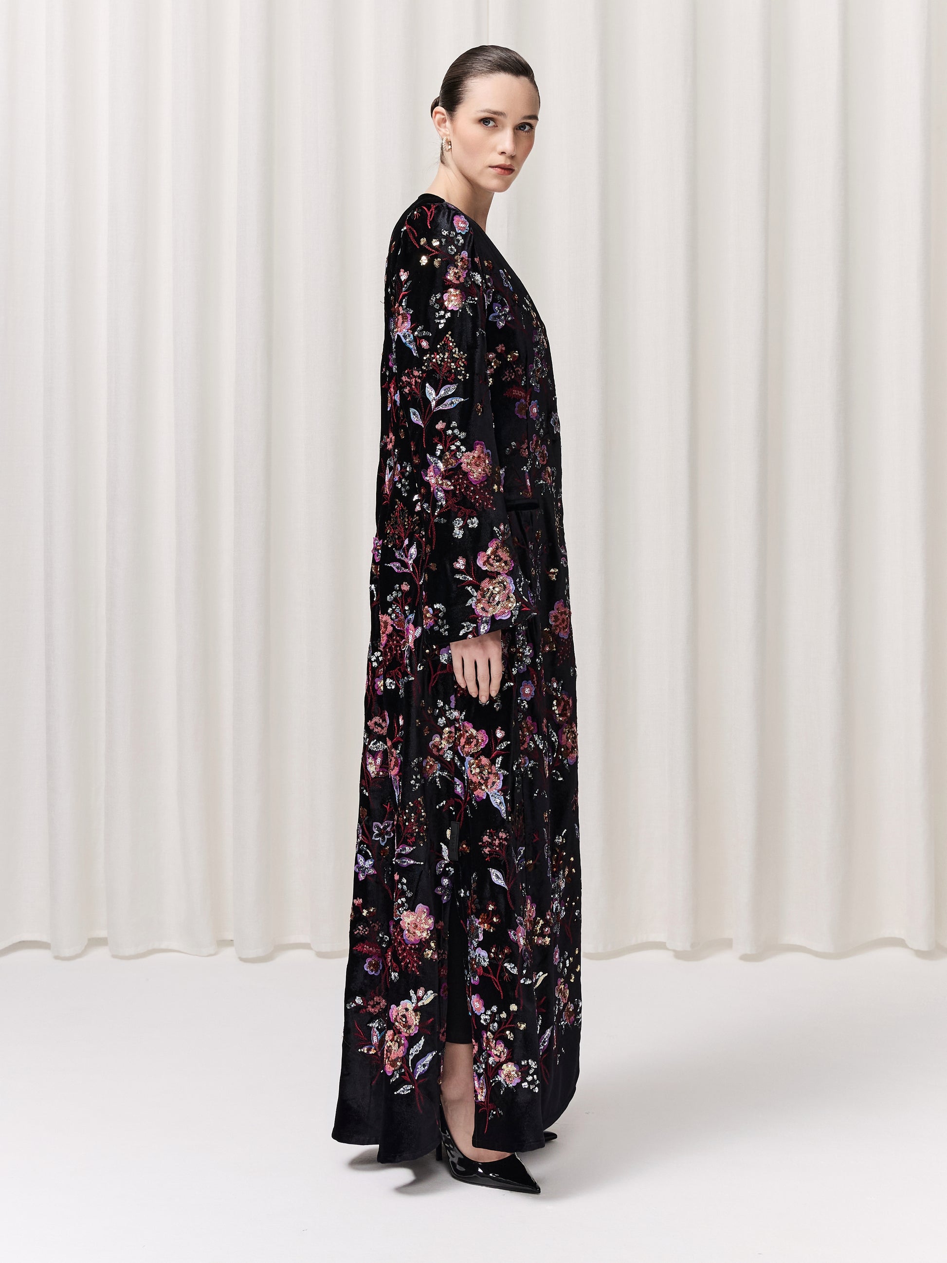 A breathtaking black velvet abaya adorned with glamorous floral embroidery in exquisite pinks and warm, radiant tones. The Helena is designed to make you feel effortlessly elegant, powerful yet feminine. With its thoughtful details, including subtle slits, structured shoulder pads, and practical pockets, this piece combines sophistication with ease. Slip into Helena and feel instantly elevated, graceful, confident, and unforgettable.