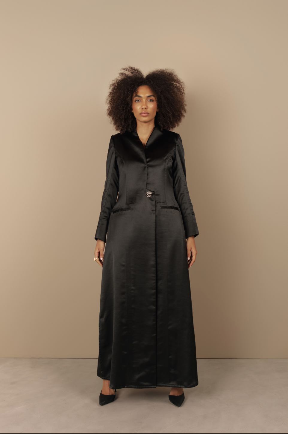 Named after the striking Heliconia flower, Helly embodies beauty. The signature logo-engraved button, inspired by the flower’s form, is the centrepiece of this princess-cut abaya.