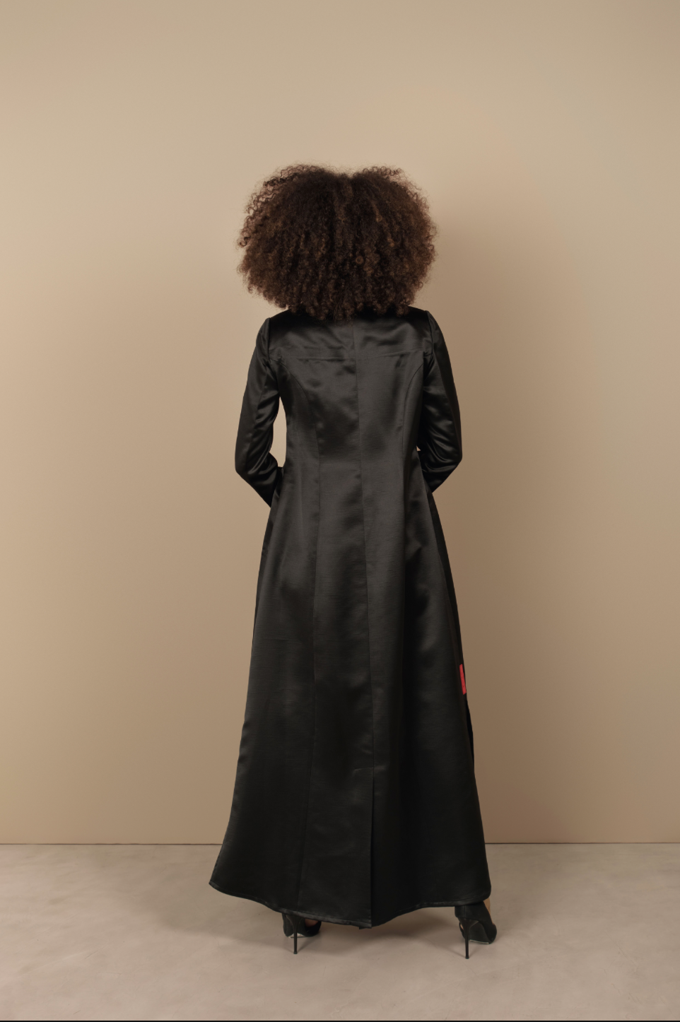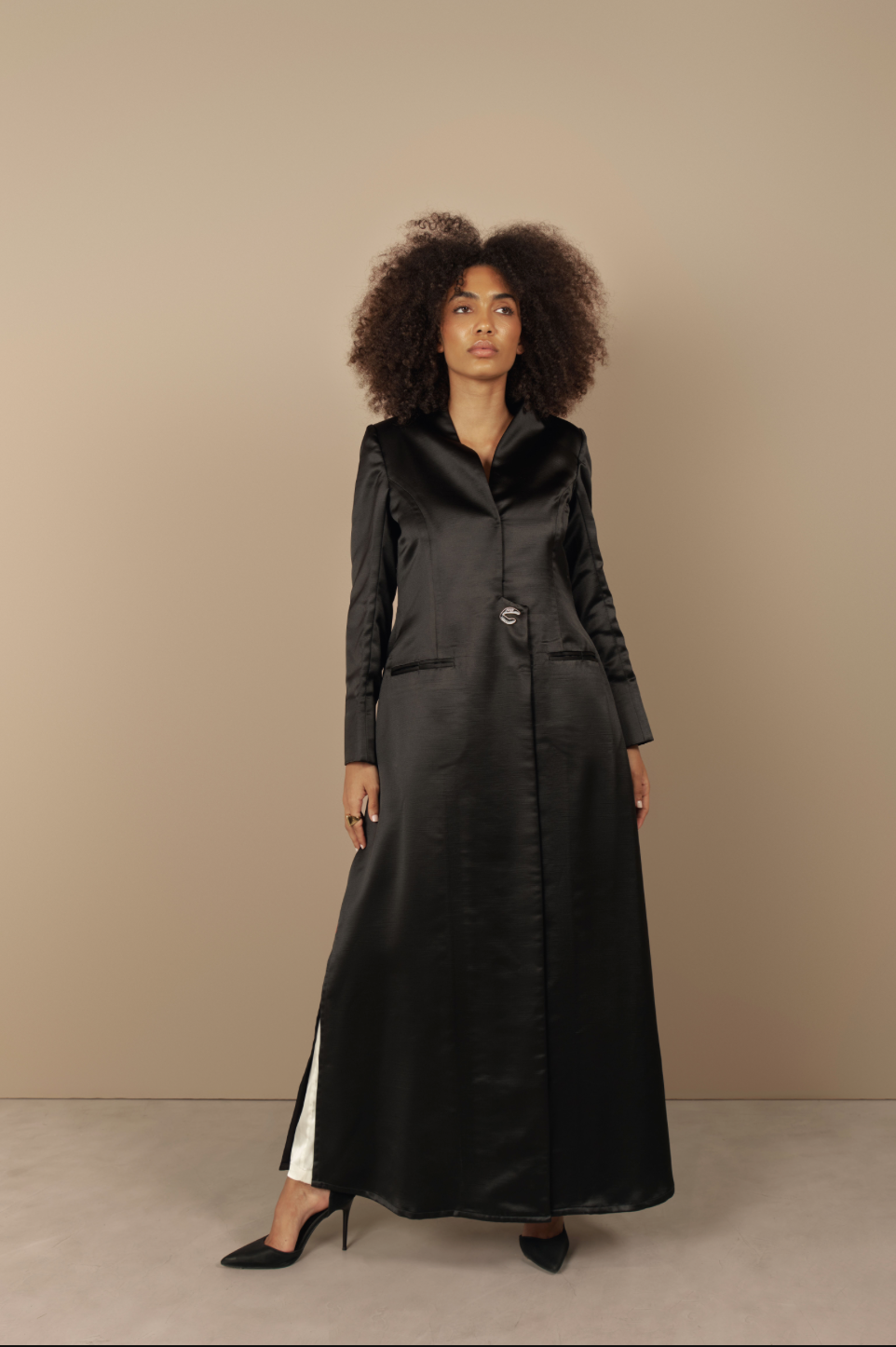 Crafted in taffeta fabric with structured shoulder pads and slit pockets, it’s designed to feel powerful yet graceful.