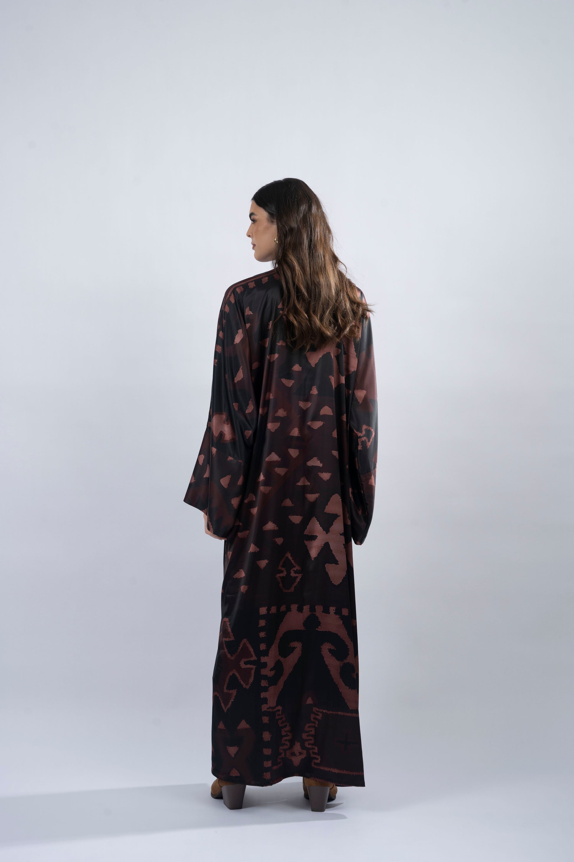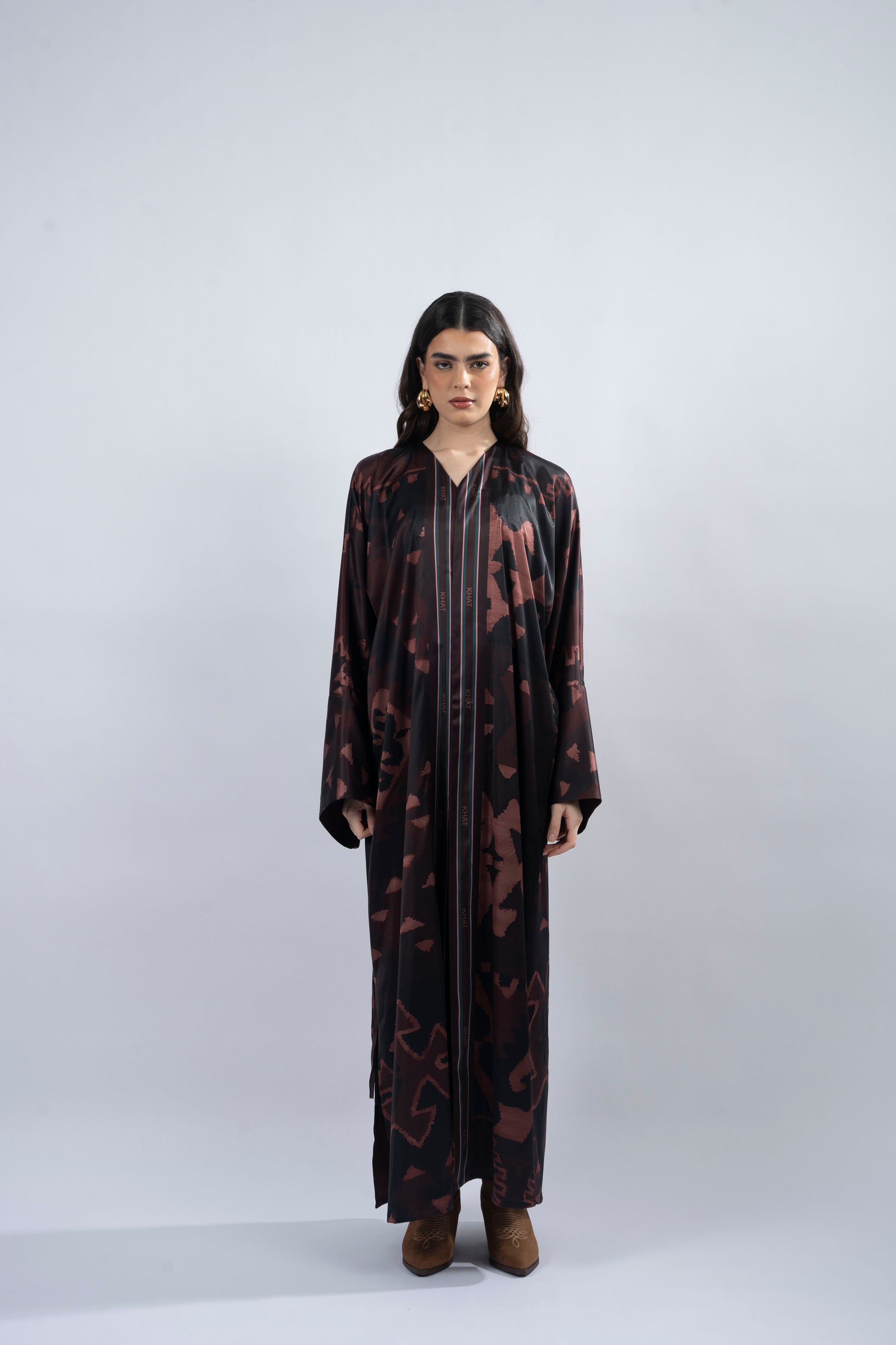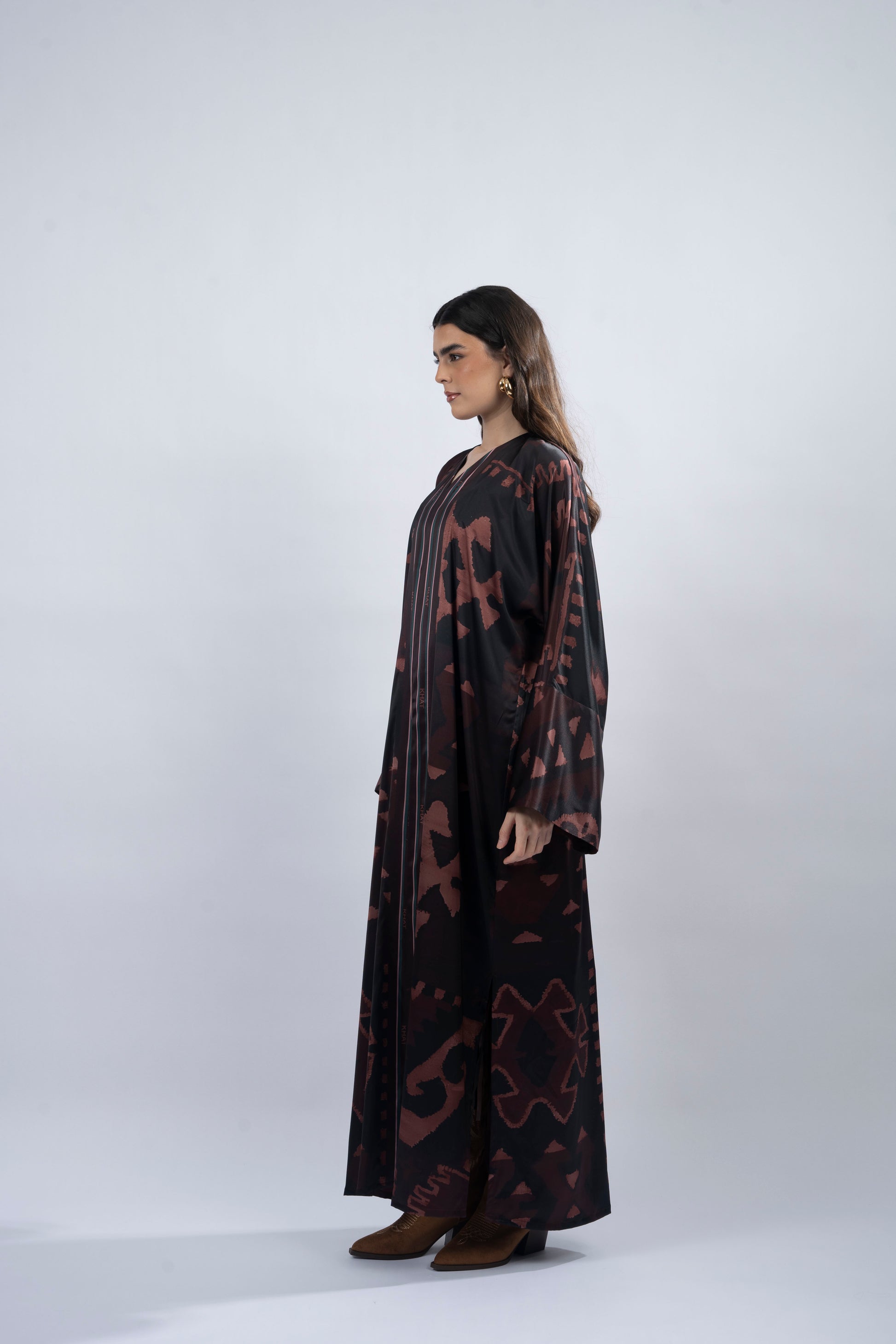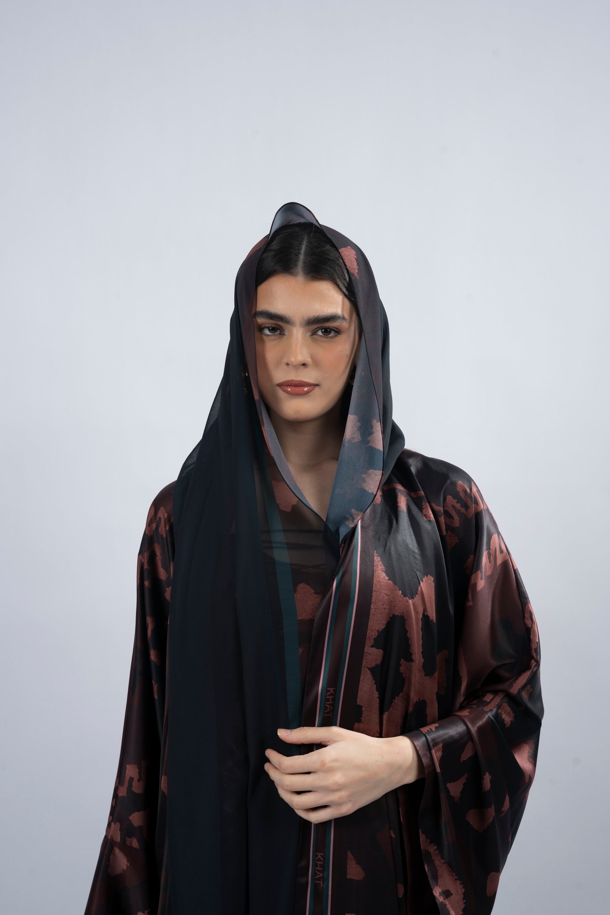 This T-cut abaya is crafted from smooth silk, designed with elegant side slits for effortless movement. Complemented by a chiffon printed scarf, it adds a refined touch to the ensemble. Inspired by ‘Kiona,’ meaning ‘brown hills,’ this piece reflects the grounding beauty of nature, with intricate prints that echo the strength and serenity of the land.
