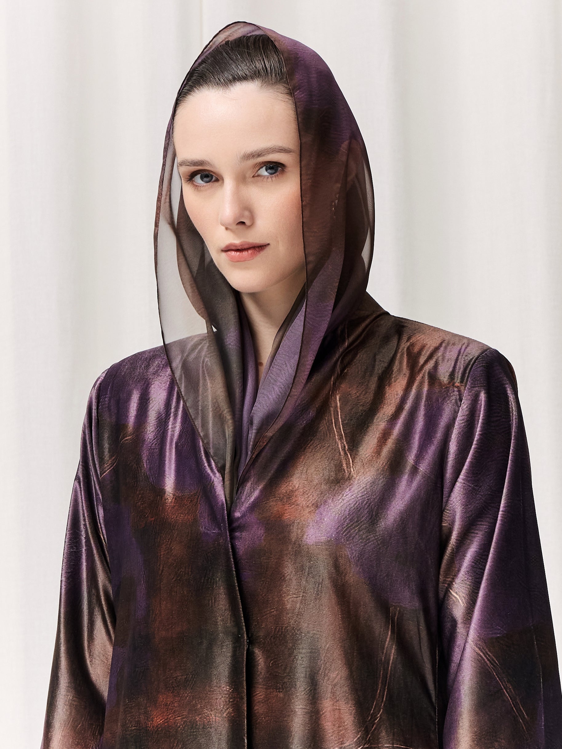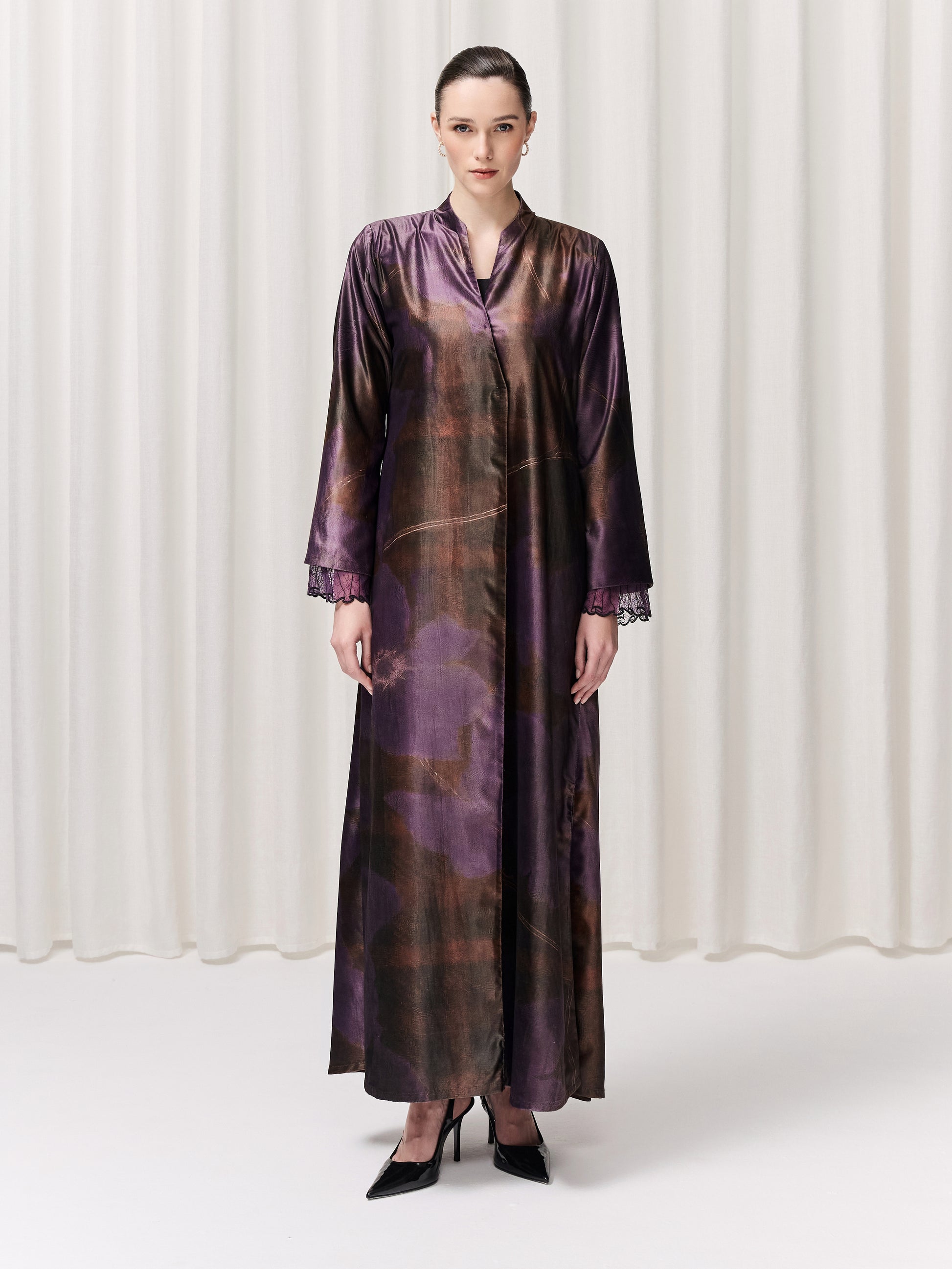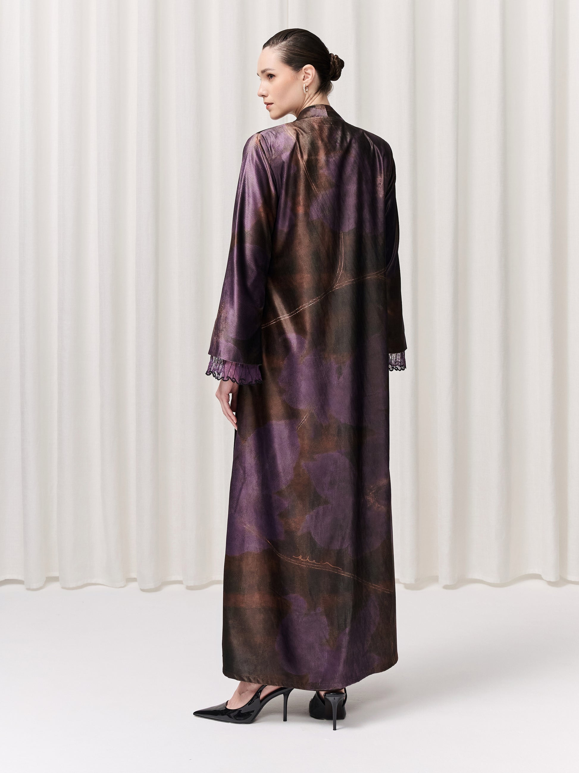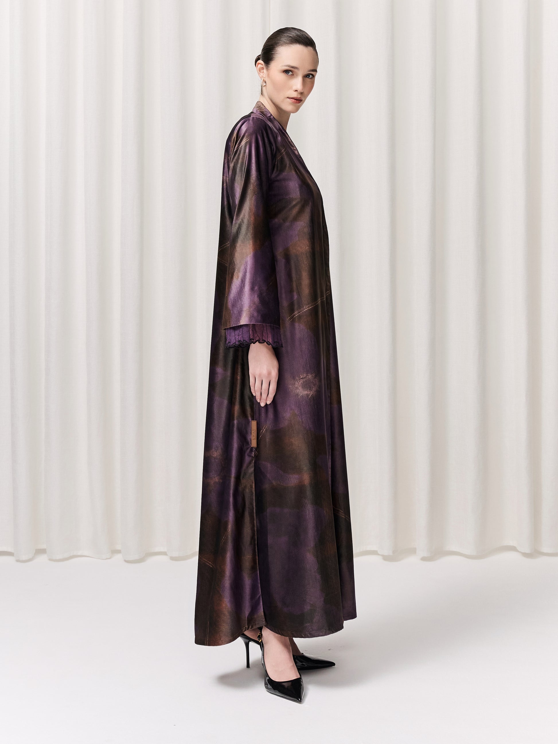 Part of the Lace Symphony collection, the Lilac abaya showcases an exclusive in-house print delicately transferred onto soft velvet. Purple florals bloom across subtle brown gingham hues; a contrast that, rather than competing, harmonizes into a beautifully balanced design. This abaya has two leg slits for movement. The sleeves are finished with intricate lace detailing, adding texture and grace, while the matching printed sheila completes the look with quiet sophistication. Elegant, artistic, and full of depth, Lilac is a celebration of refined creativity and effortless beauty.