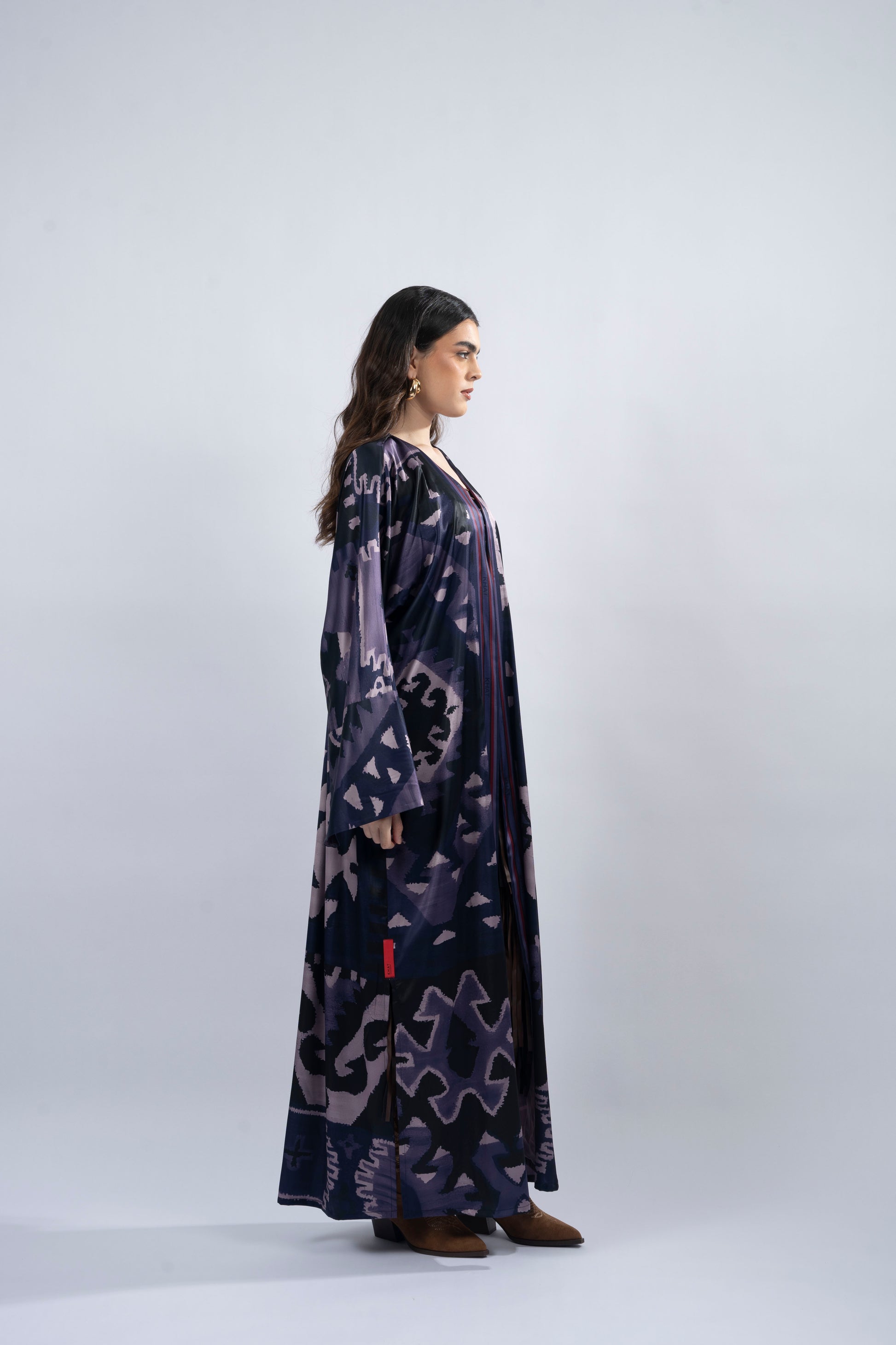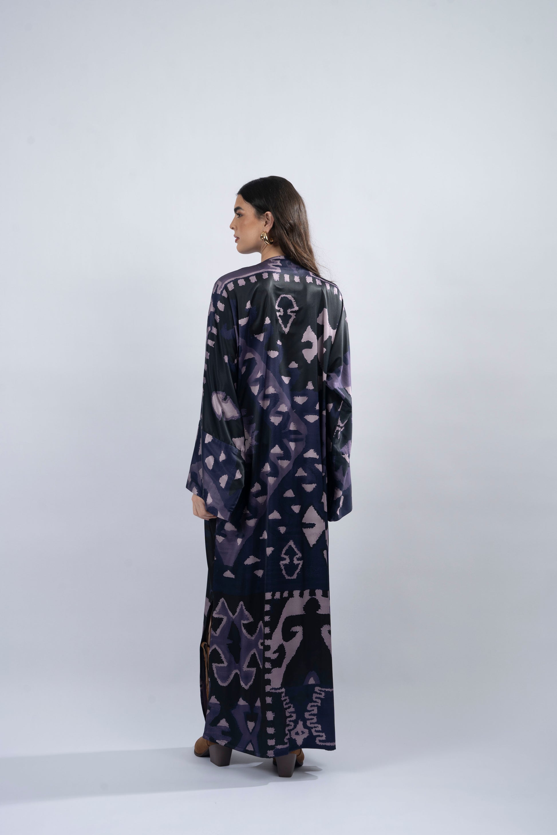 This T-cut abaya, crafted from luxurious silk, features graceful side slits for ease of movement and a chiffon printed scarf for a delicate finish. ‘Maiara,’ meaning ‘wise,’ embodies effortless elegance and timeless sophistication. Designed to complement our in-house prints inspired by Native American artistry, this piece blends tradition with modern refinement.