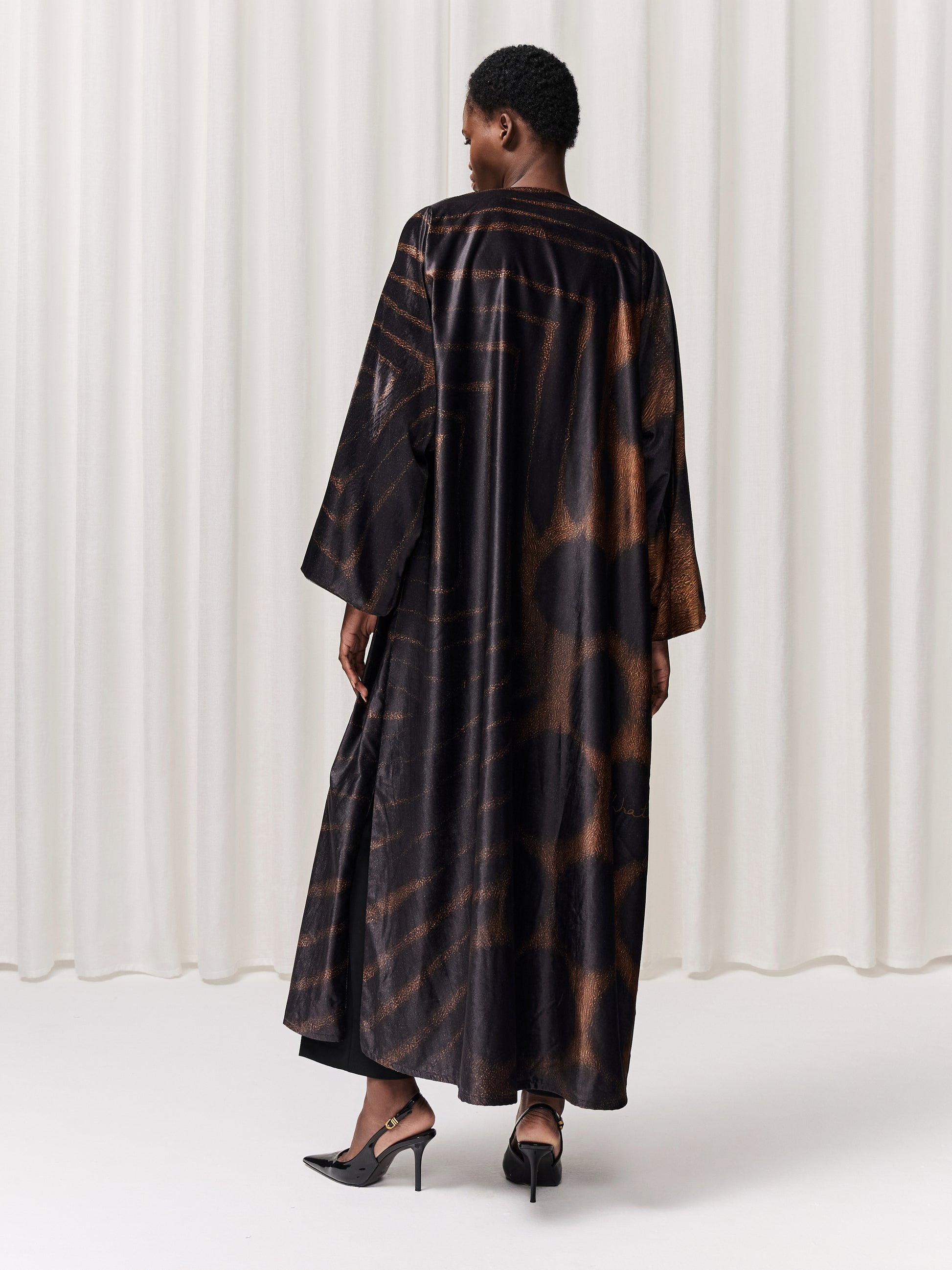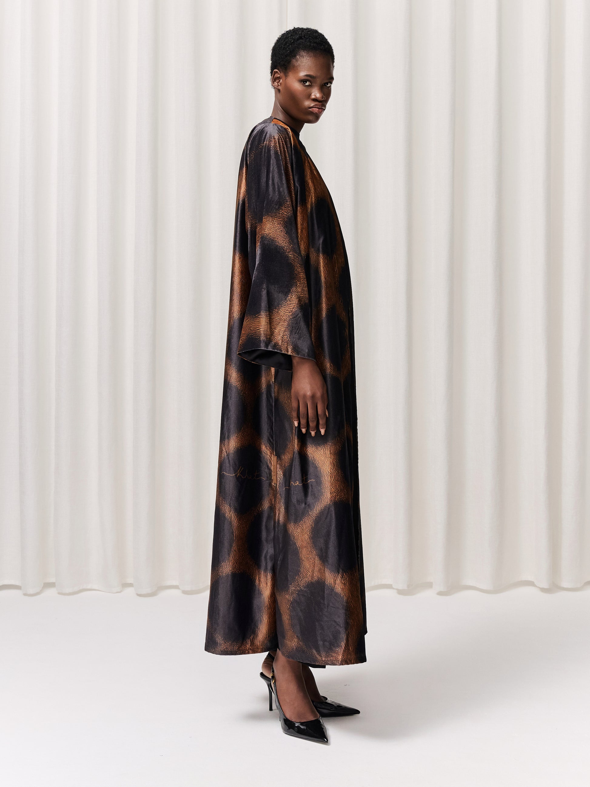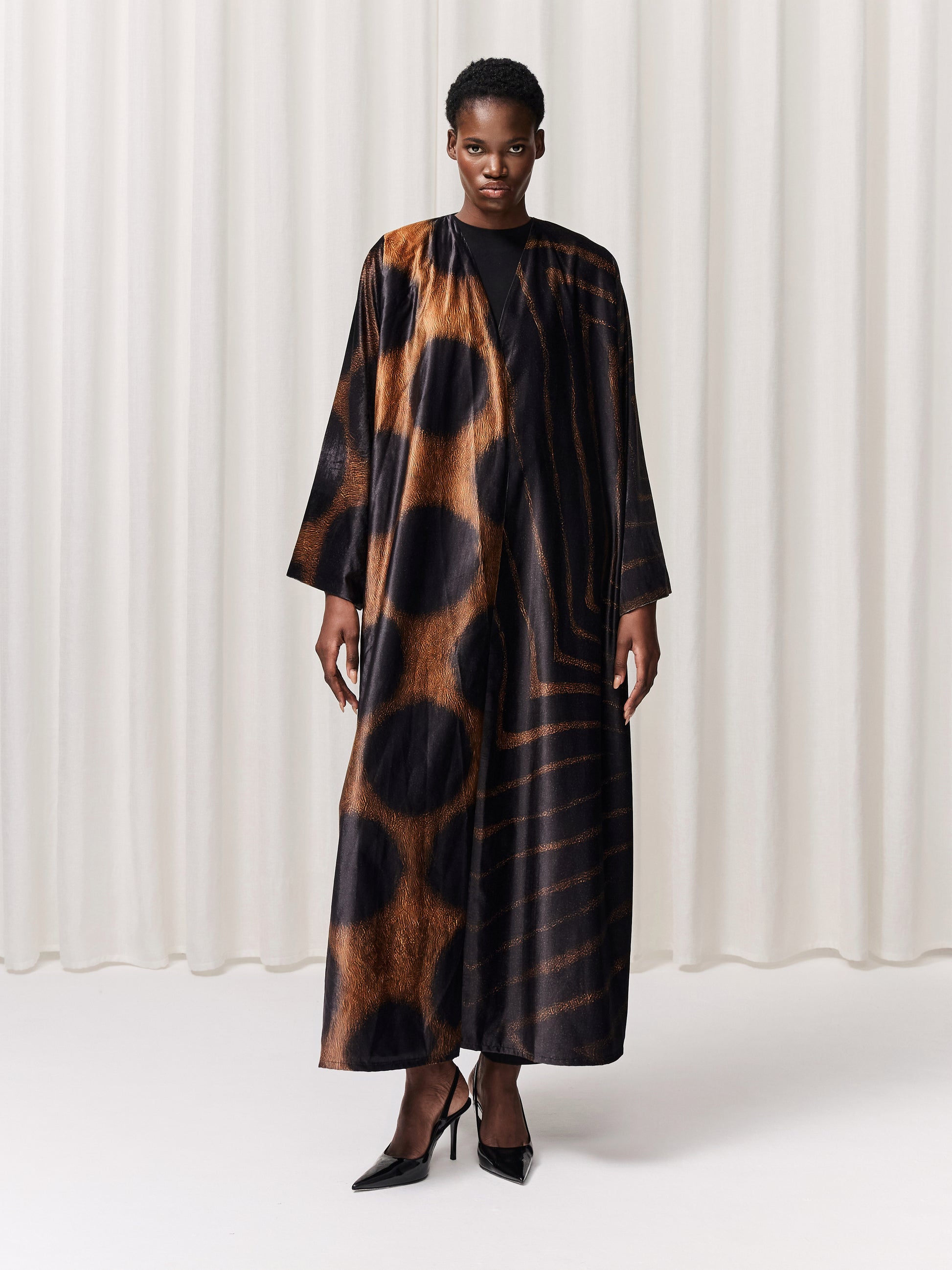 Inspired by the delicate beauty of the butterfly, the Morpho abaya features an exclusive in-house velvet print, capturing a microscopic view of a butterfly in intricate detail. Subtle textures and luminous golden-yellow tones dance across the fabric, creating a piece that feels both artistic and enchanting. Designed in a relaxed T-cut silhouette, it moves effortlessly, offering elegance in every step. Paired with a printed Sheila in crinkle chiffon.
