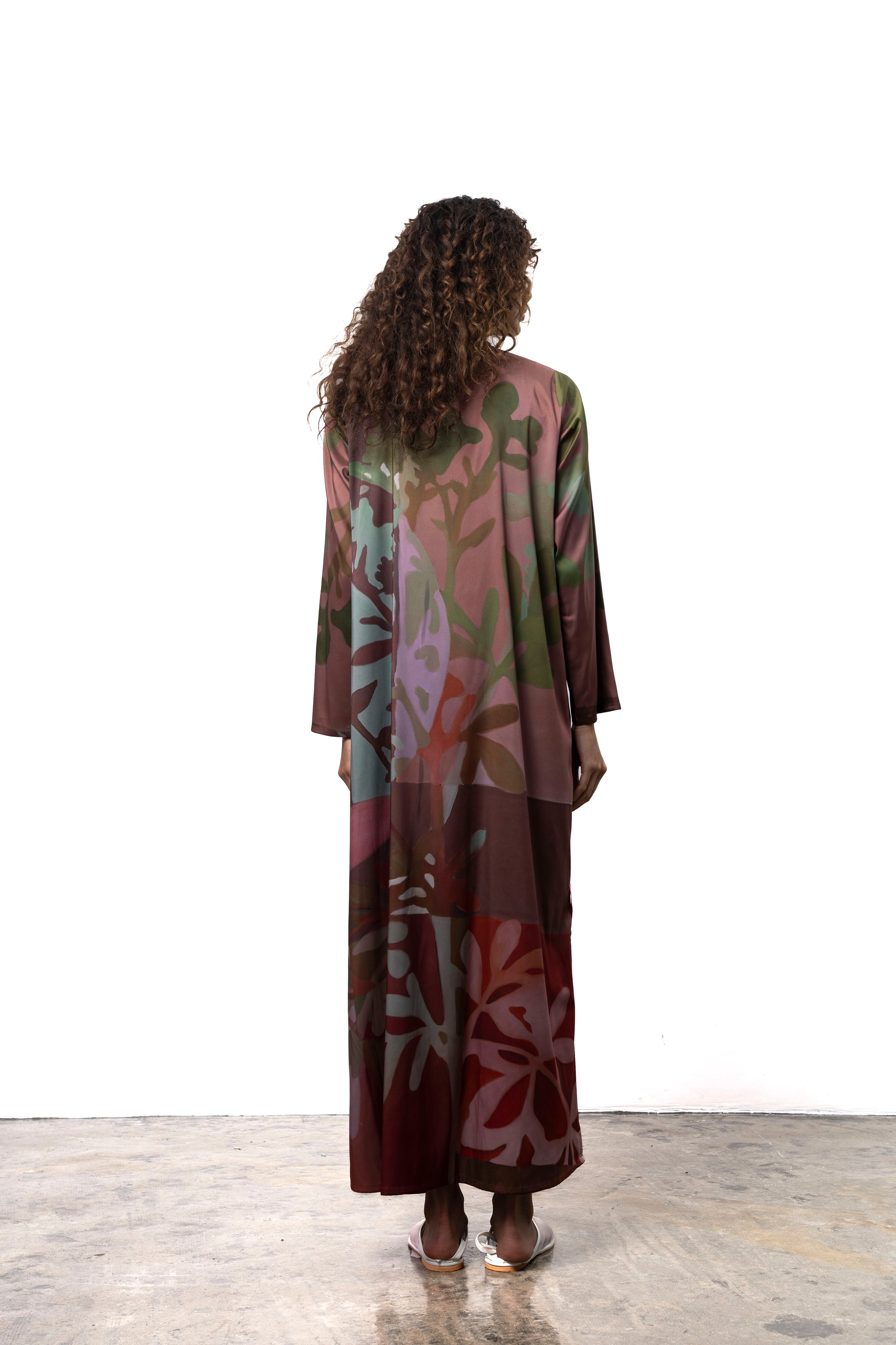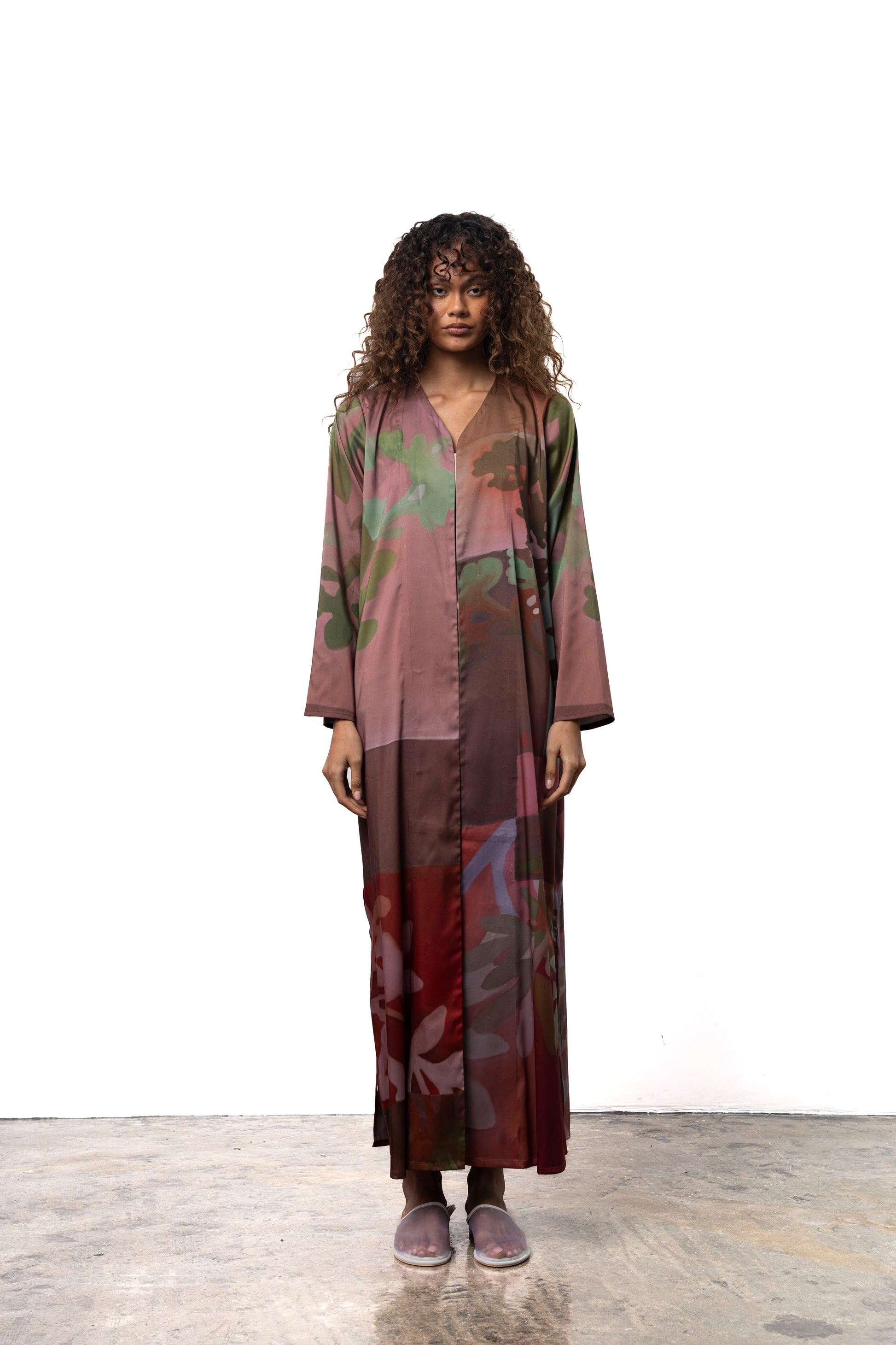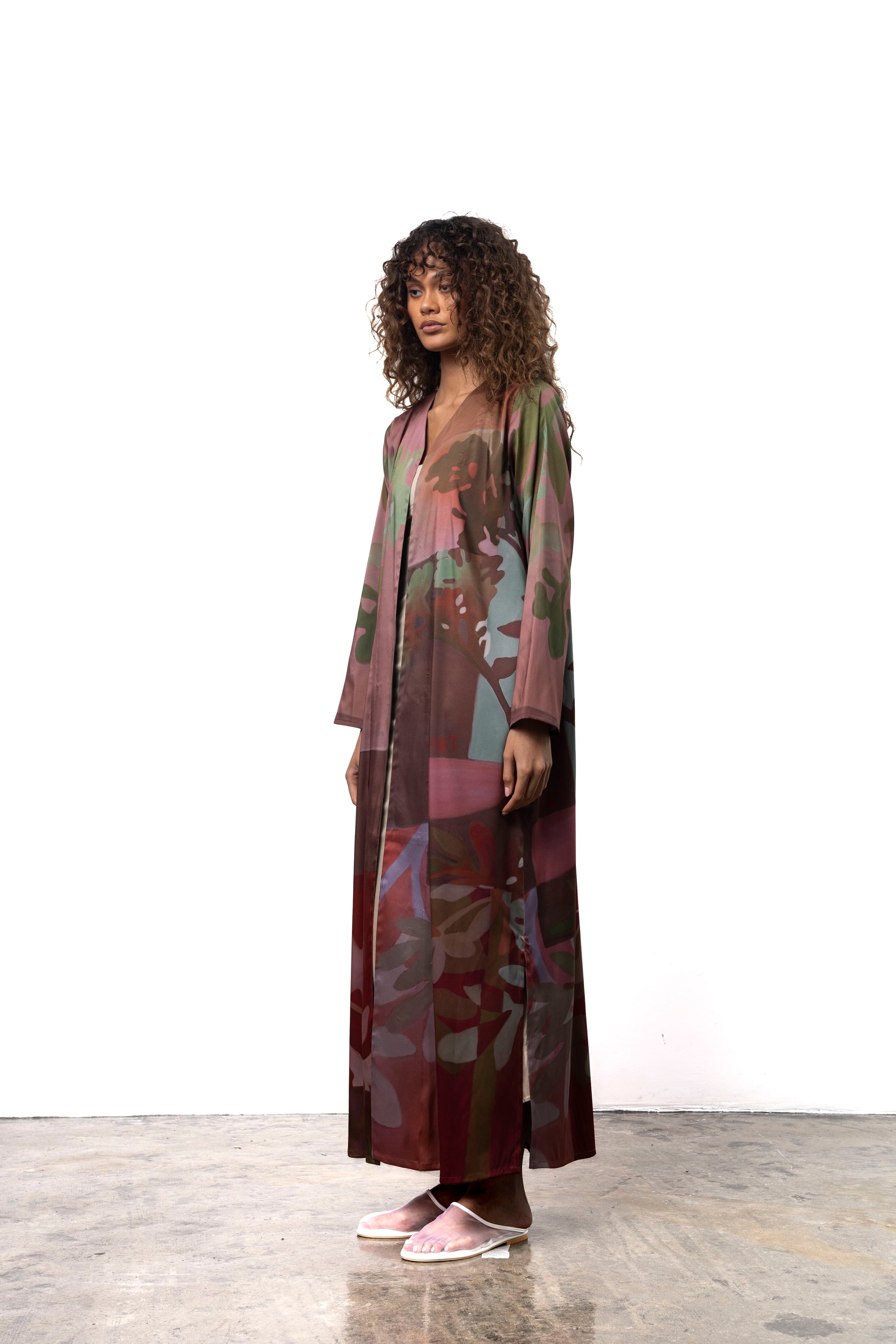 This digitally printed silk bisht cut abaya showcases a stunning Persian rug-inspired design, complemented by the KHAT logo. It includes a beautifully printed sheila for a complete look.