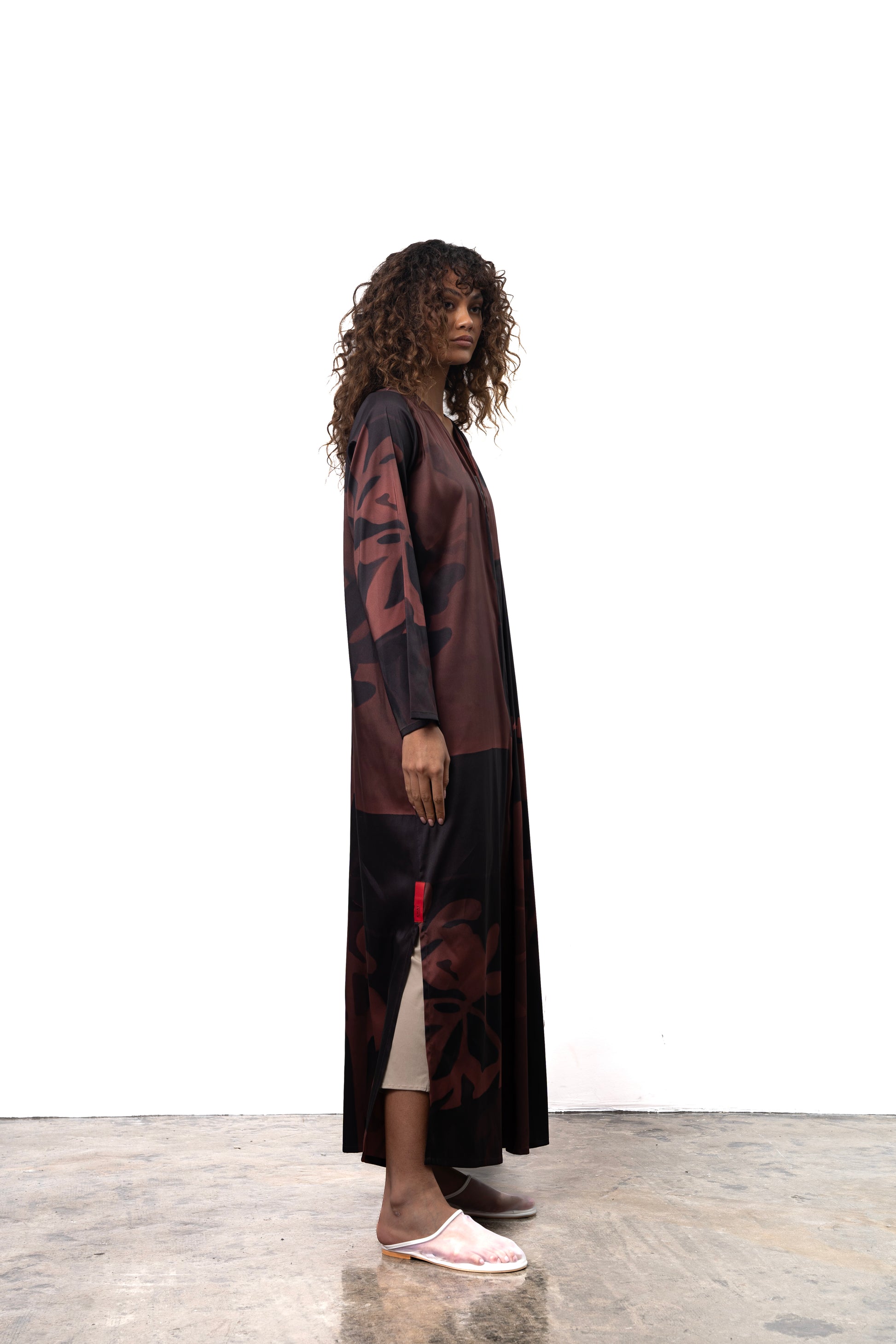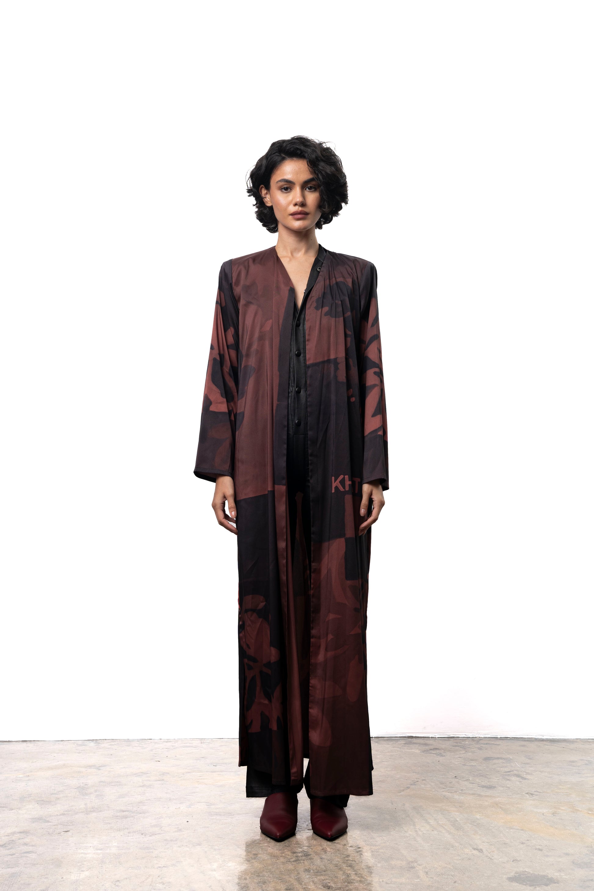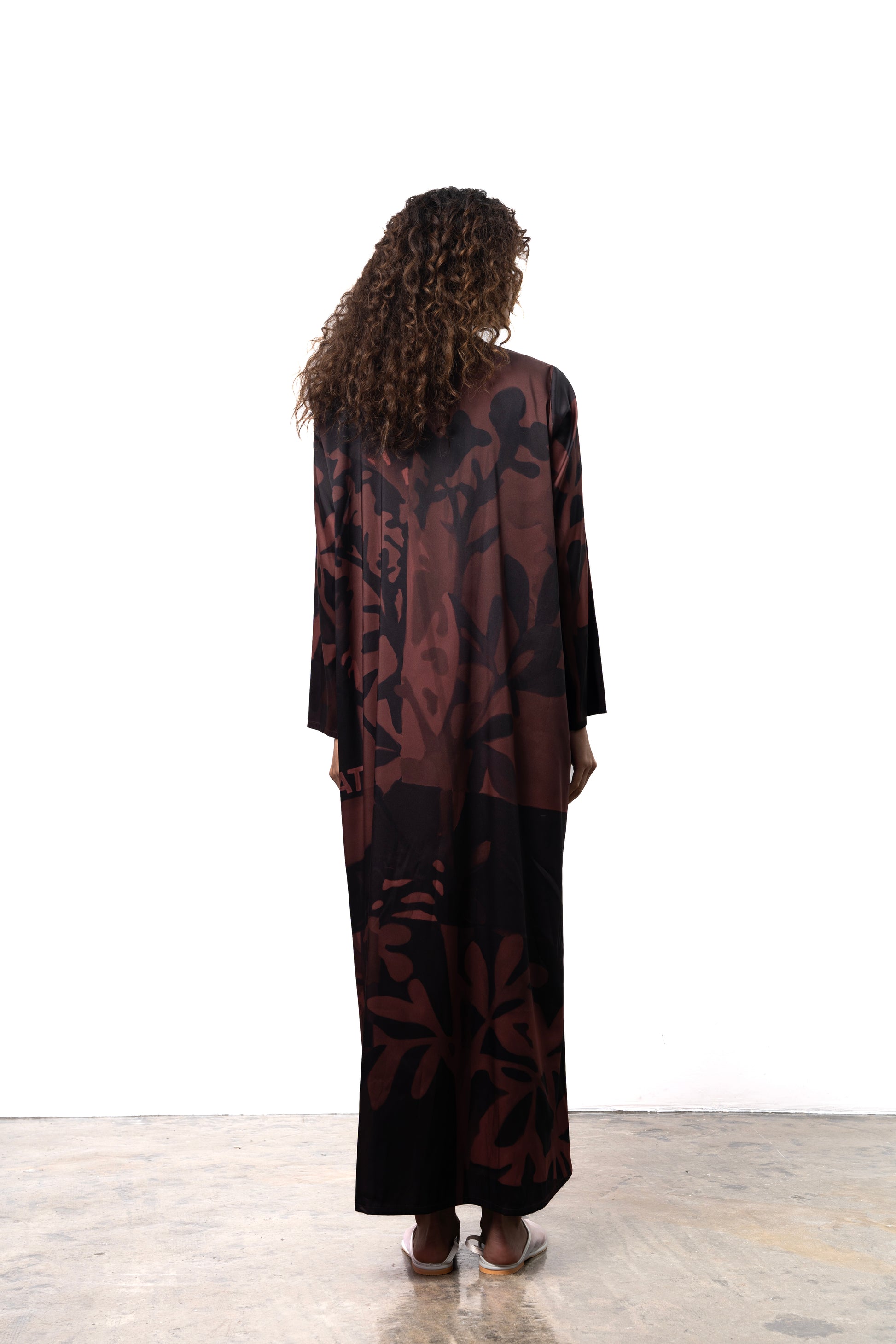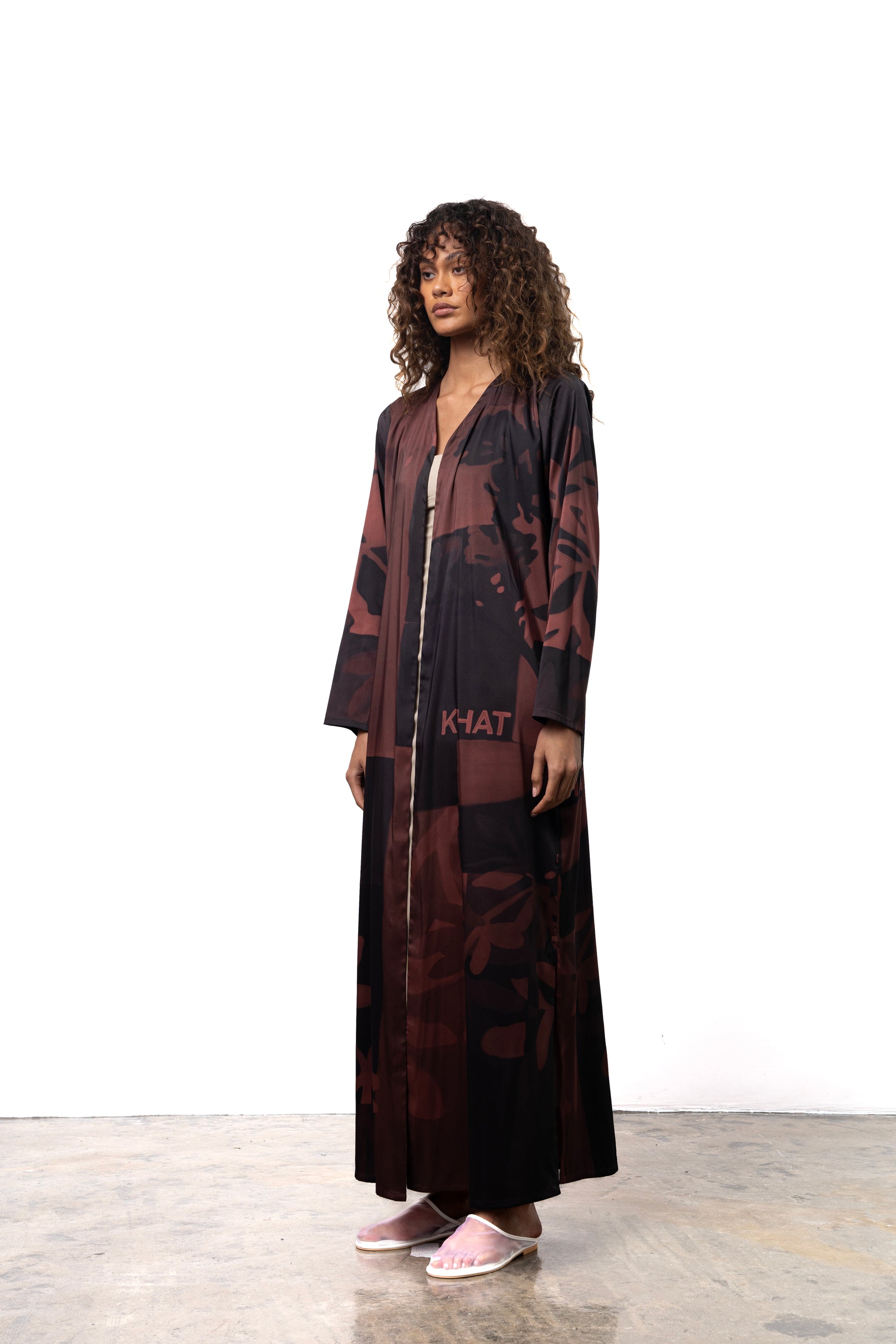 This digitally printed silk bisht cut abaya showcases a stunning Qataf-inspired design, complemented by the KHAT logo. It includes a beautifully printed sheila for a complete look.
