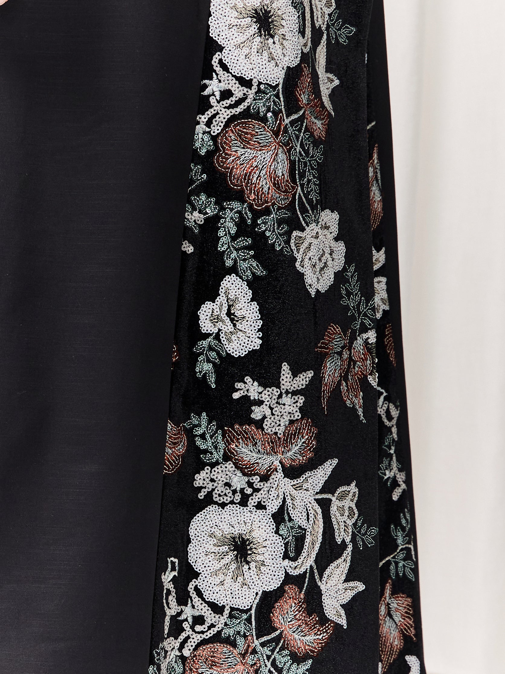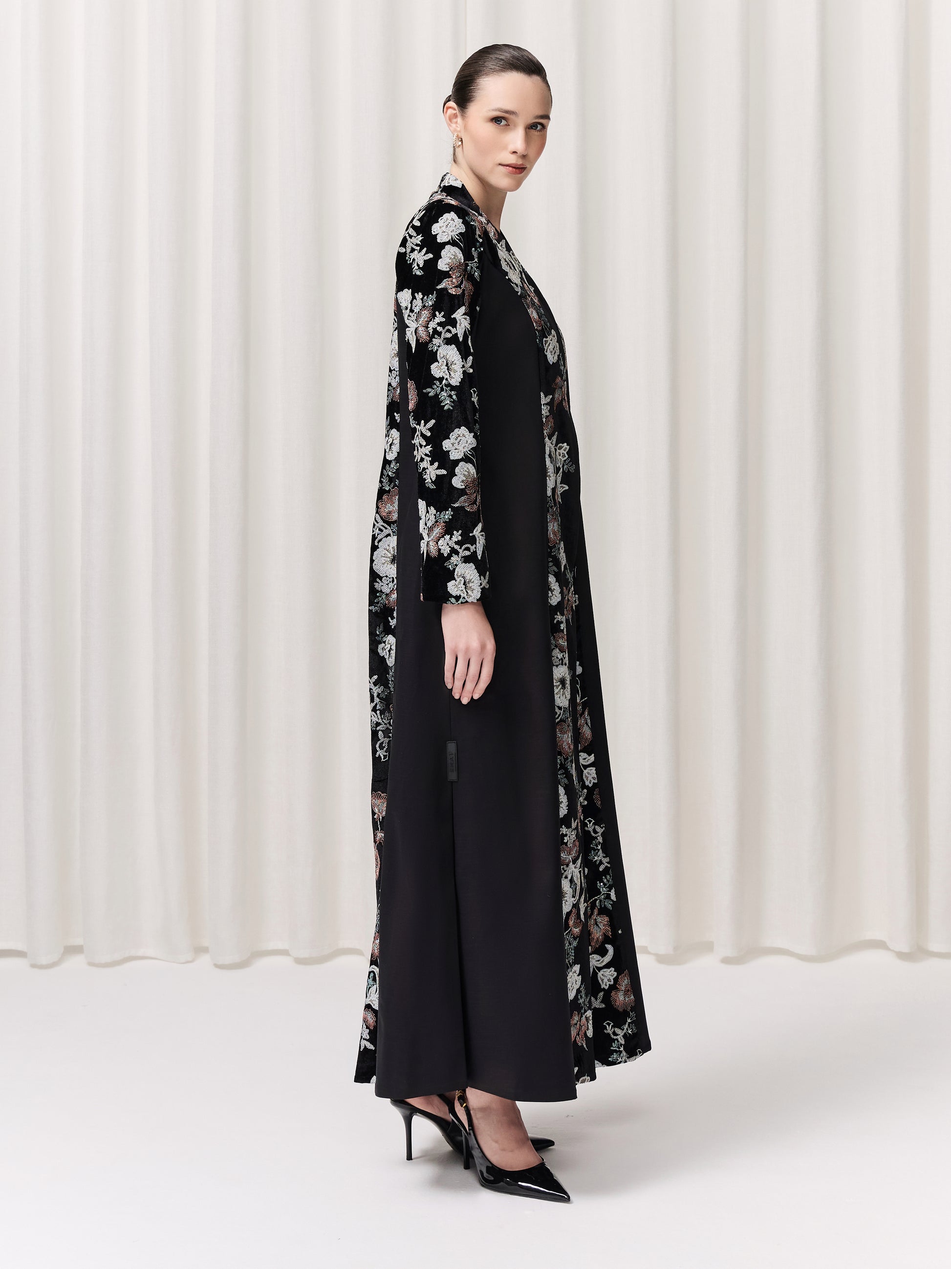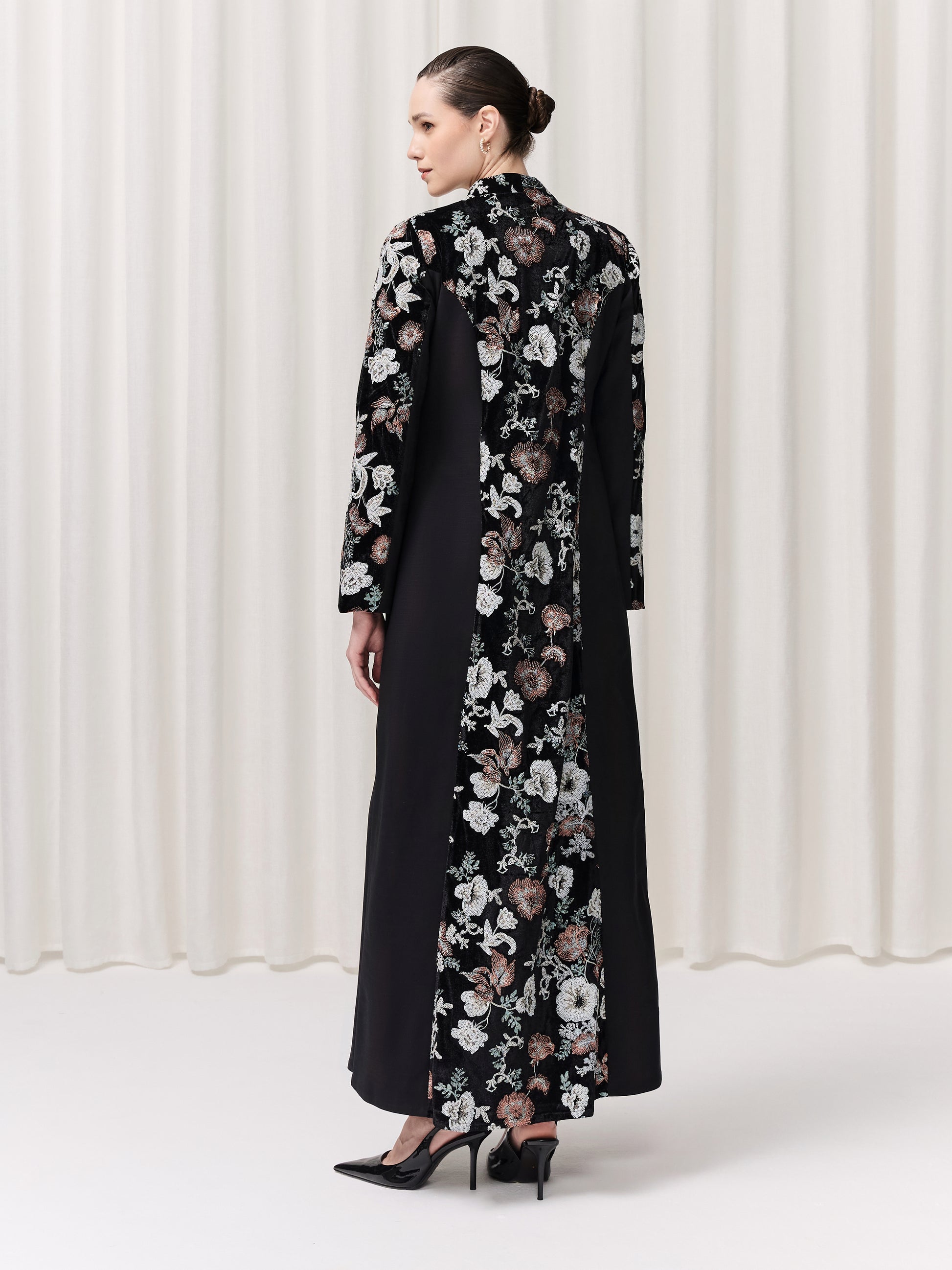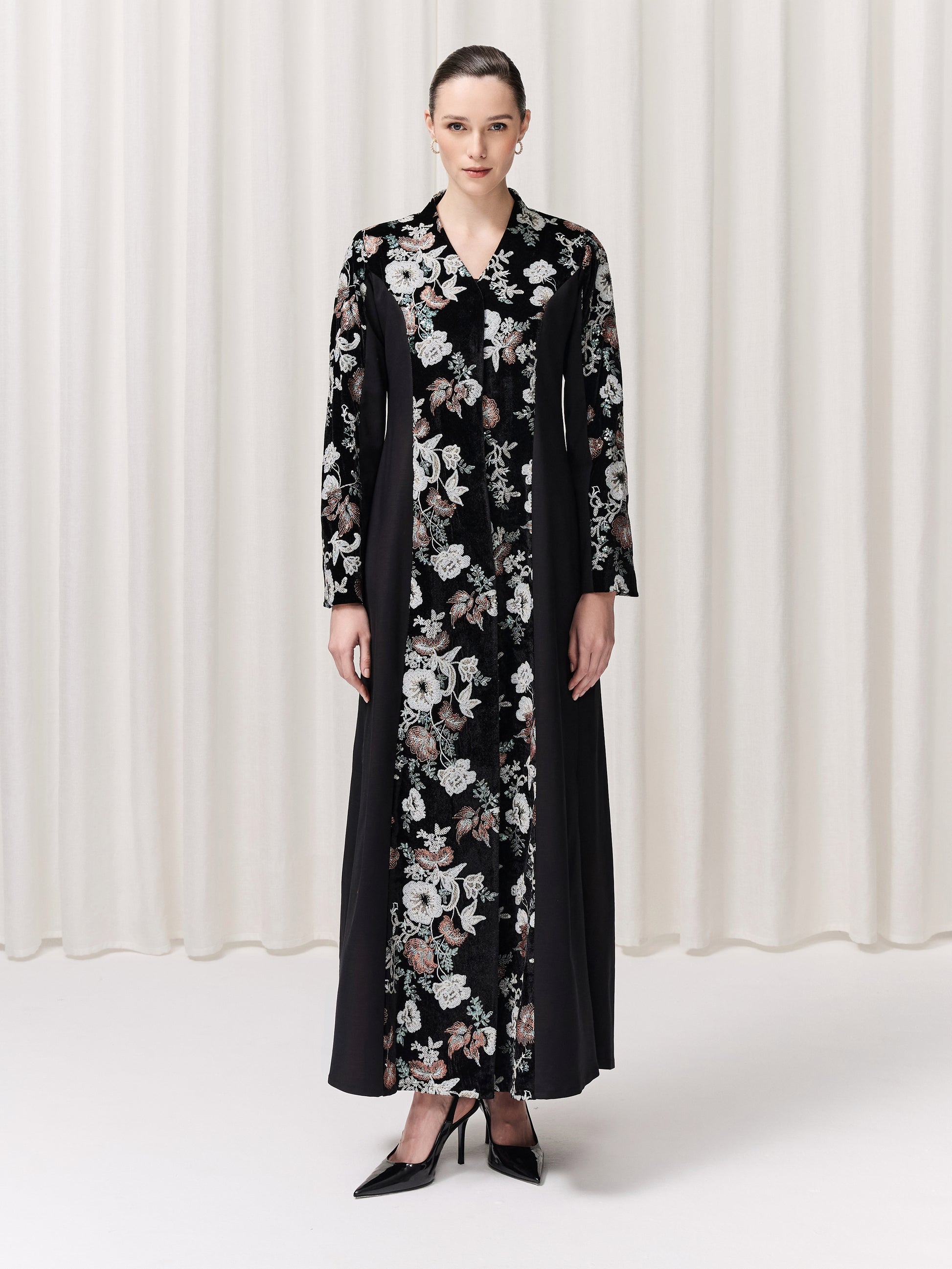 A masterpiece of contrast and harmony, the Paloma abaya features a split design that pairs lavish black velvet panels, richly embroidered with vibrant florals, alongside sleek black jacquard for a refined balance. Its simple, tailored cut allows the beauty of the fabrics to speak, bold yet sophisticated, luxurious yet effortlessly wearable. We added two leg slits for movement. Paired with a flowing chiffon sheila, Paloma is the definition of quiet power and elegance. Wearing it will make you feel beautifully unstoppable.
