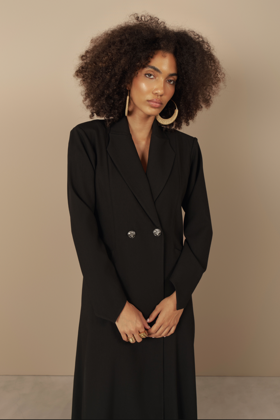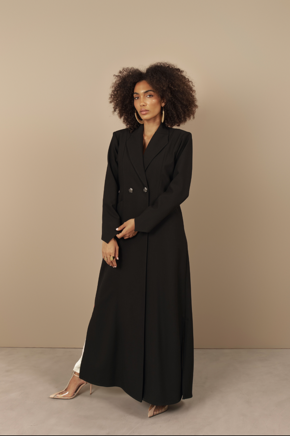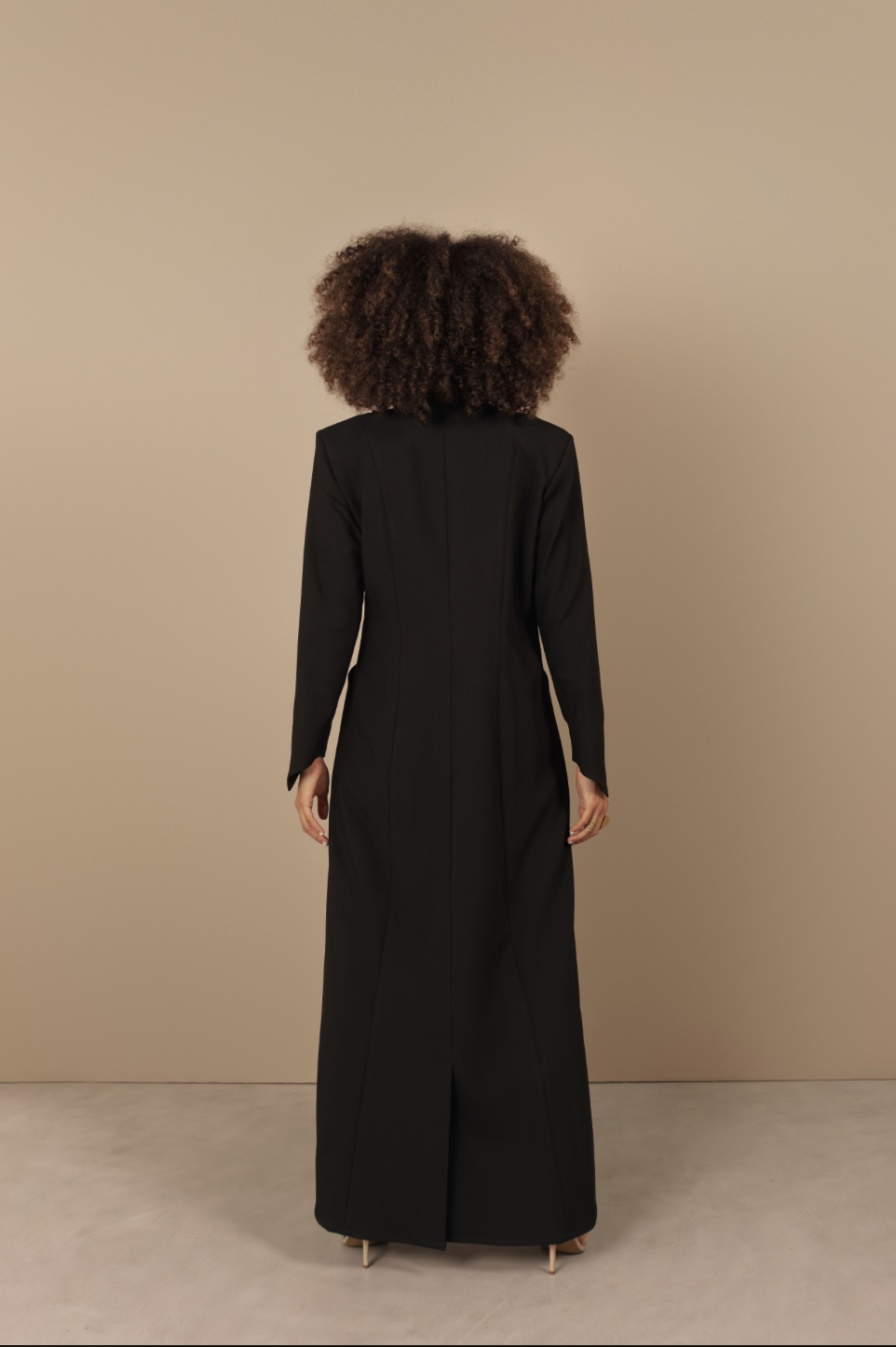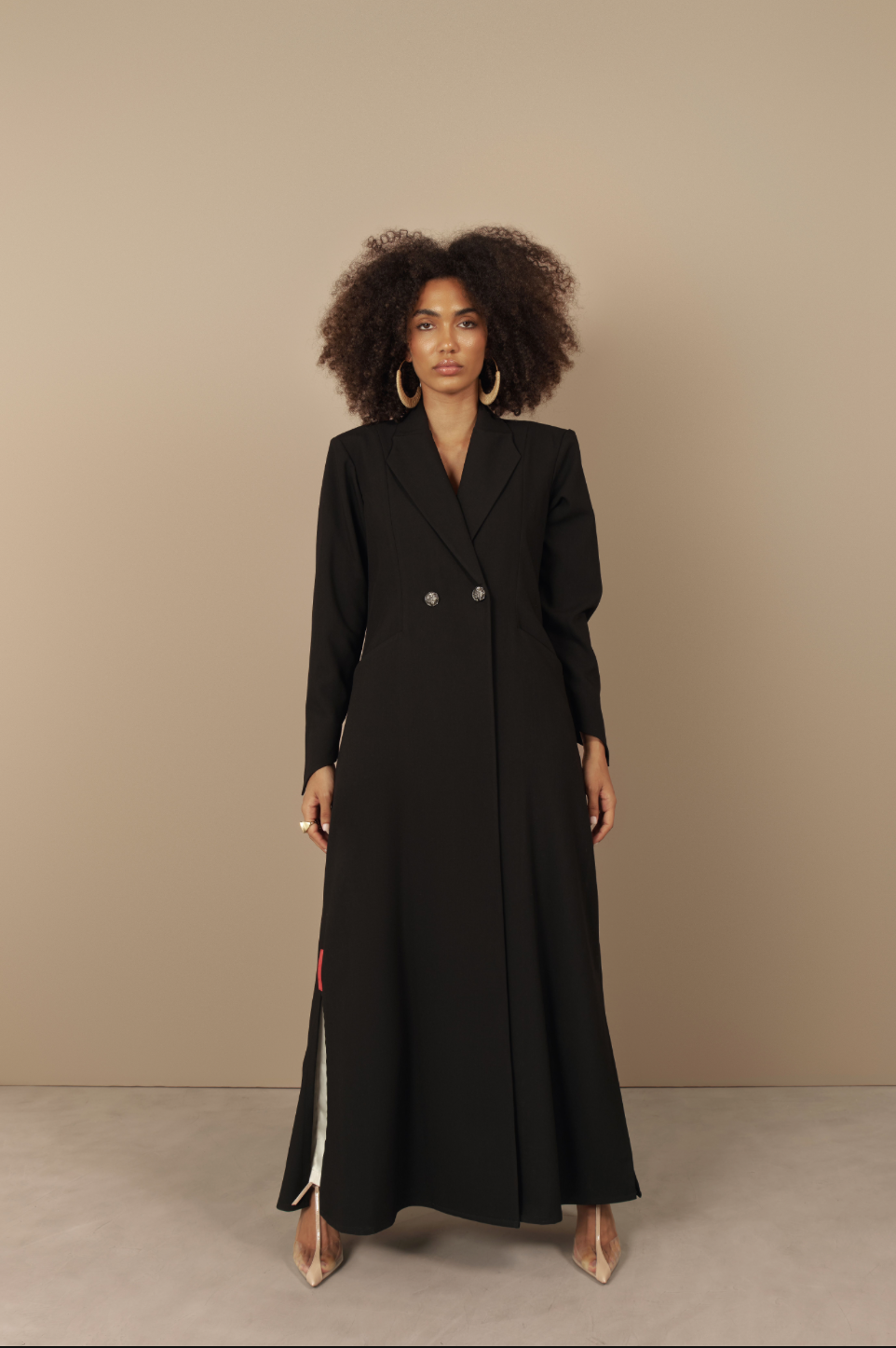 Inspired by the bold elegance of the Bird of Paradise flower, this abaya channels natural power and poise. Paradise is a princess blazer cut with striking pointed sleeves that echo the silhouette of the flower’s petals. Made with crepe jacquard, structured with shoulder pads and finished with two engraved Khat logo buttons, the design combines strength with delicacy.