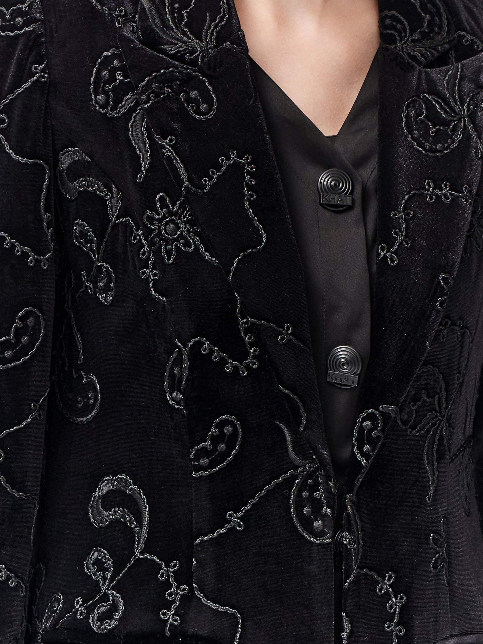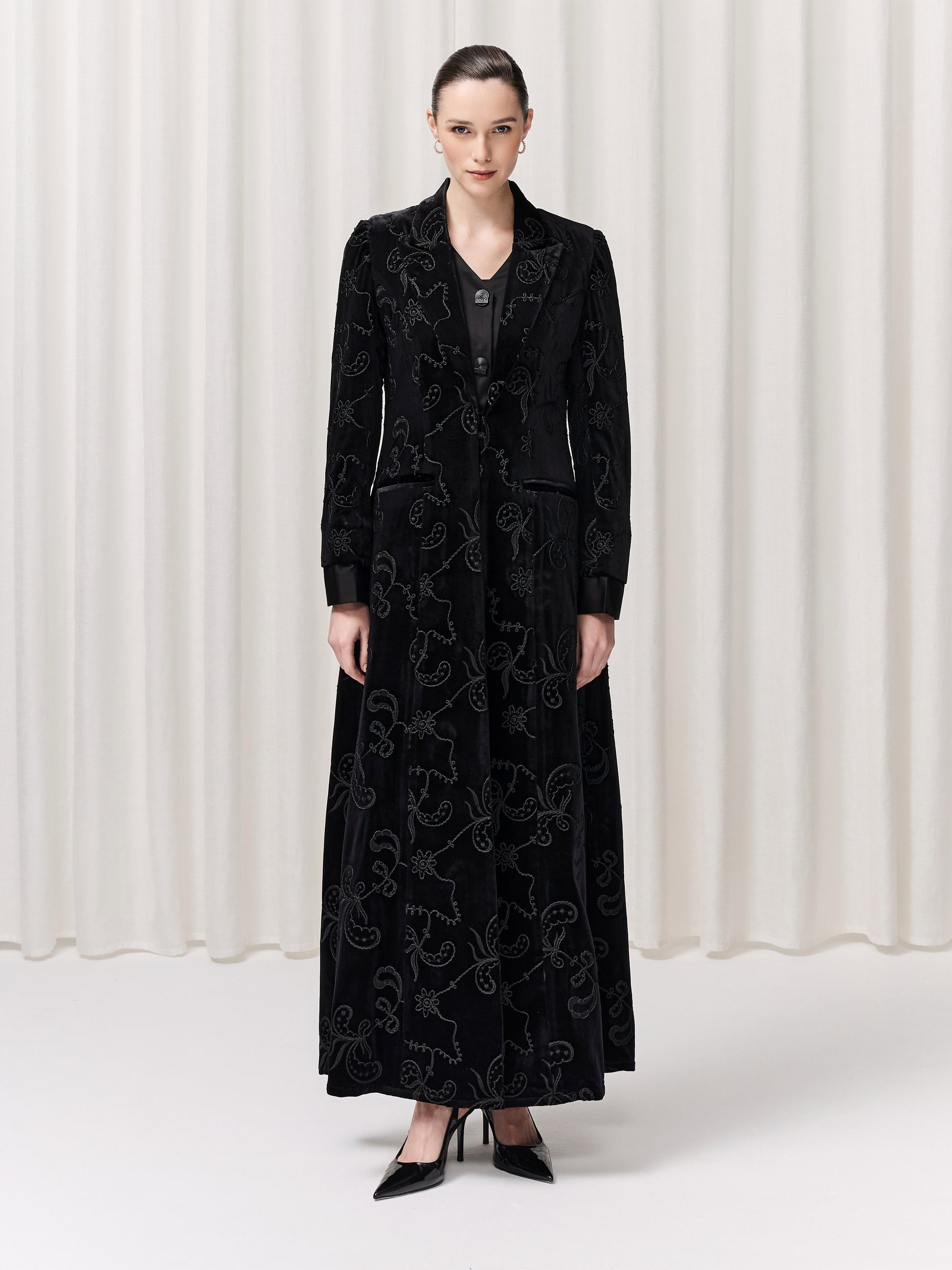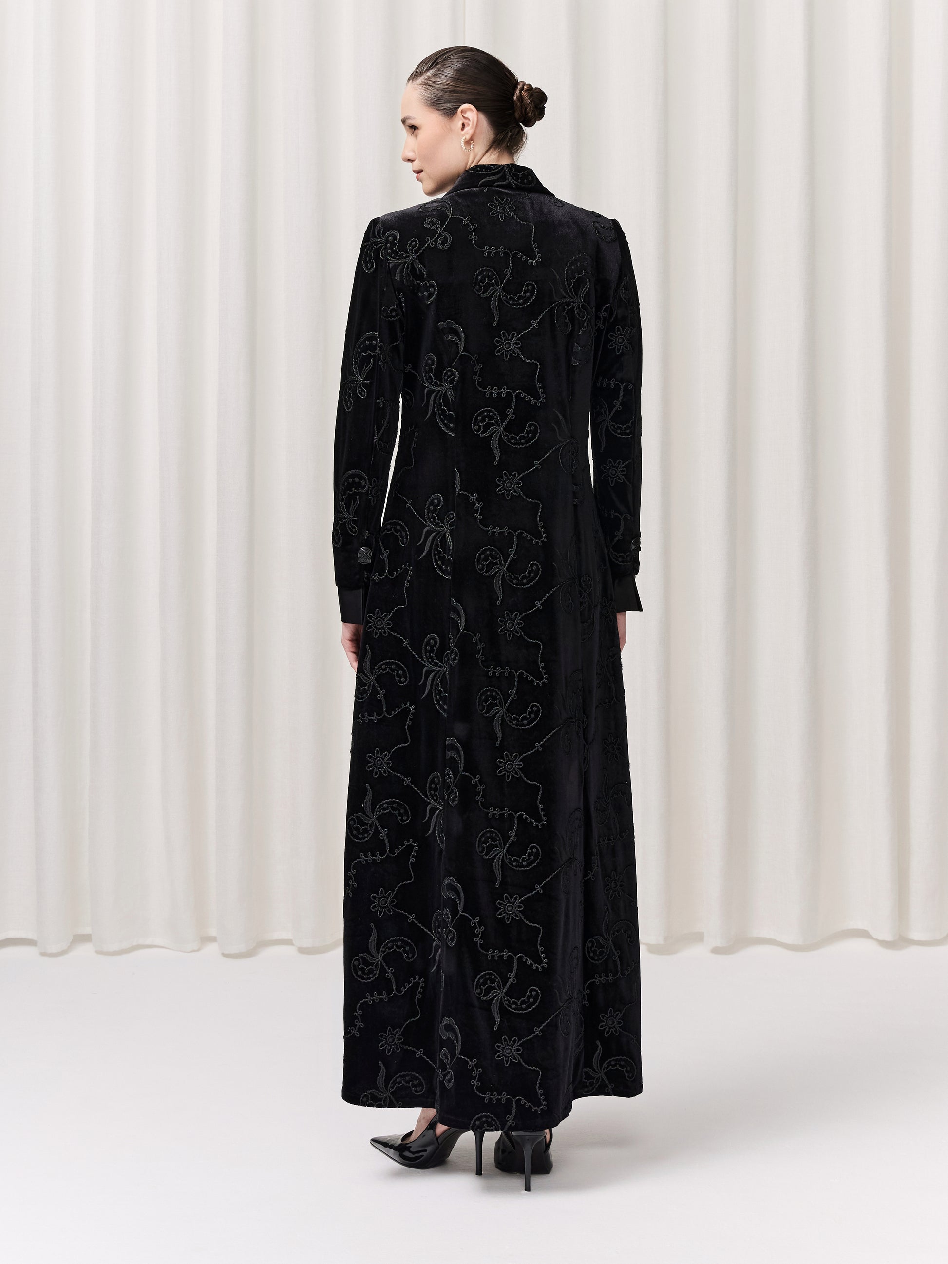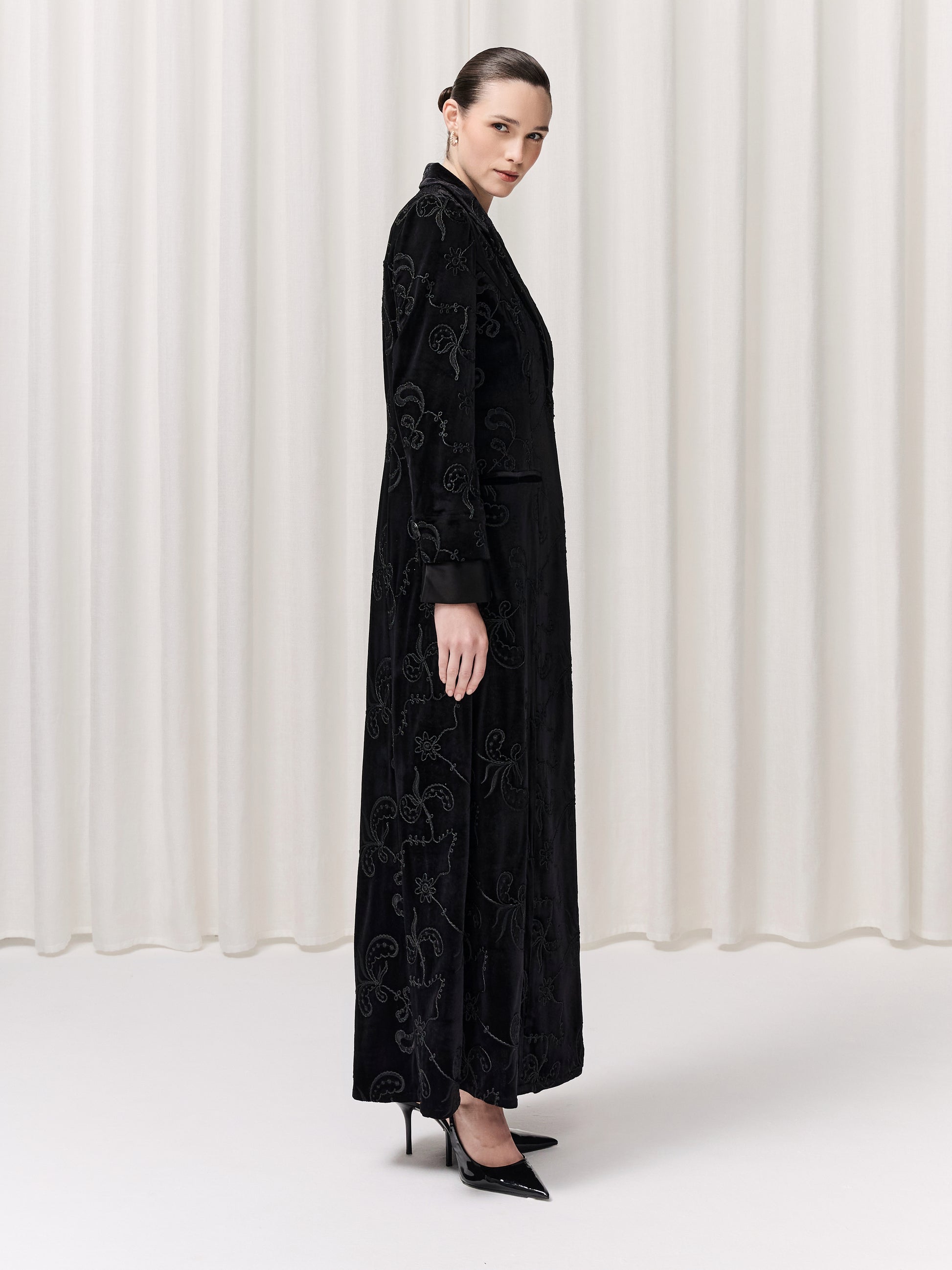 The Oreil abaya is a statement in texture and form, crafted from luxurious velvet and adorned with bold, abstract embroidery that flows gracefully across the fabric like strokes of modern art. Beneath it lies a black silk blouse fastened with KHAT’s new swirl buttons, adding a refined, polished finish. This abaya has two leg slits for movement. Paired with a matching sheila, Oreil balances strength and softness, art and elegance.