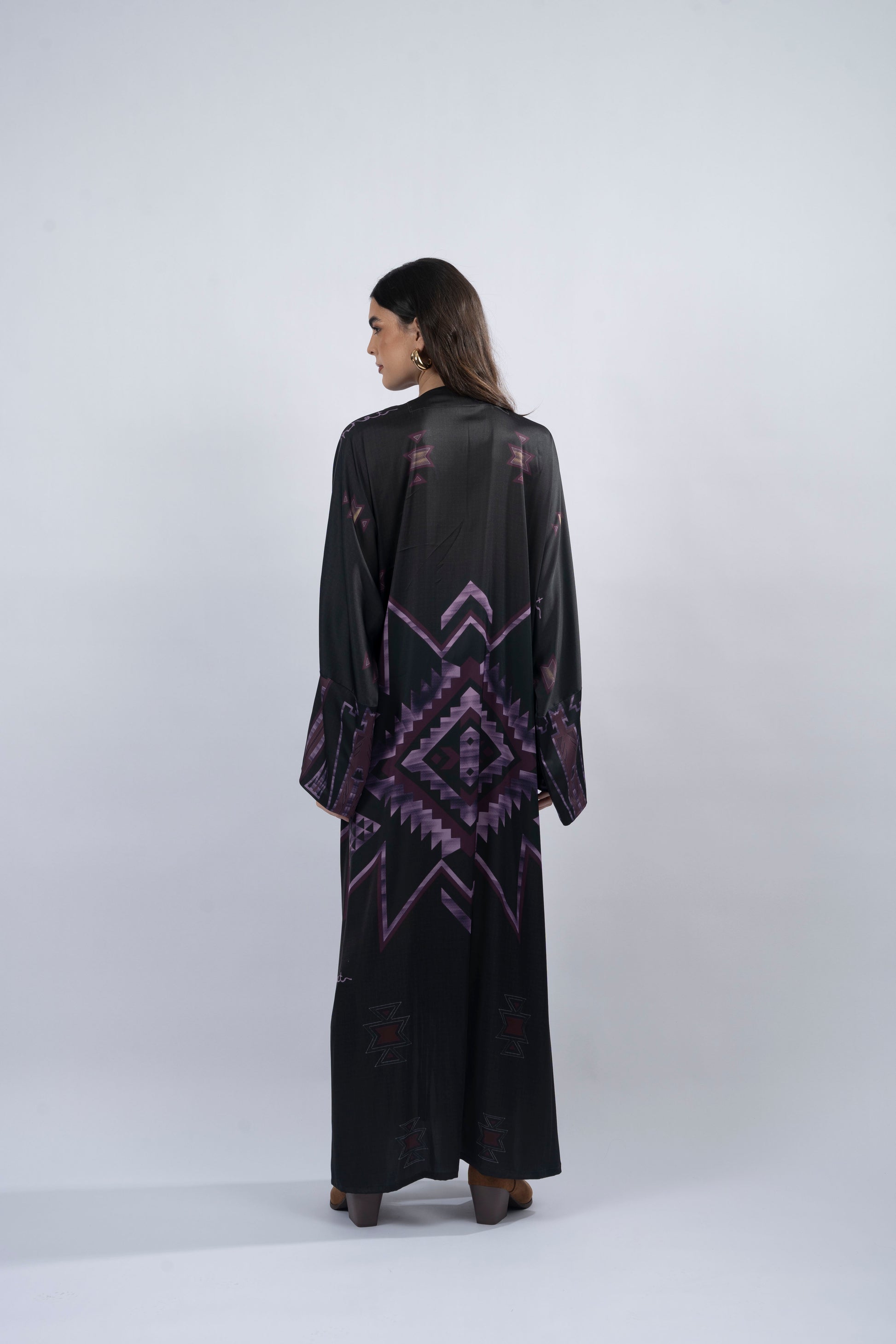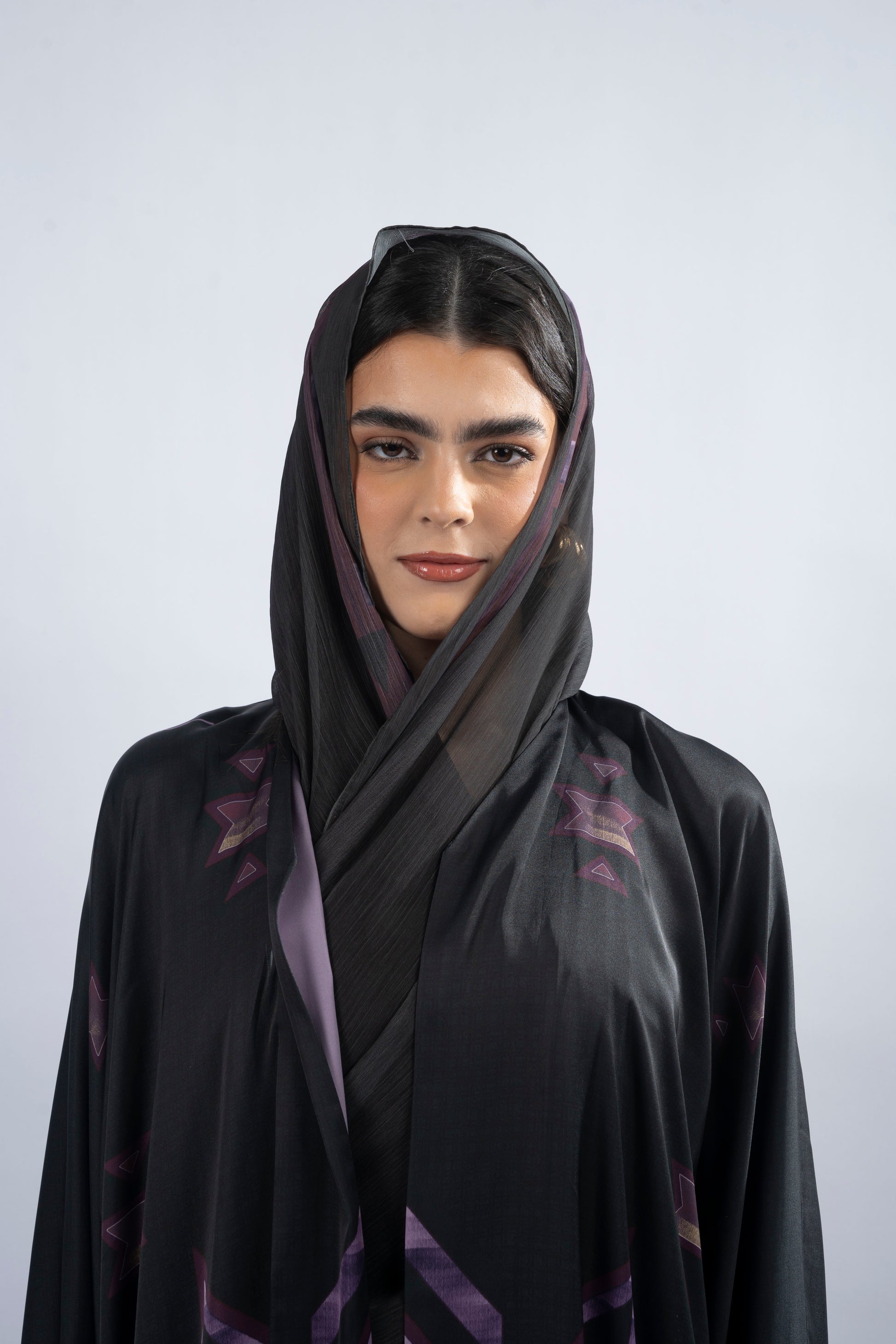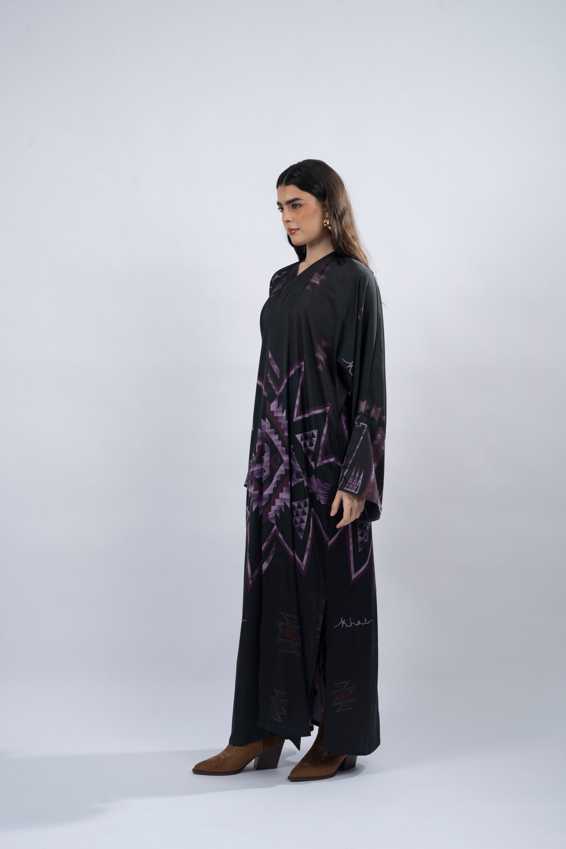 Its printed silk fabric glows with warmth, while the flowing T-cut silhouette and side slits create effortless movement. The Sakari abaya, translating to ‘sweet,’ is a radiant expression of charm and vibrant energy. Designed for those who embrace joy and creativity, it is finished with a delicate crinkle chiffon scarf for a touch of graceful sophistication.