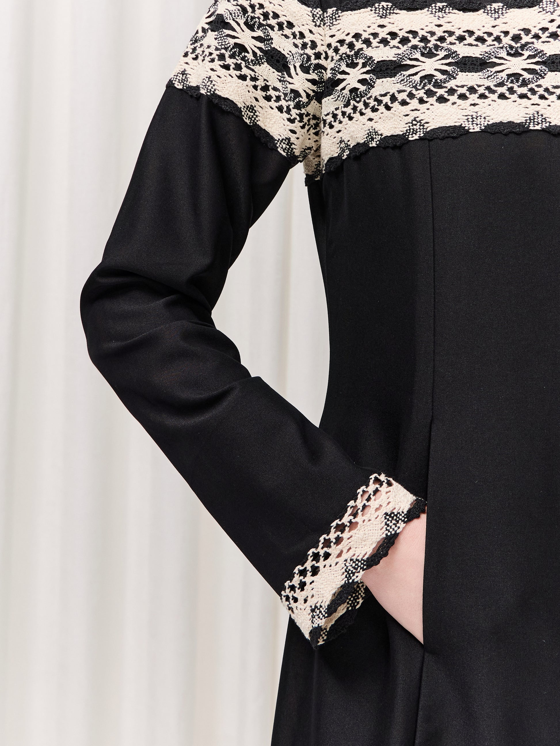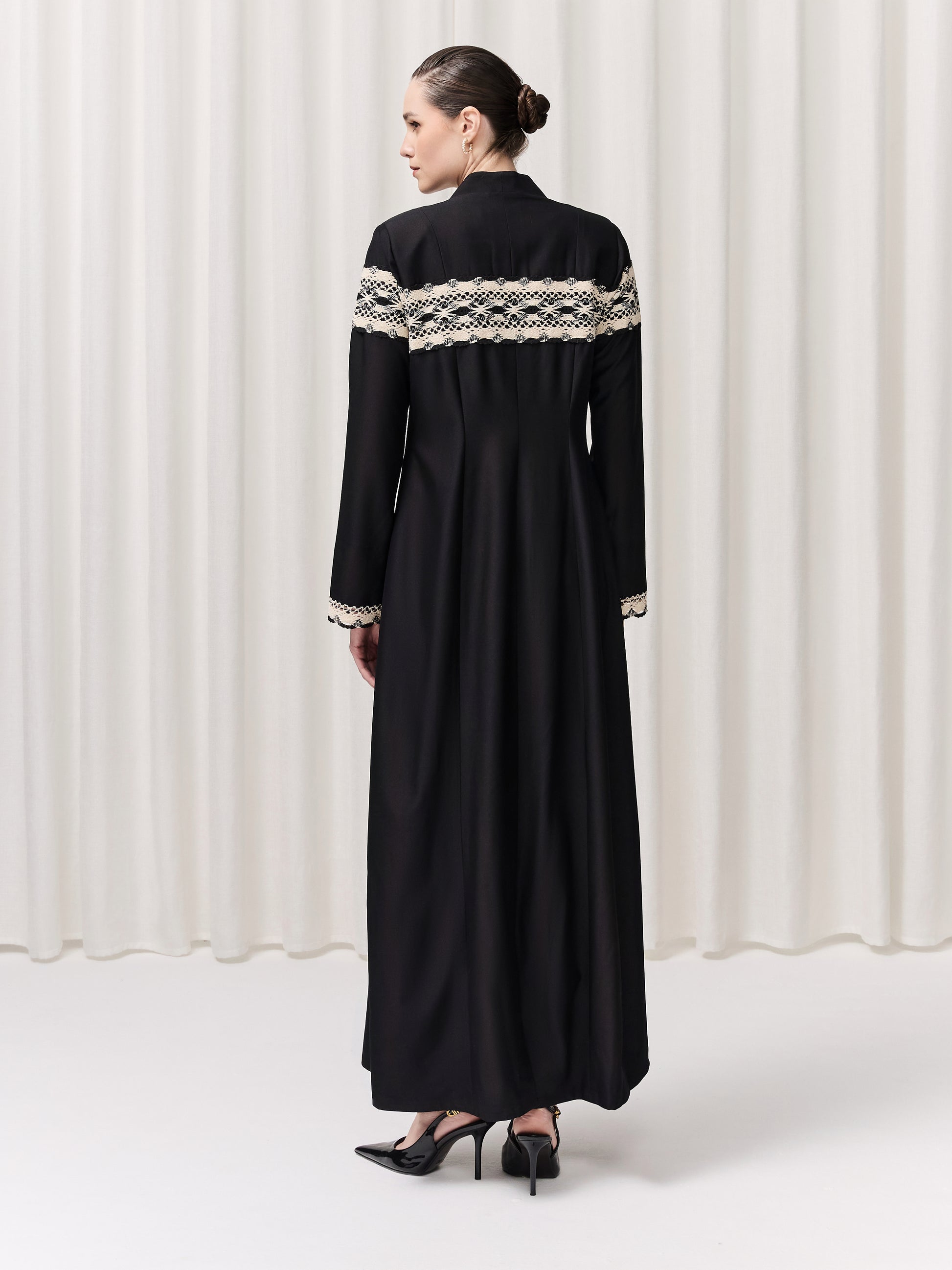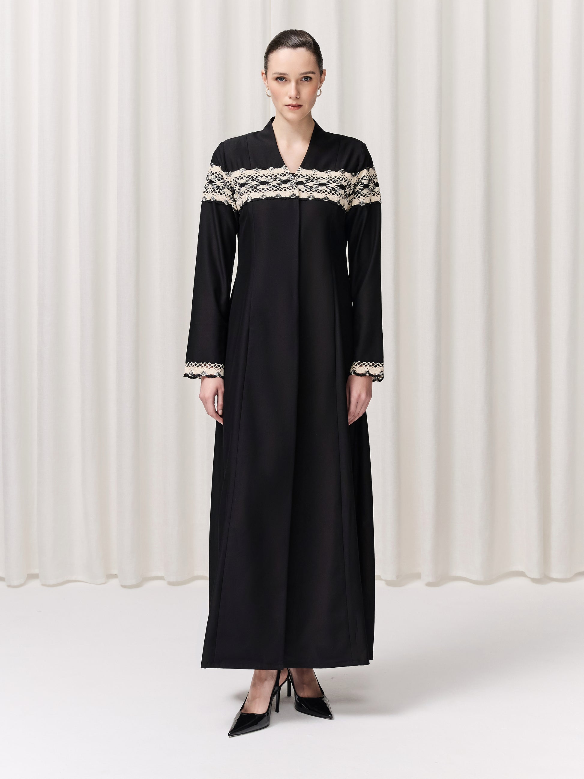 The Serin abaya, named after the serene and graceful serin bird, is an ode to timeless simplicity and refined elegance. Crafted from black crepe, it features delicate crochet detailing along the chest and sleeve cuffs, adding texture and grace to its minimalist silhouette. This abaya has two leg slits for movement. Designed as an elevated essential, it