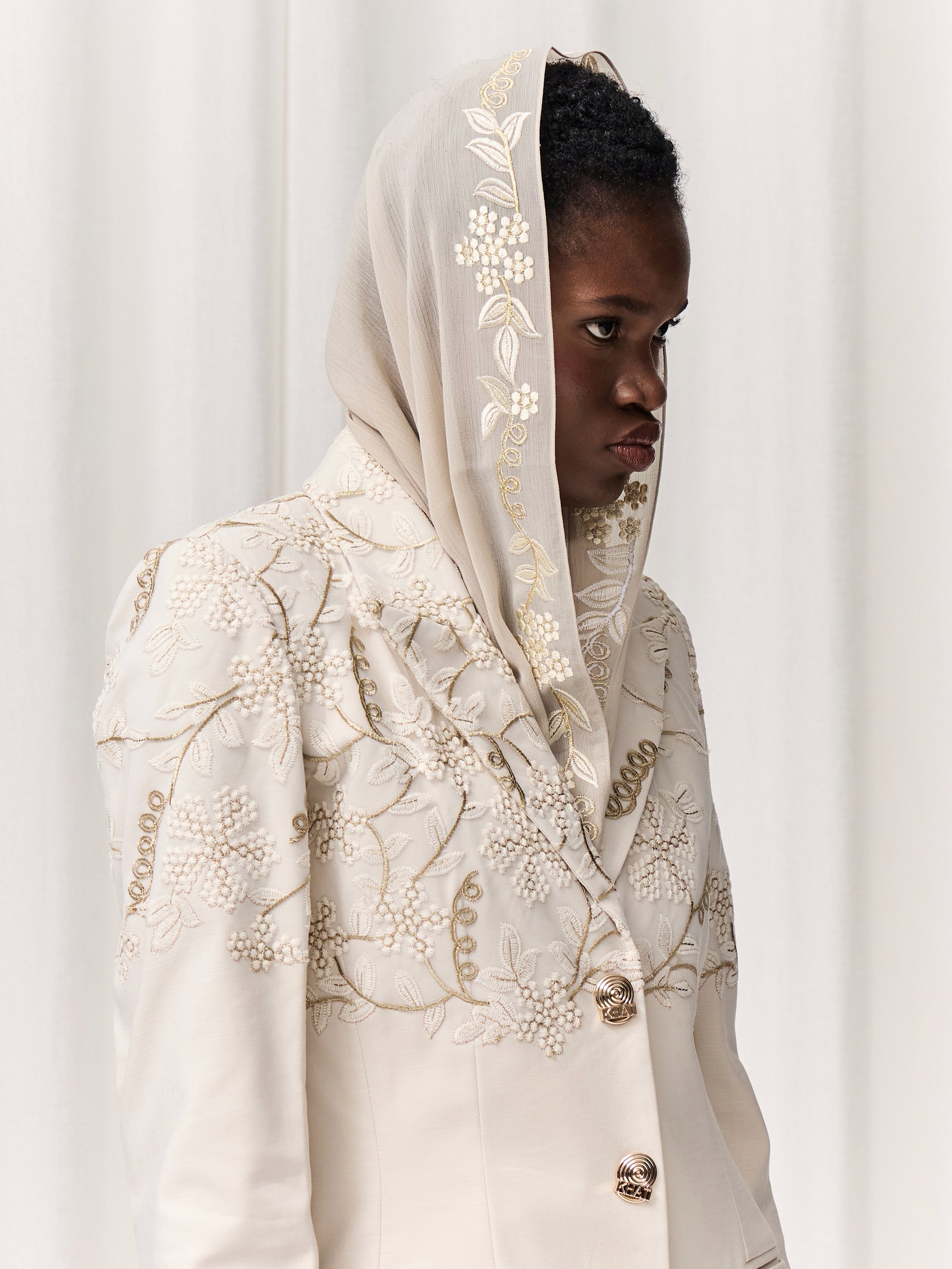Graceful and refined, the Swan abaya reimagines the blazer cut in soft off-white, adorned with exquisite gold lace embroidery that evokes a sense of natural beauty and symphony. Named swan to highlight the exquisite natural beauty this abaya has. This abaya has two leg slits for movement. Shoulder pads and two pockets maintain a polished silhouette, while