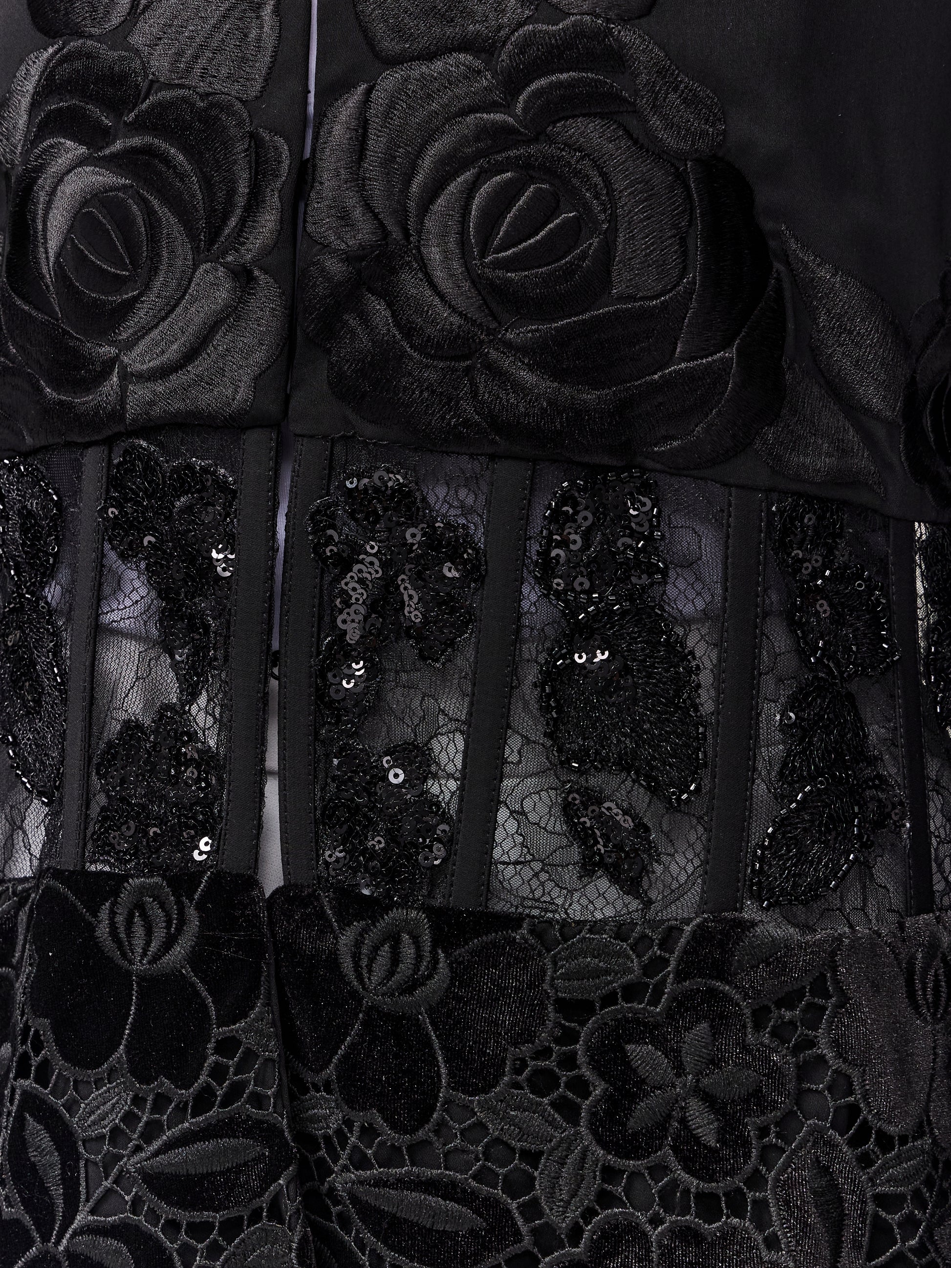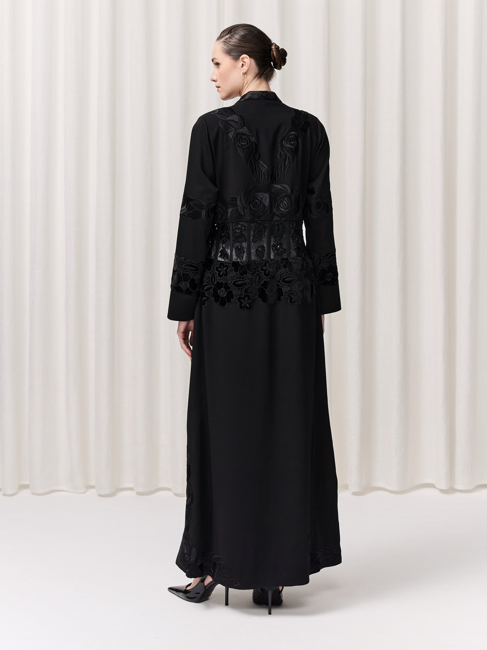 Continuing the signature KHAT corset style, the Sylvia abaya blends structure with femininity. Velvet-embroidered floral lace Details the neckline, waist, sleeves, and slits, adding a romantic and sophisticated touch. A fitted corset enhances the waistline, creating a graceful, sculpted silhouette that moves beautifully while highlighting feminine elegance.