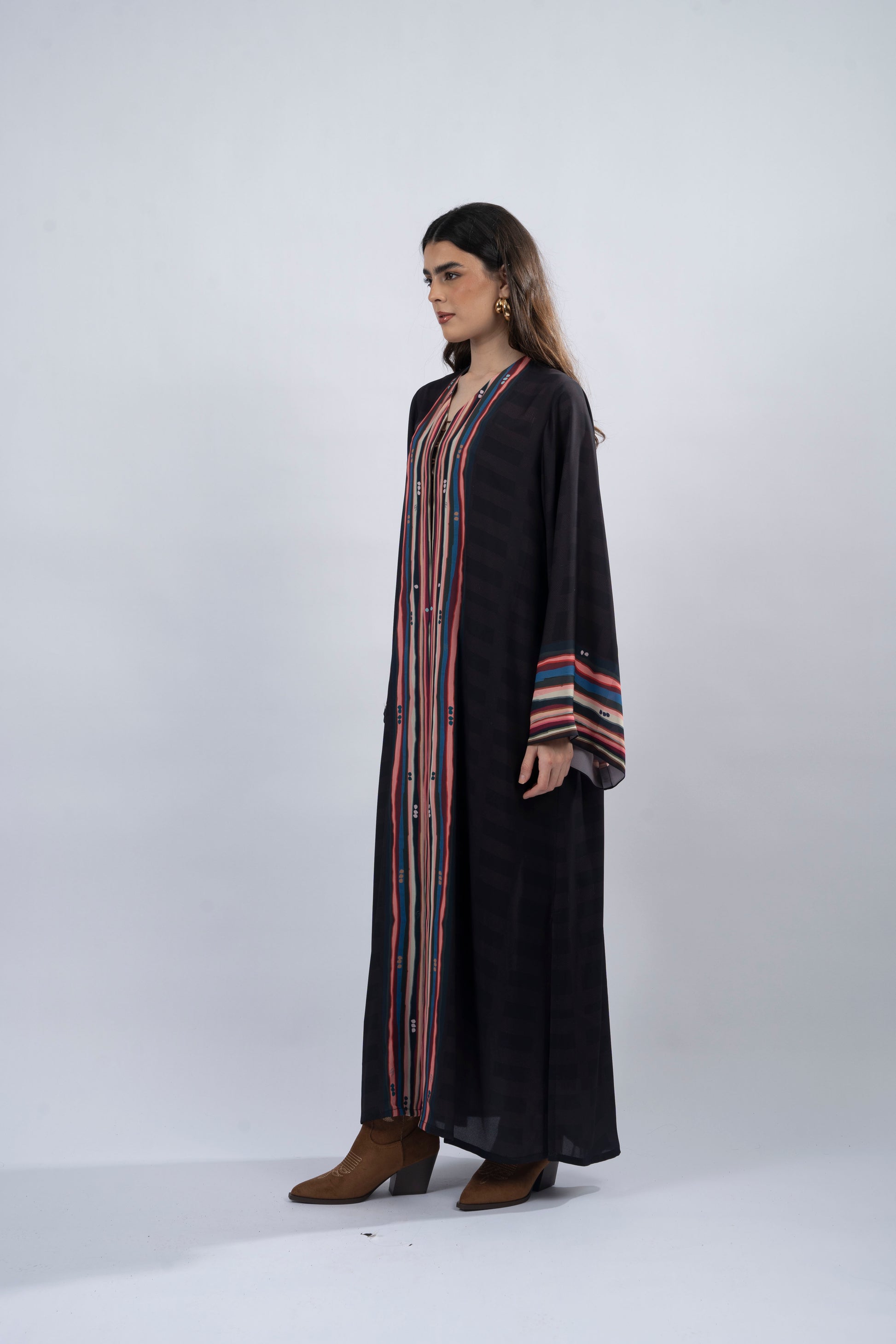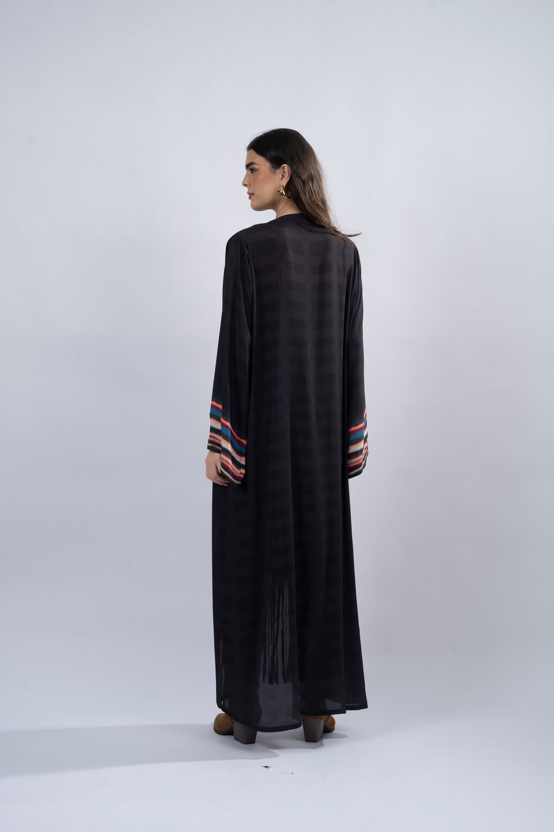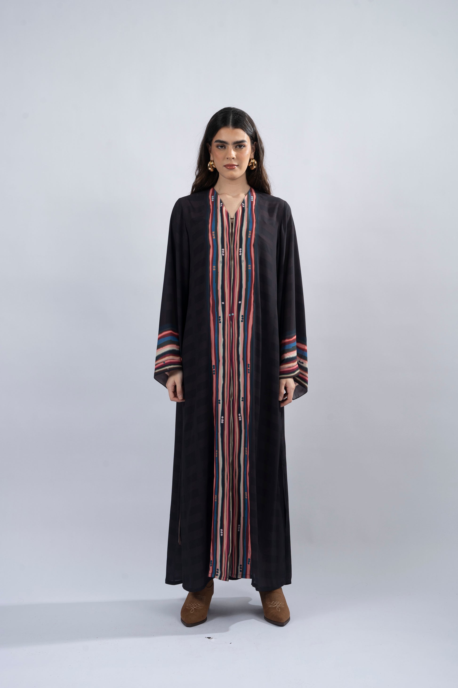 The Tala abaya embodies independence and strength, a tribute to the untamed beauty of the wild. Its bold gingham body contrasts with a striking, colourful border, creating a dynamic balance of structure and movement—like a song in motion. Crafted from lightweight crepe printed fabric with a straight-cut silhouette and side slits, it offers effortless elegance, complete with a flowing crinkle chiffon scarf.