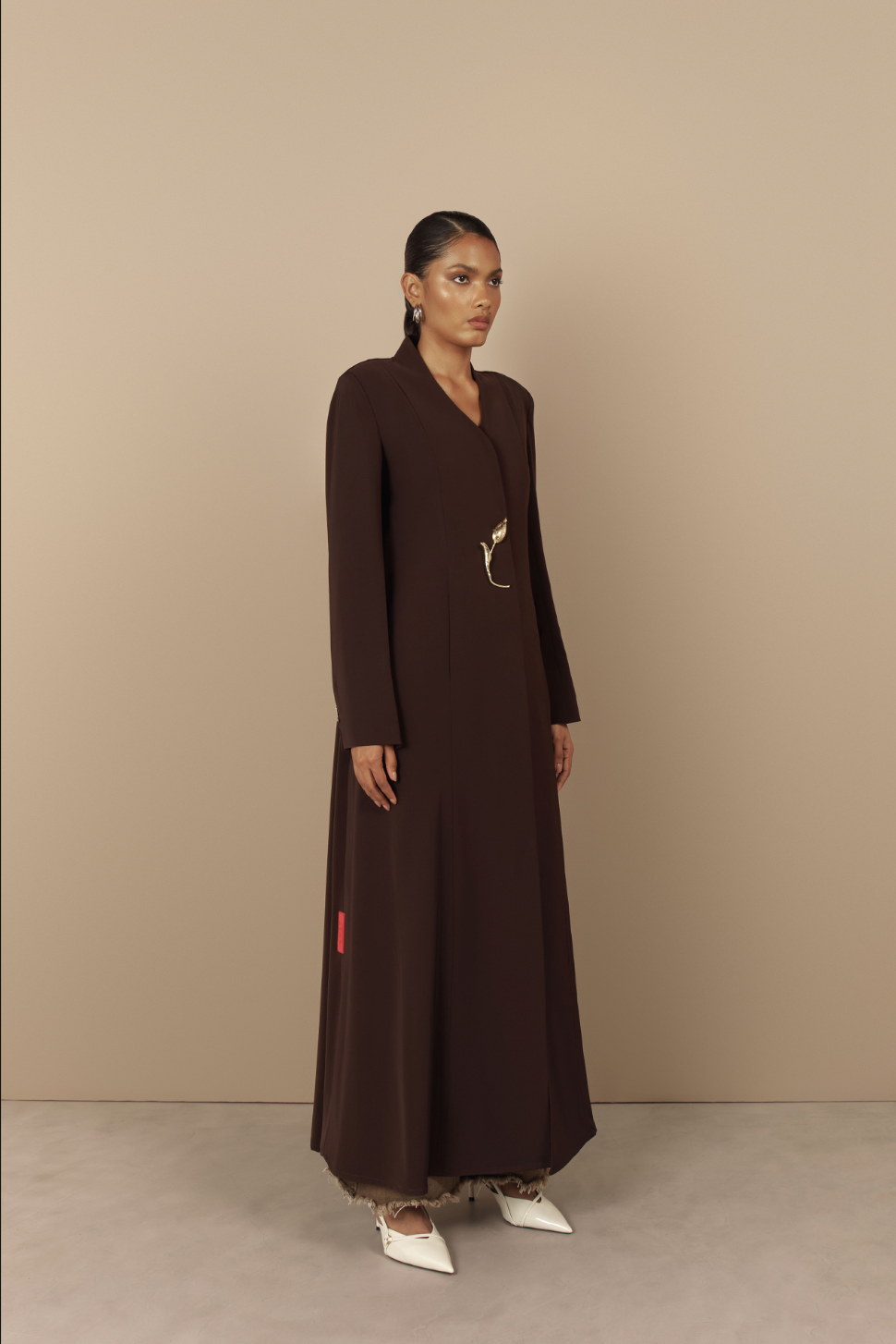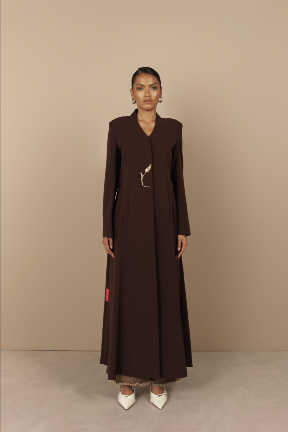 Tulip Serene is crafted from lightweight brown crêpe, Tulip Serene blends ease with refinement. Its sharp shoulder pads and side-slit cut create a fluid, flattering shape that moves effortlessly with you. The look is anchored by the signature Khat tulip brooch, a golden emblem inspired by the spirit of bloom and the essence of the Wild Serenity collection. Warm and polished, it brings a distinct charm to summer dressing.