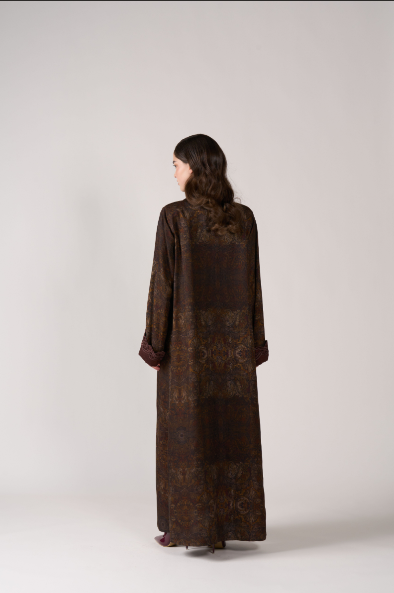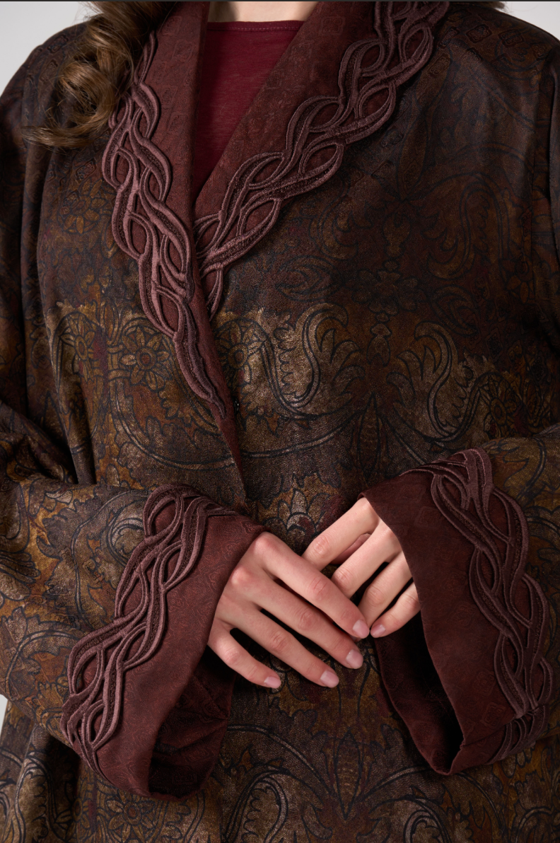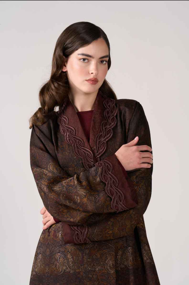soft, antique-like richness. Hand-made embroidered borders frame the collar and