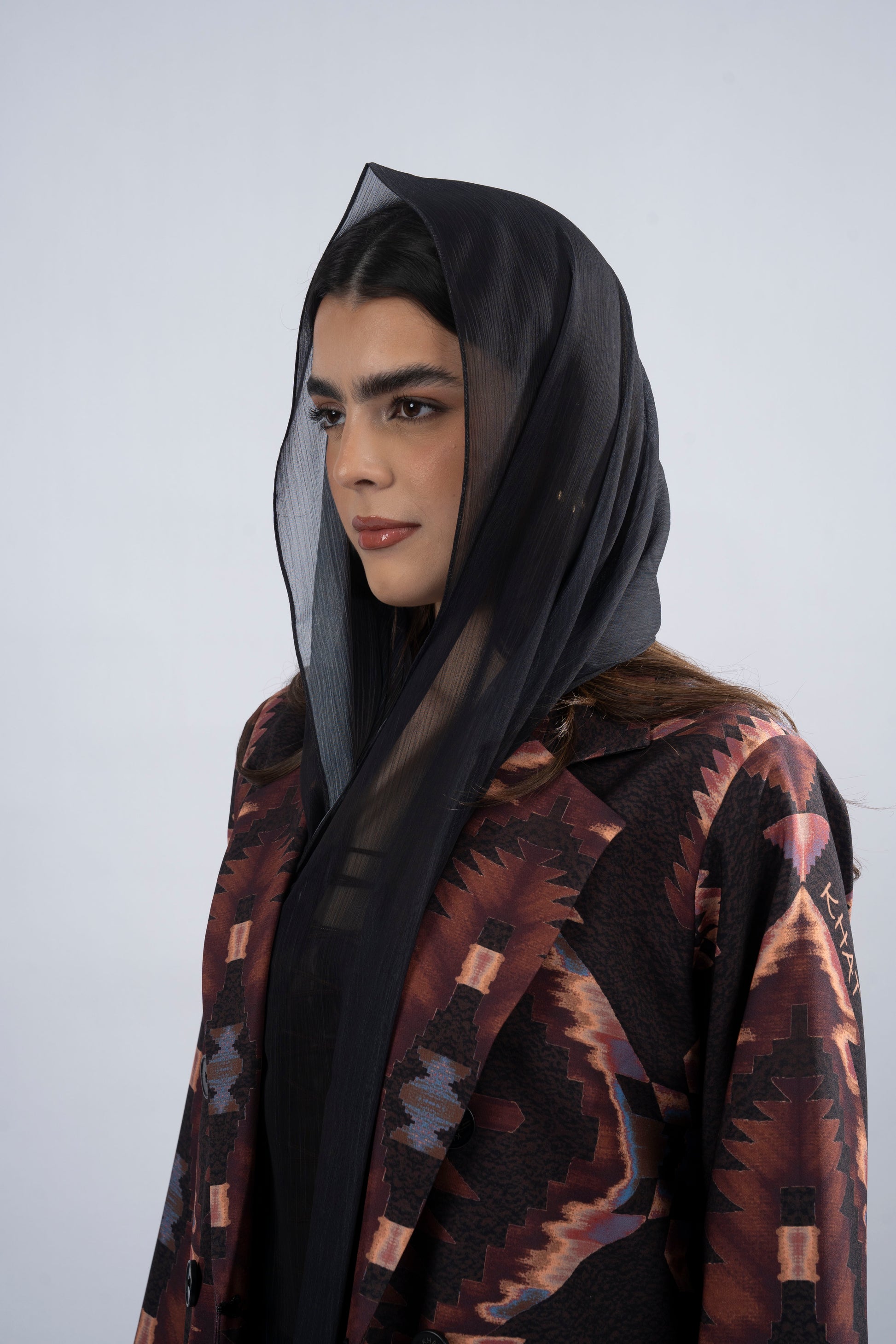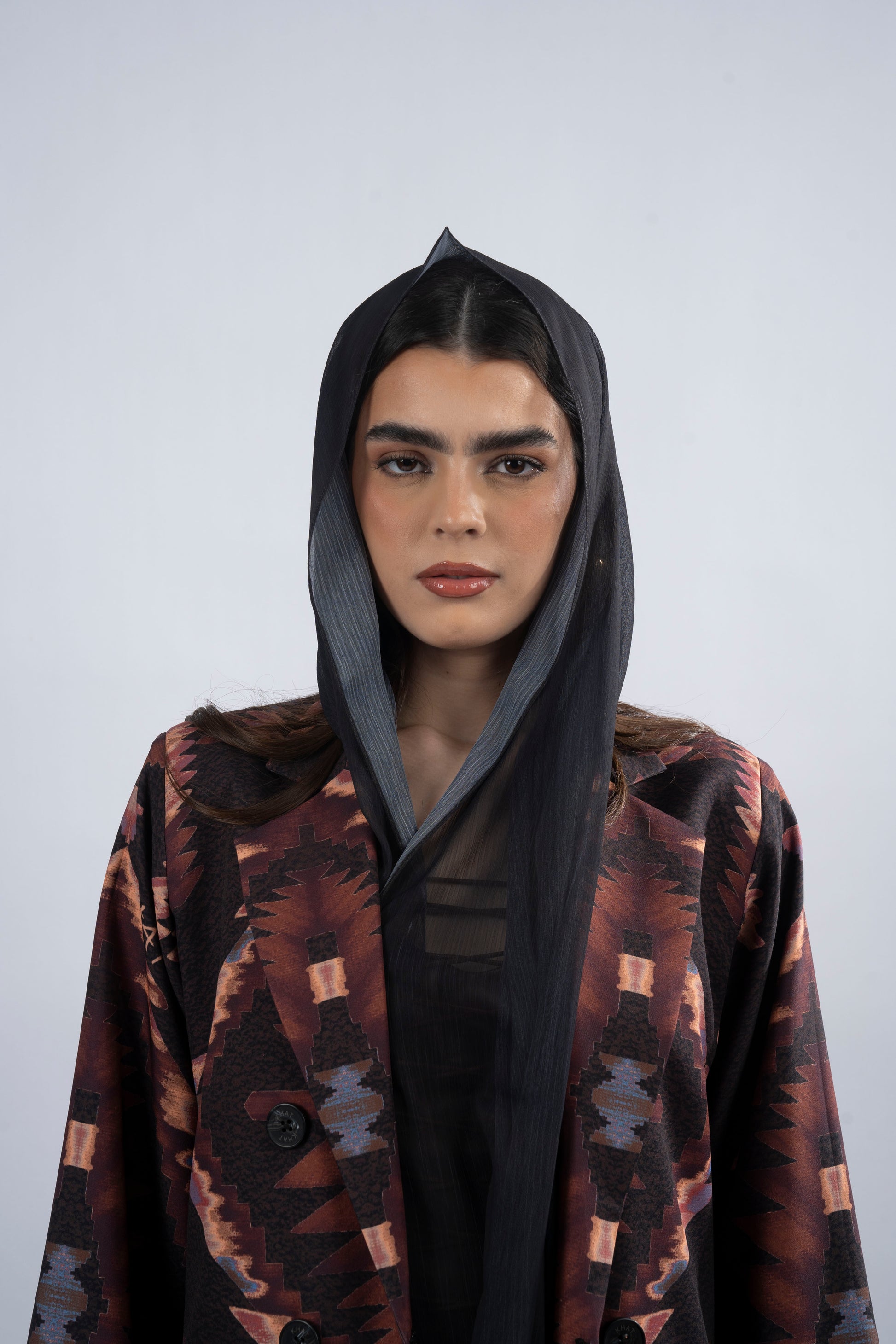 Waya is a striking formal blazer-cut abaya, crafted from luxurious cotton fabric and designed to mirror the unique style of the collection. The intricate Khat design is paired with a matching headscarf, adorned with the Khat logo and finished with crinkle chiffon fabric. Side slits and Khat logo buttons complete this powerful, sophisticated piece. With its bold patterns and rich textures, Waya celebrates strength and beauty, perfectly capturing the essence of individuality and confidence.