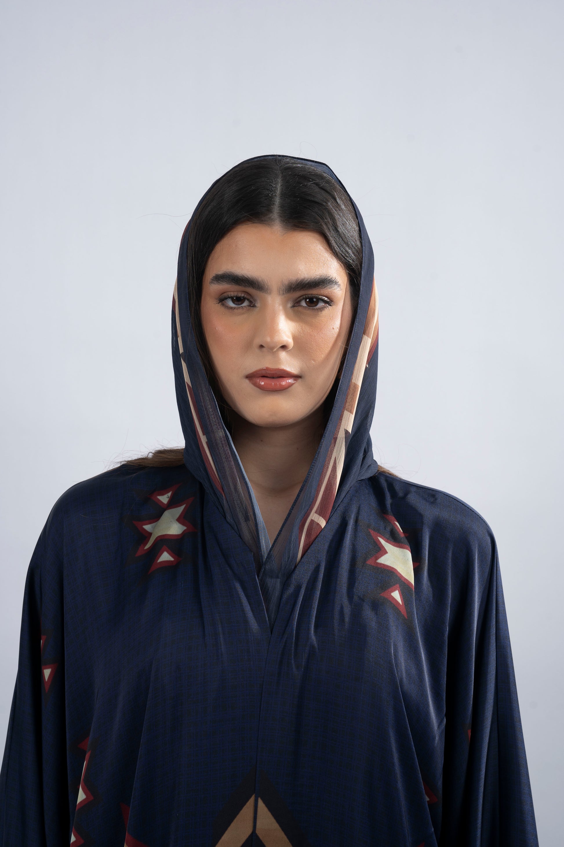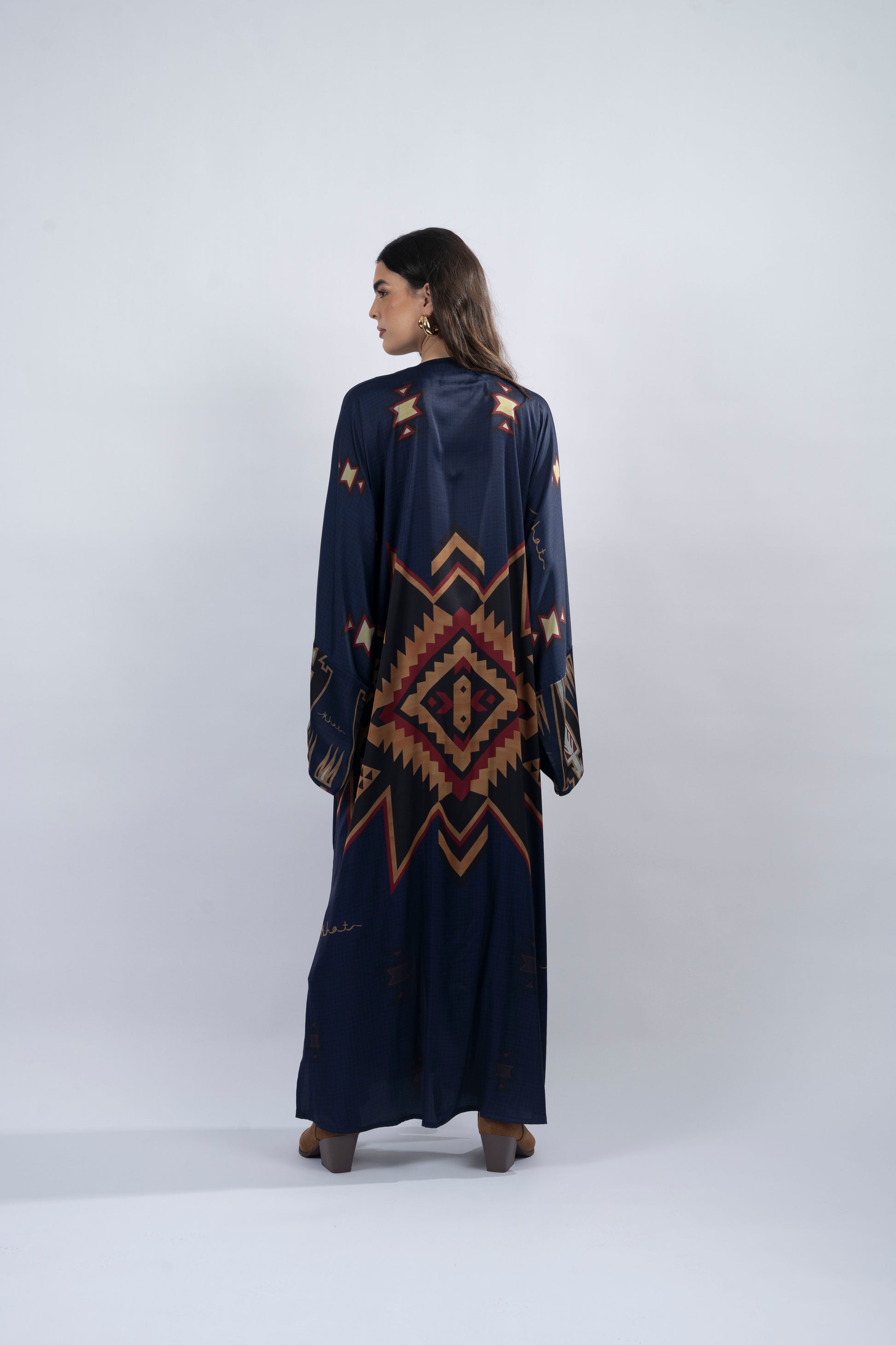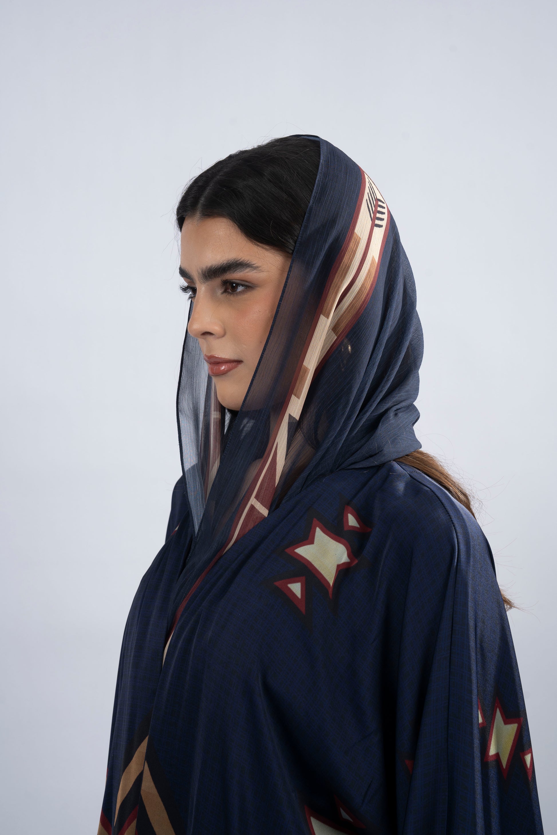 Yoki, named after the vibrant blue hues that symbolize 'rain' in Native American culture, brings a sense of renewal and freedom. This abaya is designed with a fresh and airy aesthetic, offering a feeling of lightness and grace. The T-cut silhouette enhances its relaxed fit, while the printed silk fabric adds a luxurious touch. Side slits provide ease of movement, and the printed chiffon scarf complements the piece with a subtle, flowing elegance. Yoki is perfect for those who seek a blend of serenity and strength in their style.