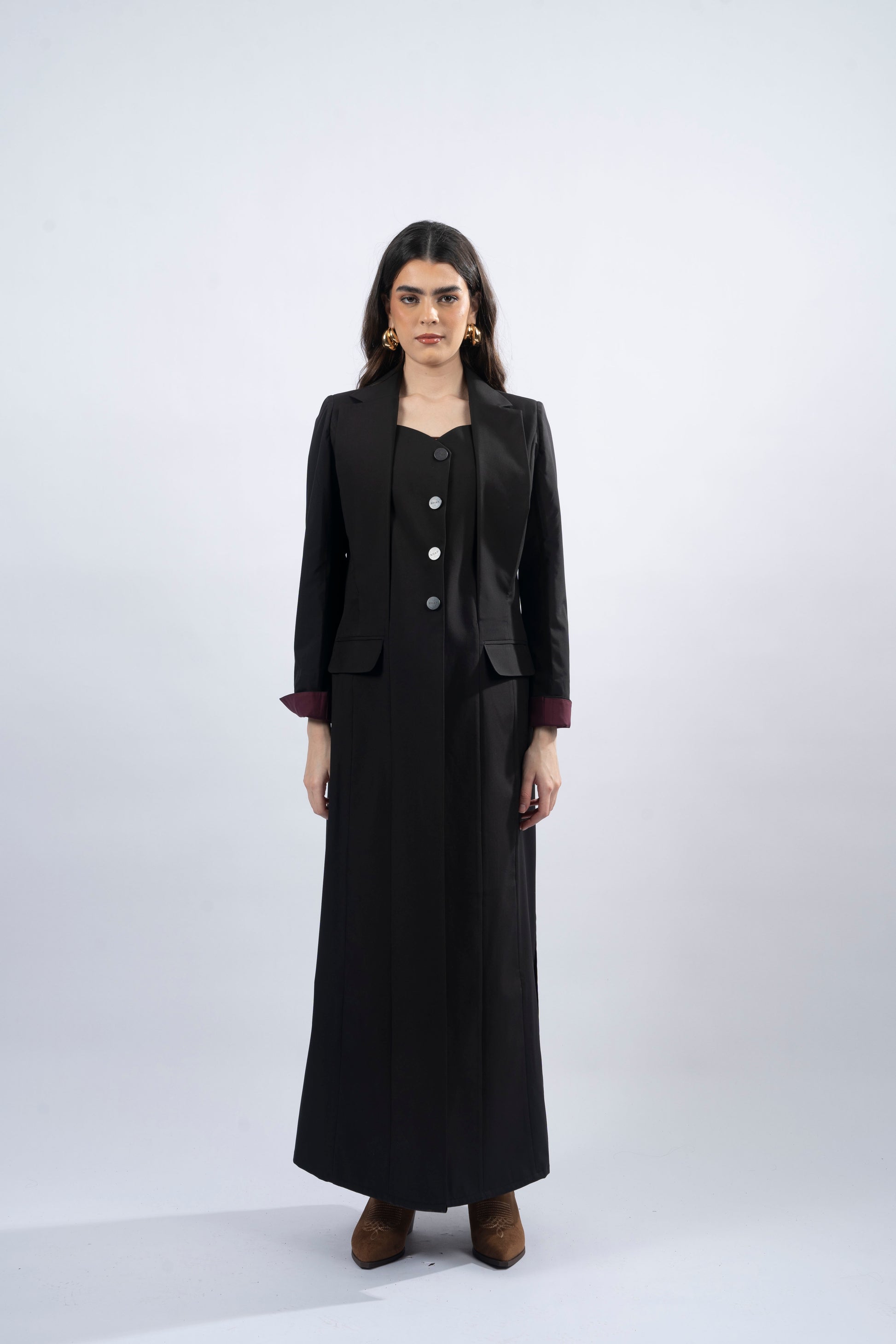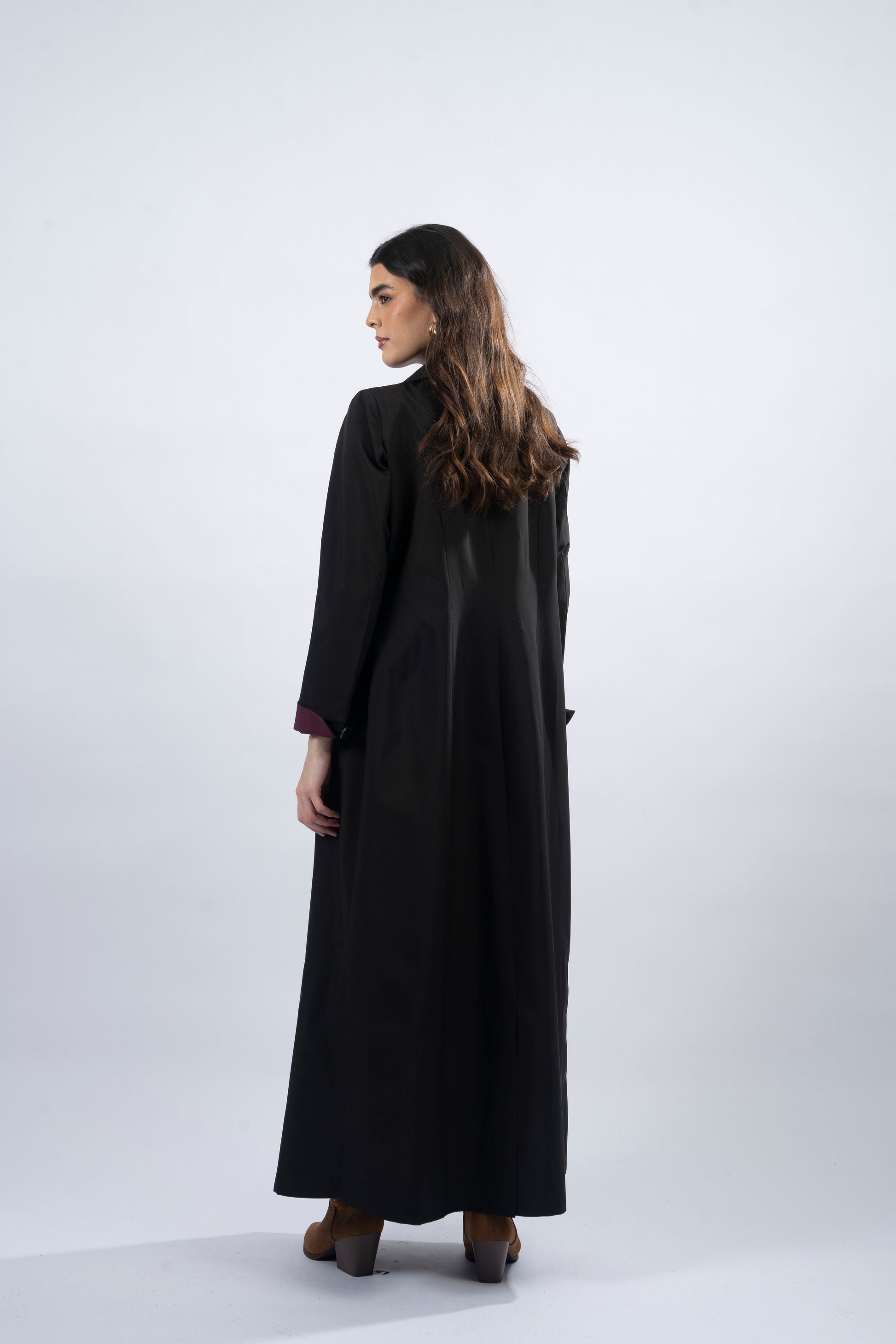 Zuni, meaning "beauty," exudes bold energy and quiet strength. With its striking blazer cut and luxurious trench coat fabric in black with a maroon interior, this abaya effortlessly combines simplicity with power. The shoulder pads and side slits provide a tailored, flattering silhouette, while the Khat logo buttons add a touch of sophistication. The pockets offer practicality, and the unique cuff design with its contrasting maroon lining completes the look. Zuni is a versatile, empowering piece that brings confidence and courage to every occasion.